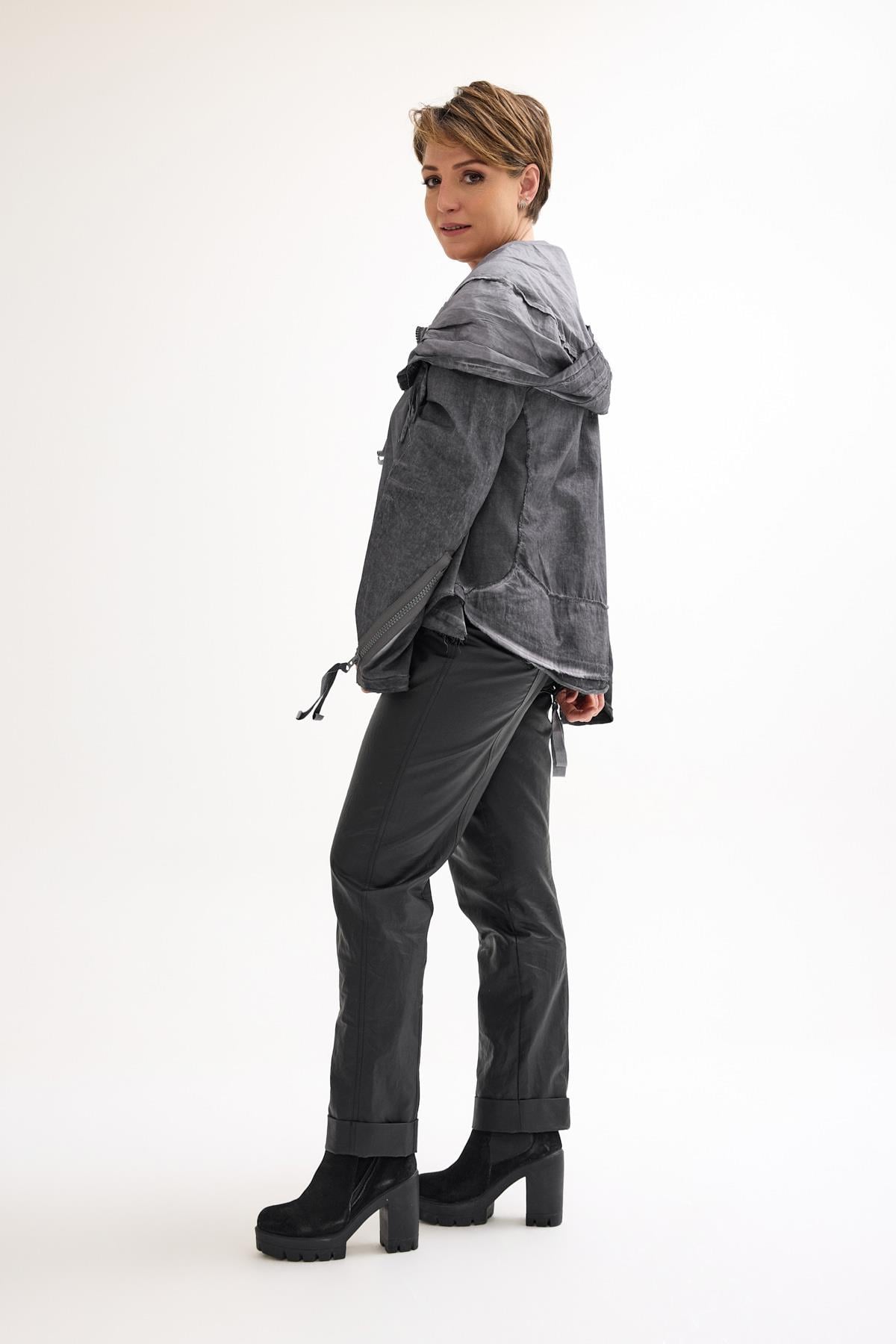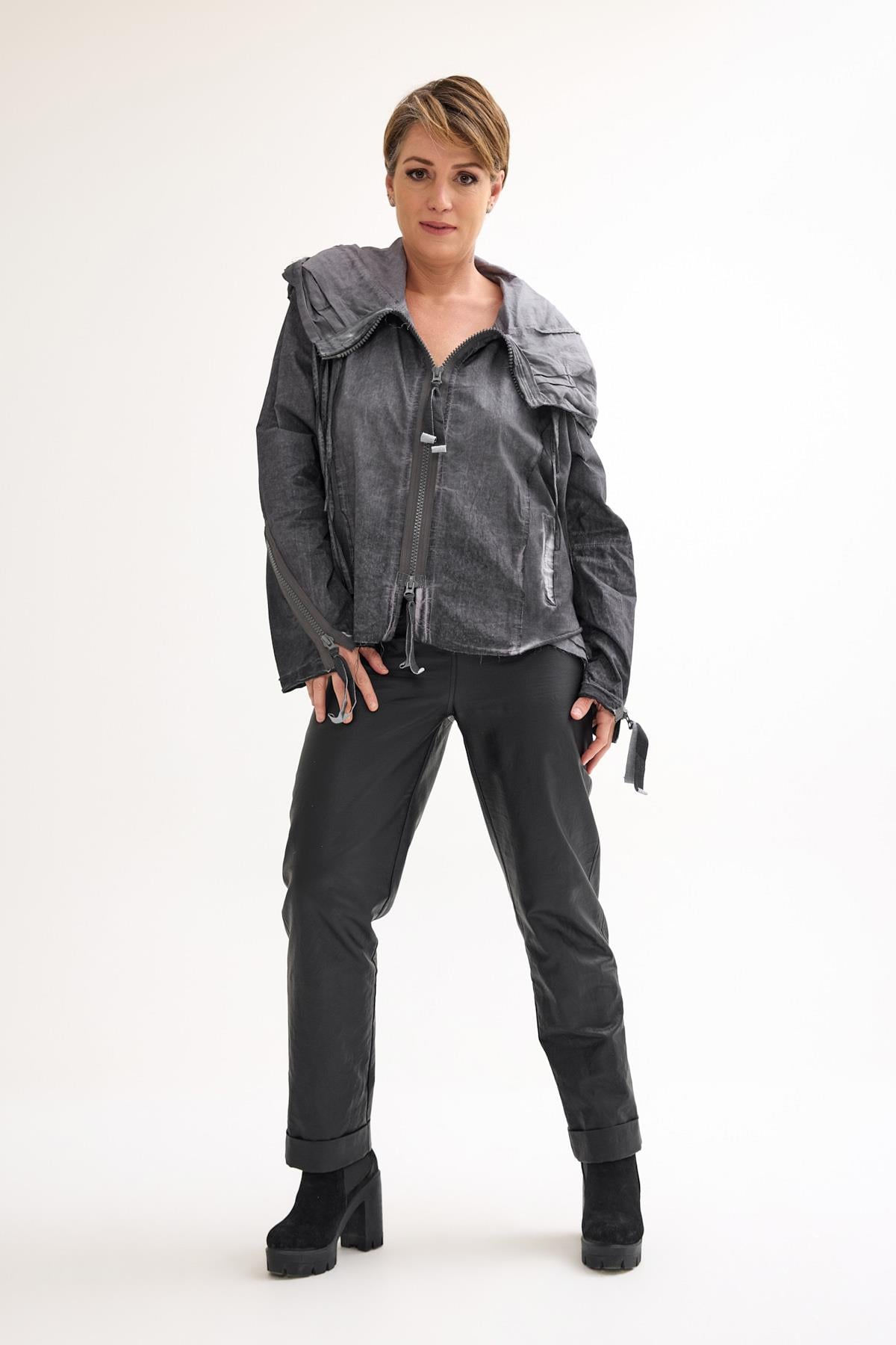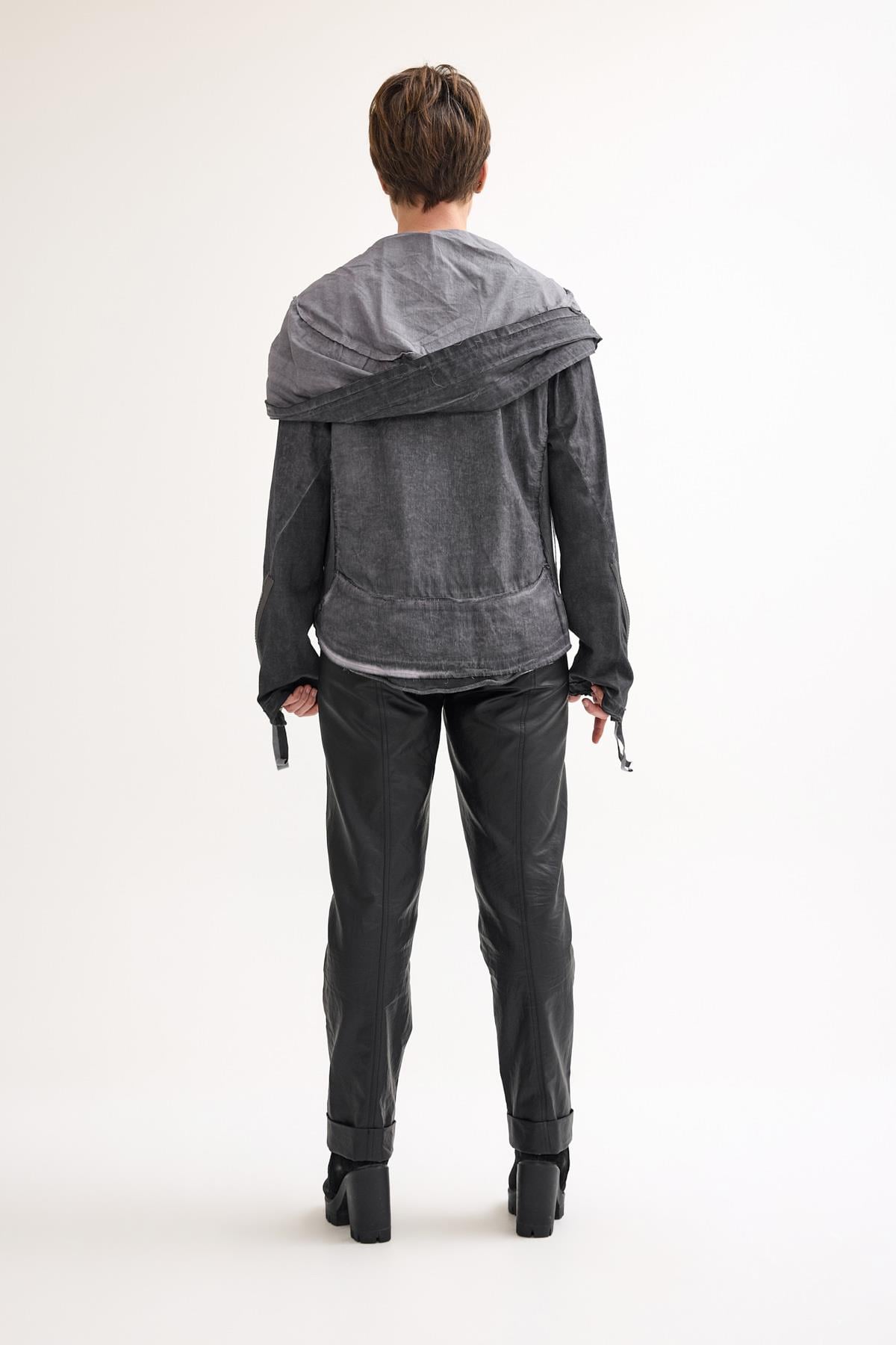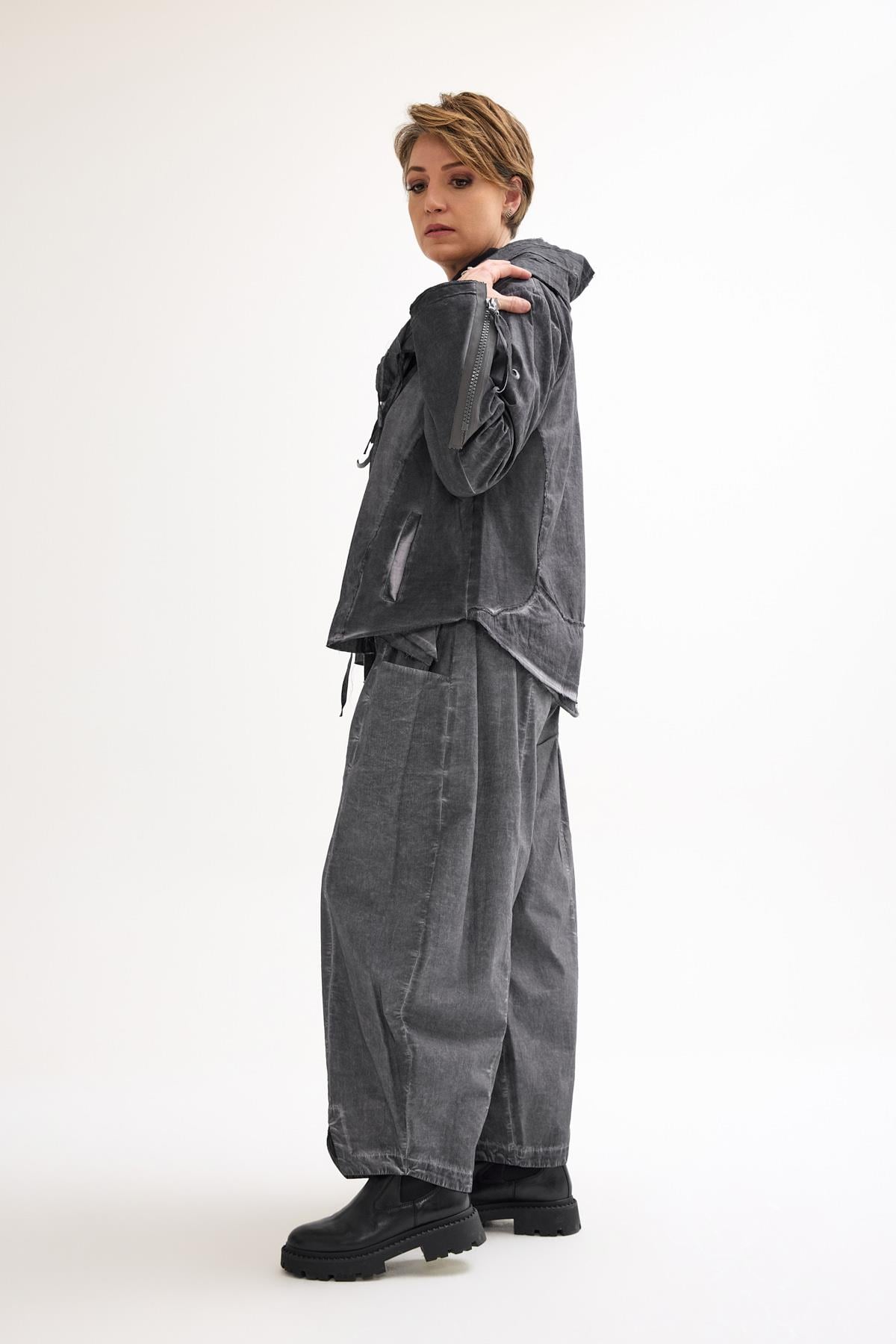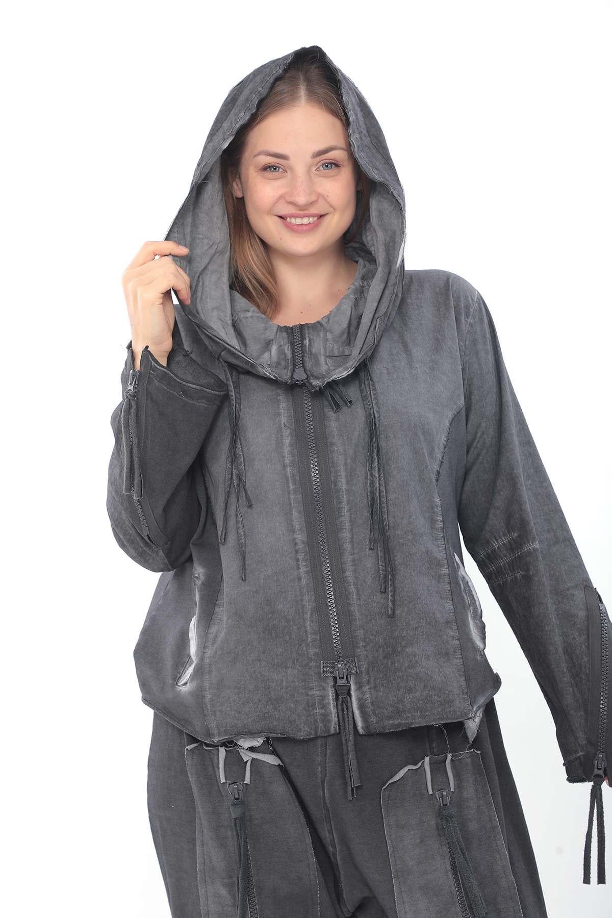 Oversized Cotton Jacket with Double-Sided Zipper, Side Pockets, and Hood A casual cotton jacket featuring a double-sided front zipper, side pockets, zippered cuffs, and a roomy hood, designed for comfort and versatile everyday wear.