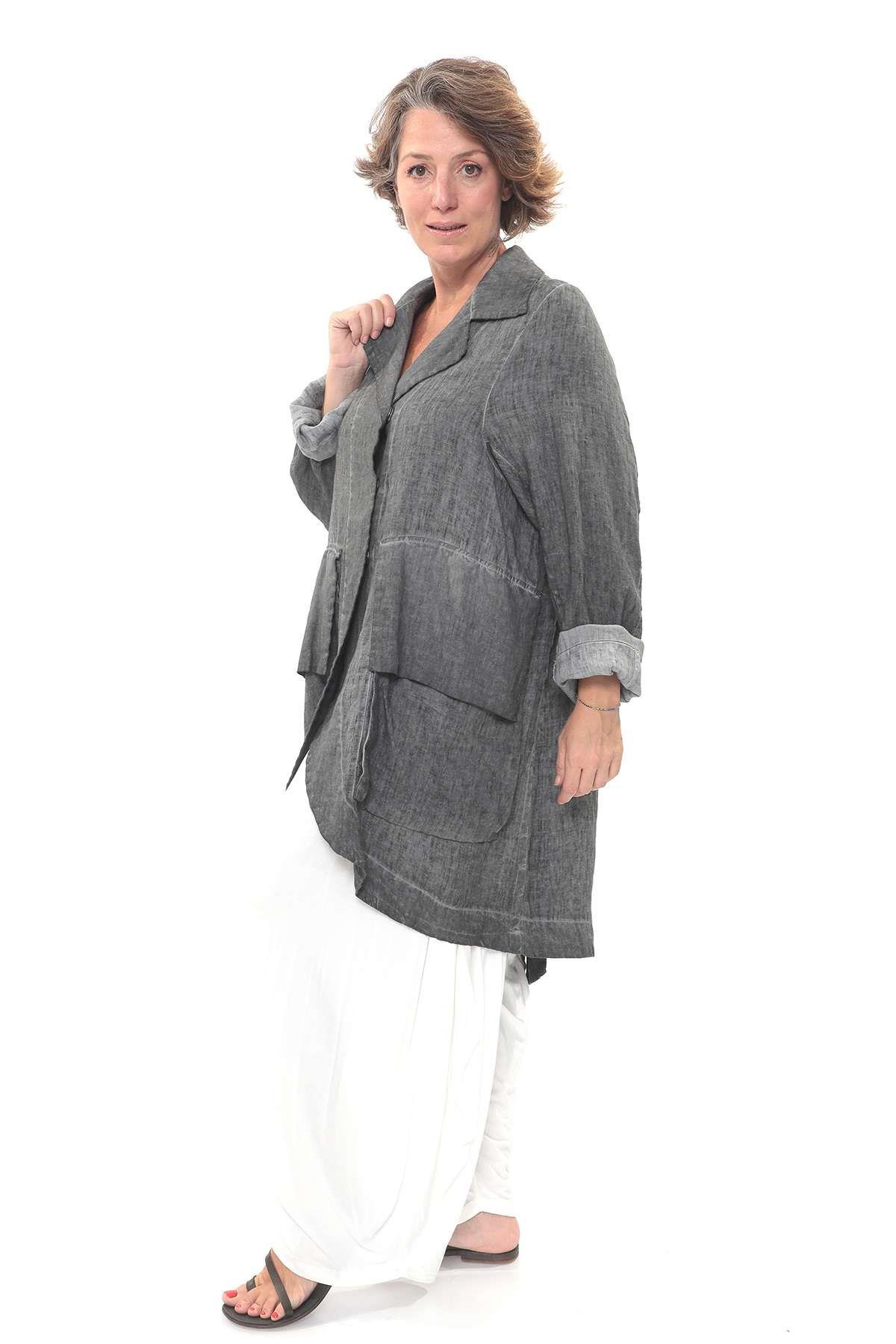 This avant-garde linen jacket features exaggerated oversized front pockets and long sleeves, designed in a relaxed silhouette that balances functionality with bold, minimalist style.