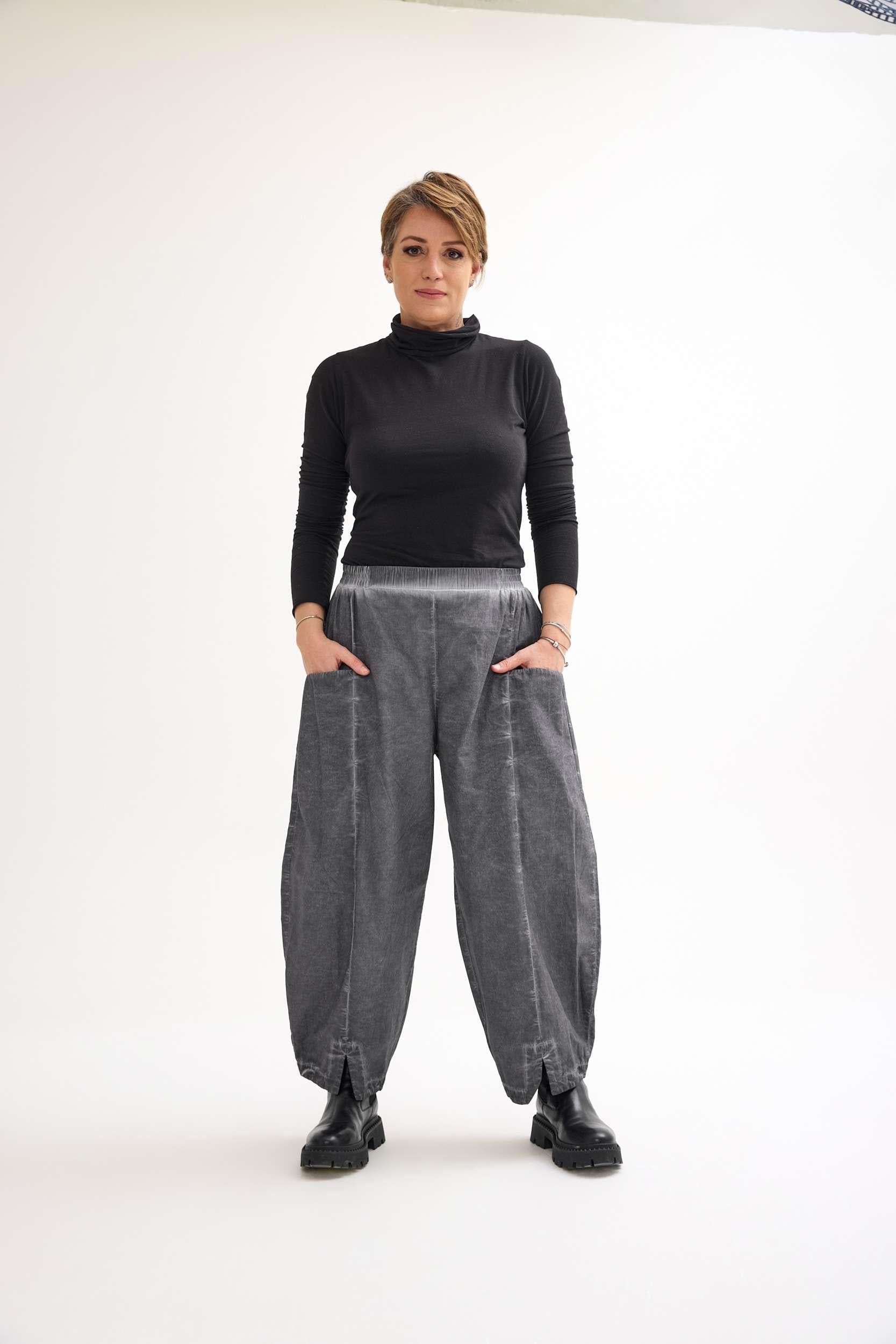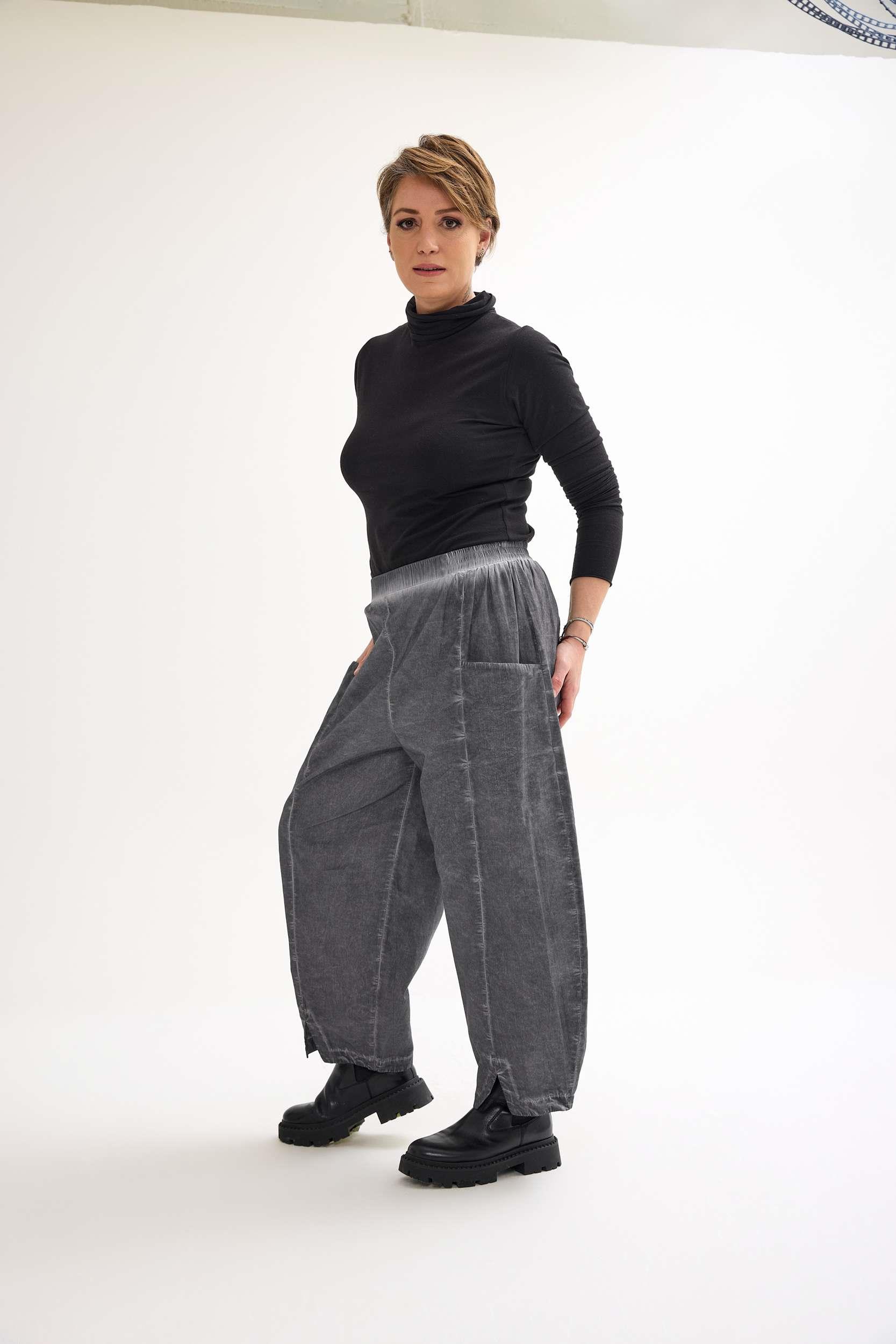 Viscose trousers with an elastic waistband, side pockets, front-slit hem detail, and a special washed finish. A stylish and unique avant-garde design that combines comfort with modern elegance – perfect for wholesale buyers and retail fashion boutiques