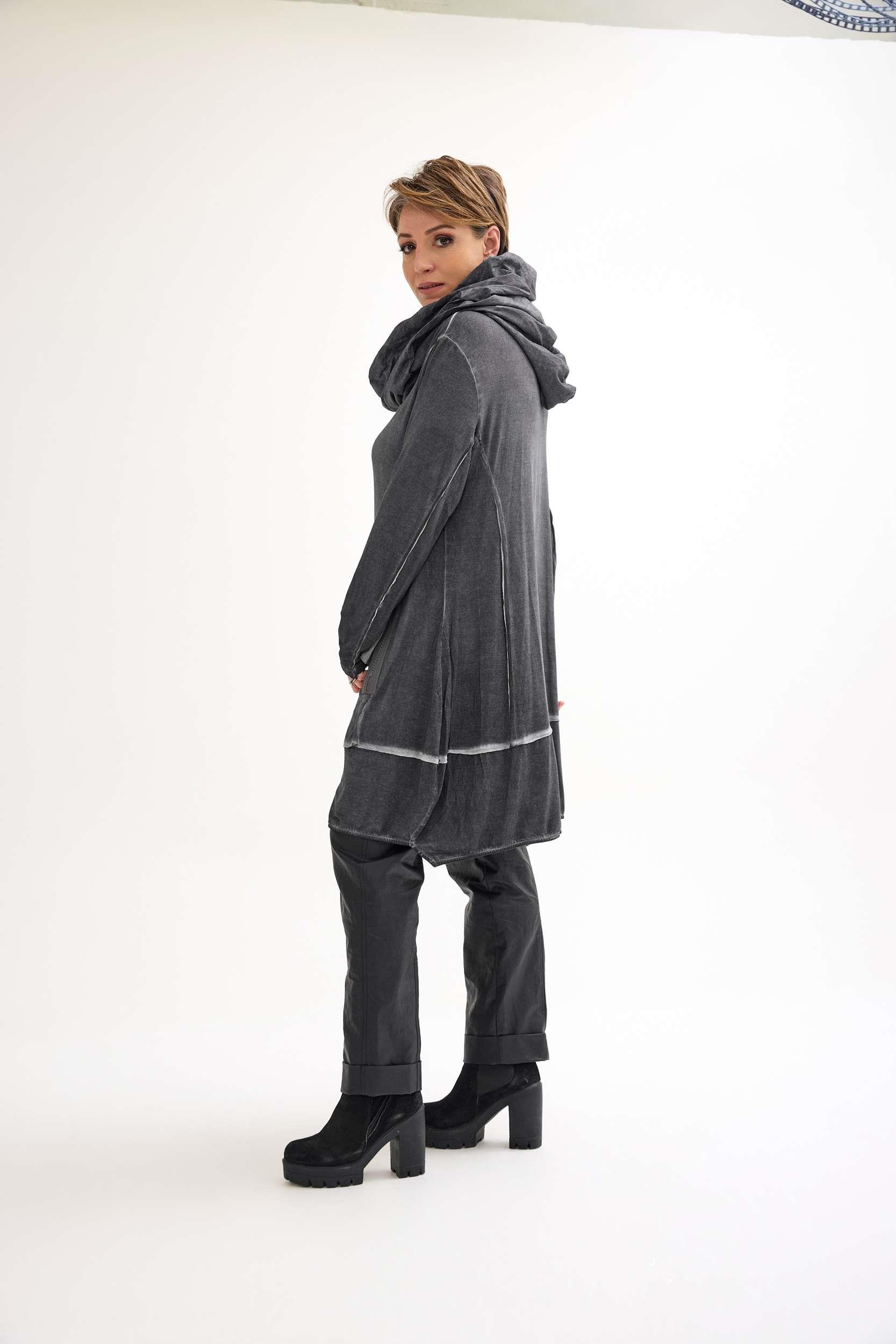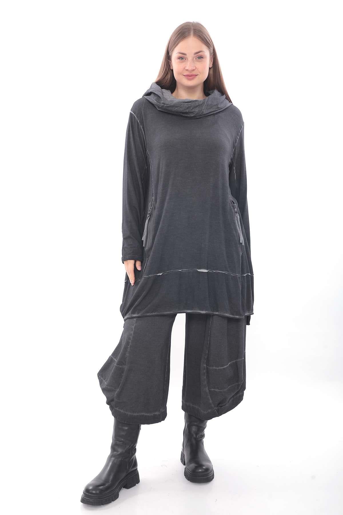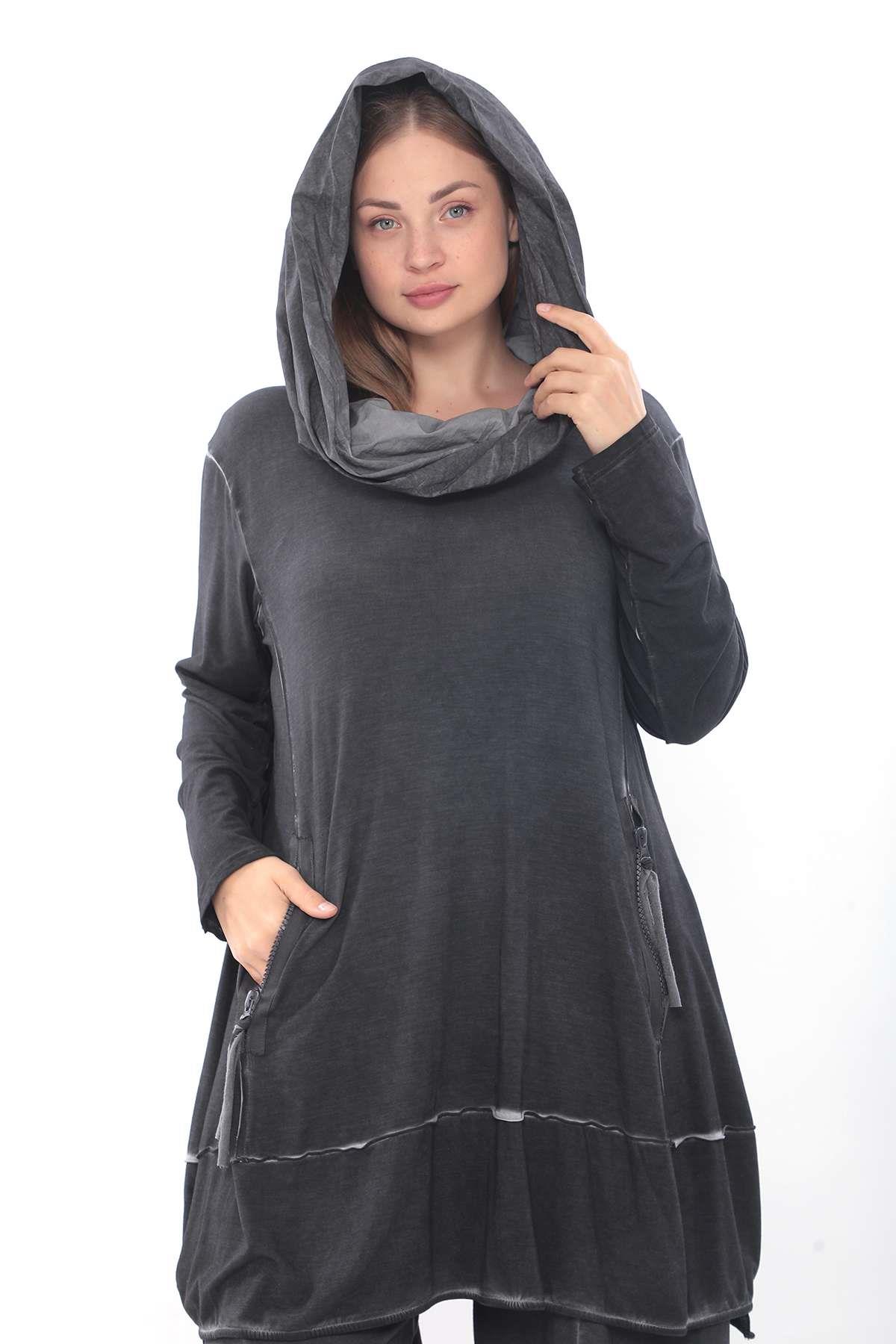 Oversized Viscose Tunic with Hood, Zippered Pockets, and Long Sleeves A relaxed-fit viscose tunic featuring a roomy hood, bold zippered pockets, and long sleeves, designed in an oversized silhouette for versatile and comfortable everyday wear.