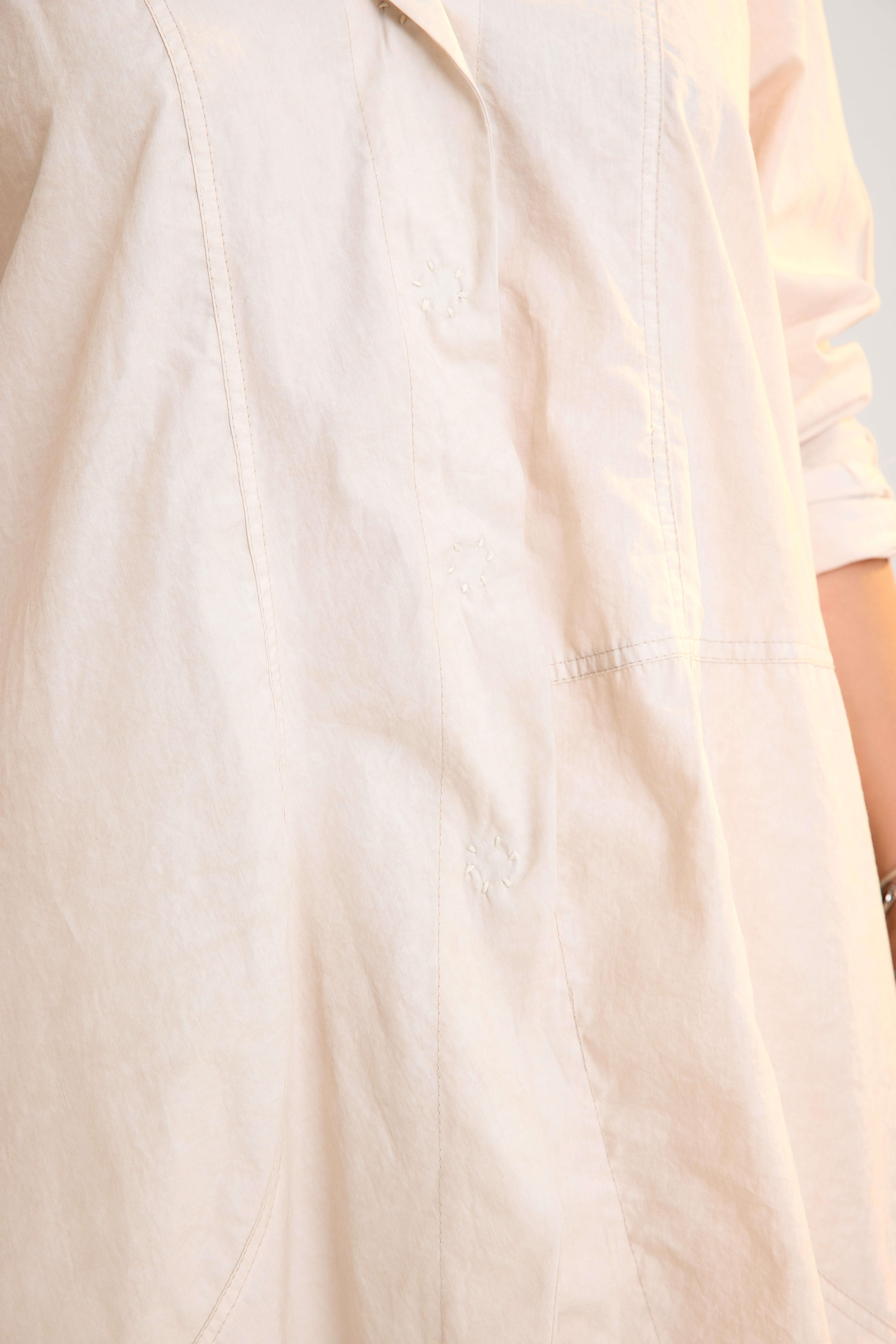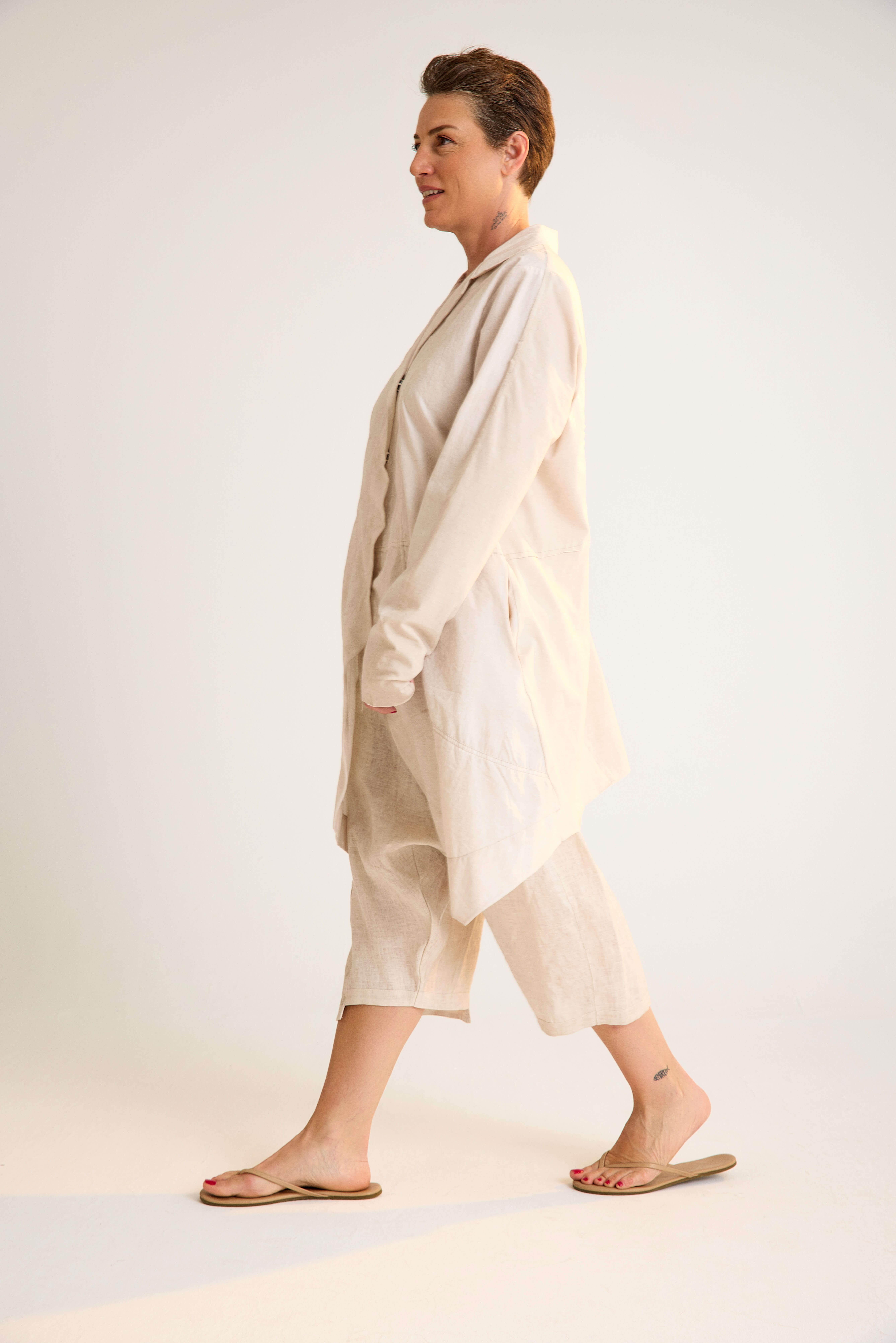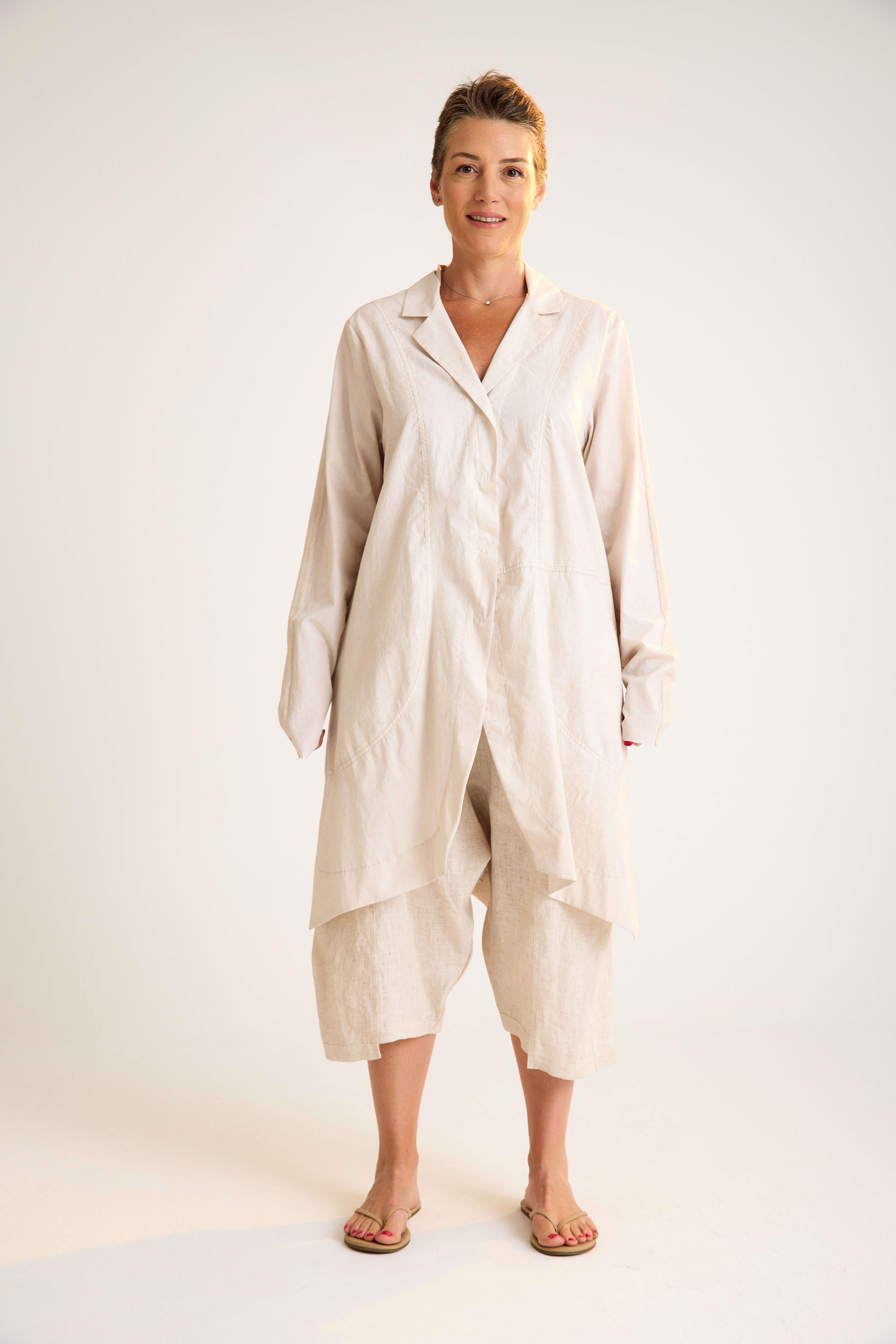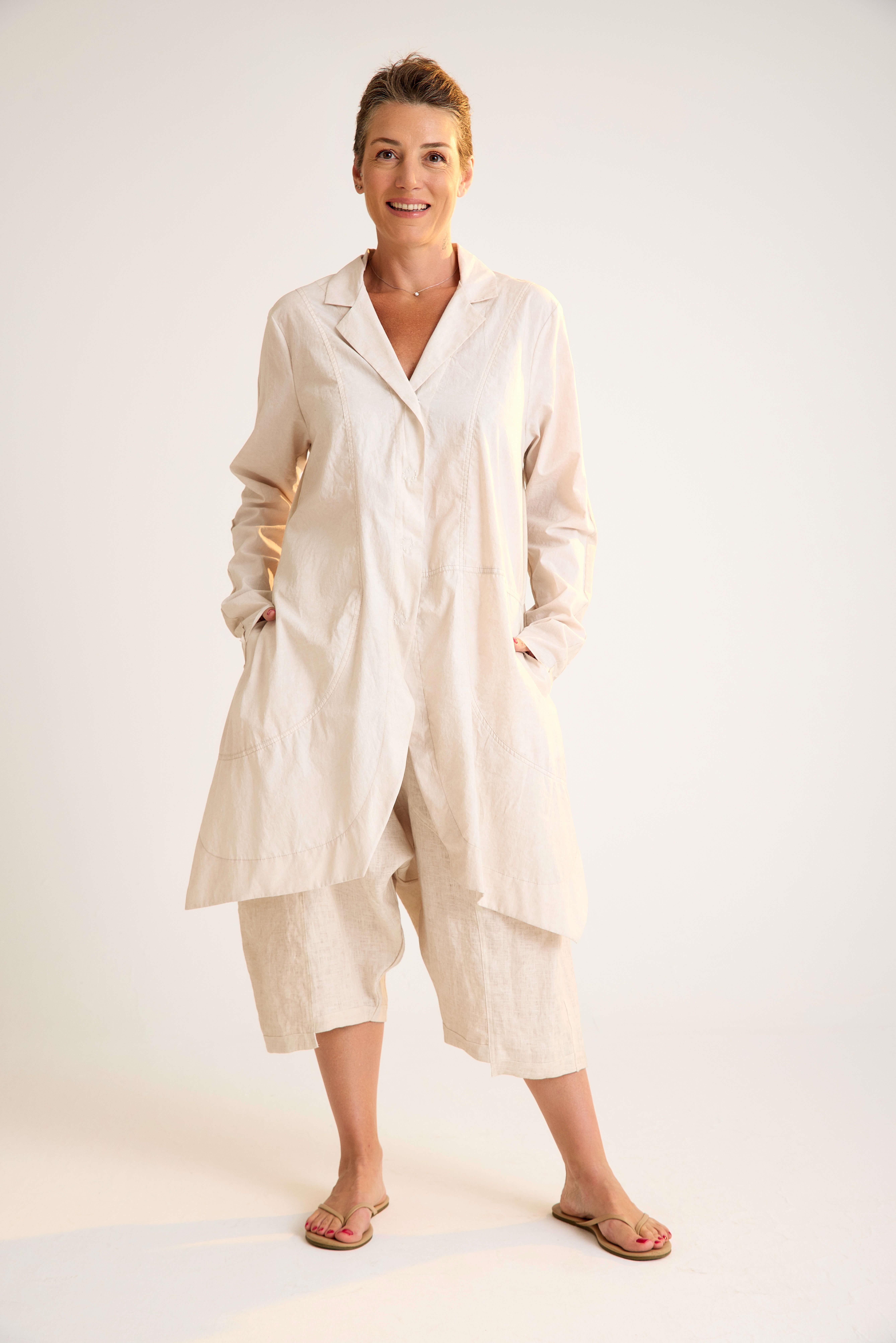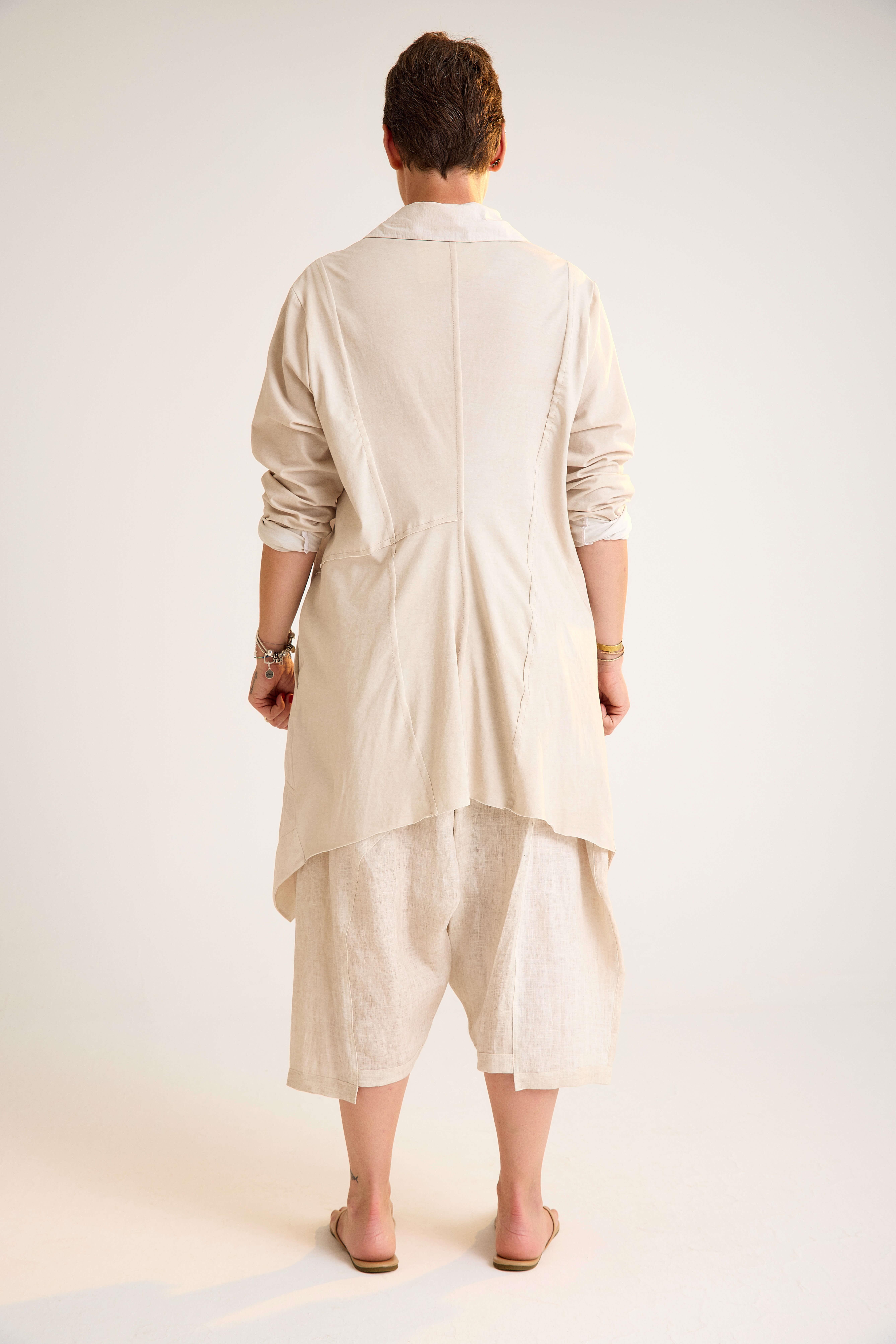 Washed cotton jacket with a modern high-low design—shorter in the front and longer in the back. Features hidden snap buttons for a clean finish, combining casual comfort with timeless style
