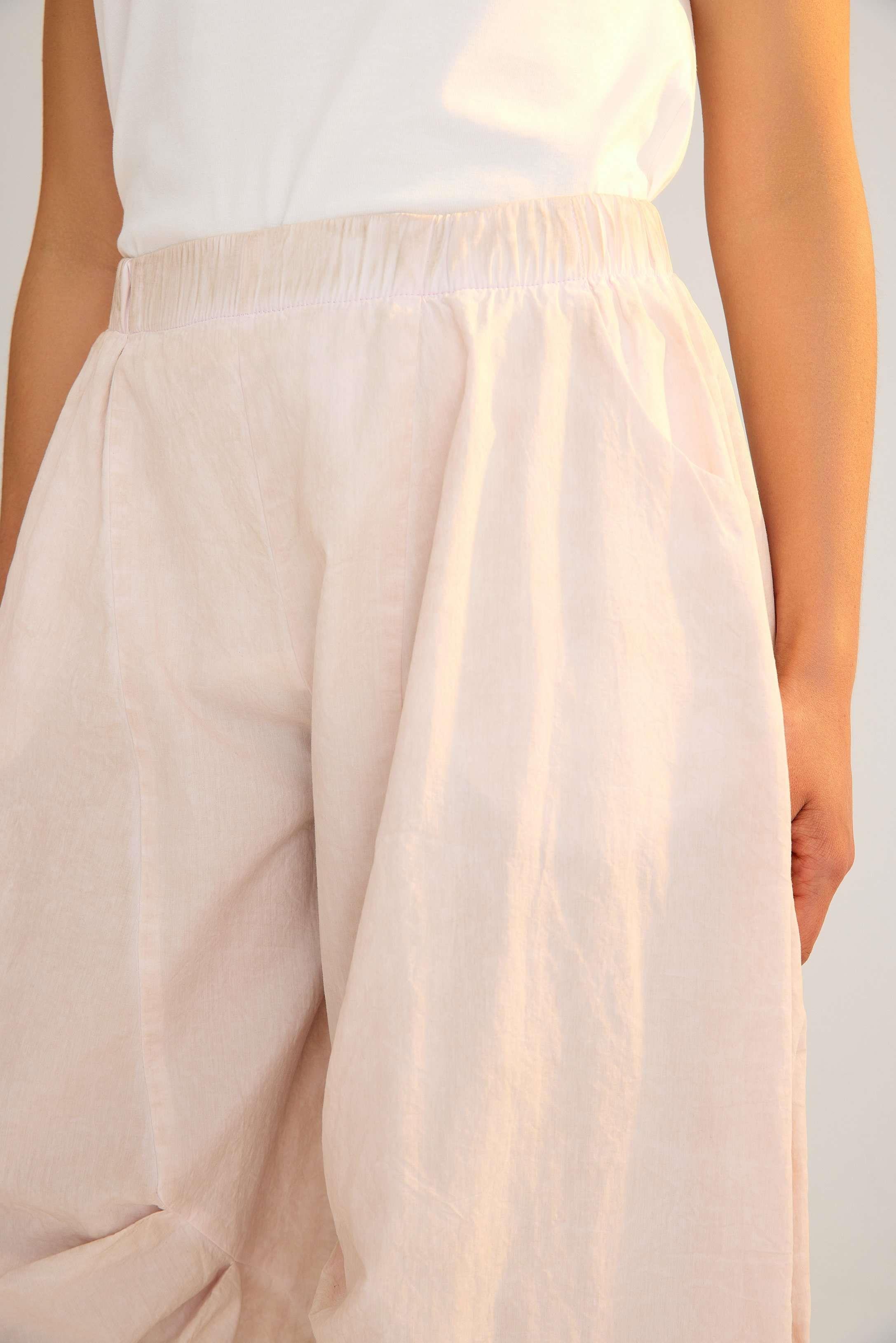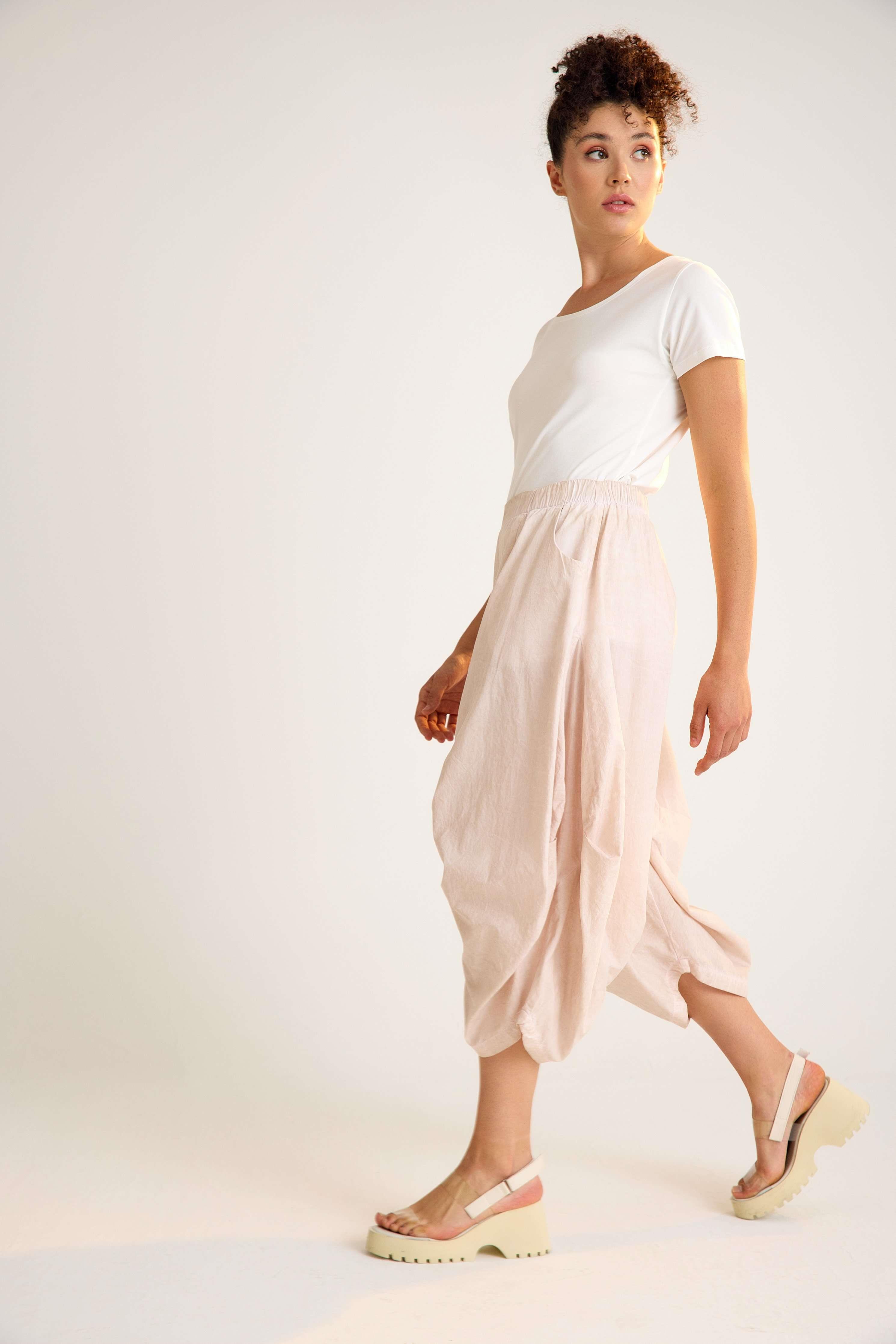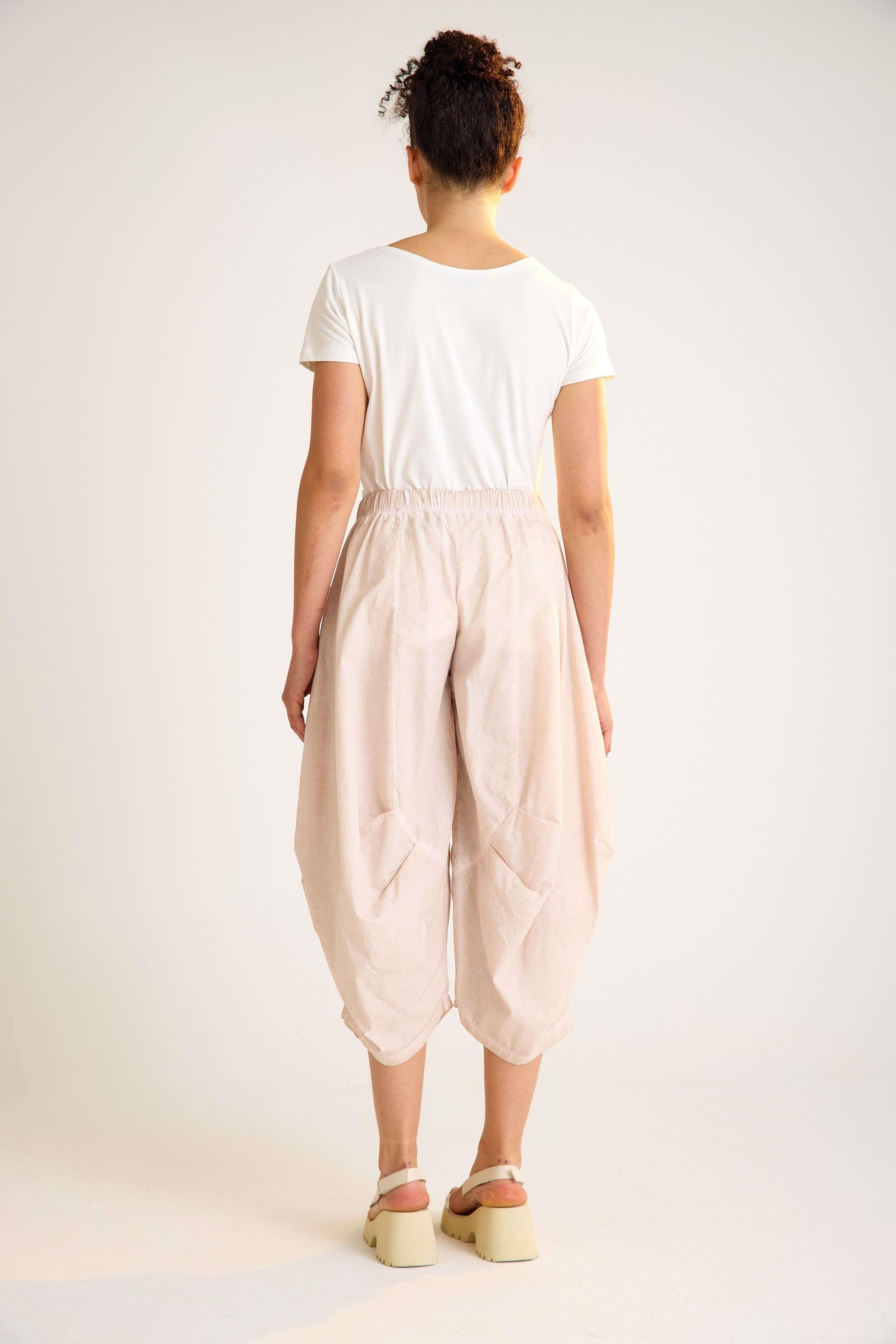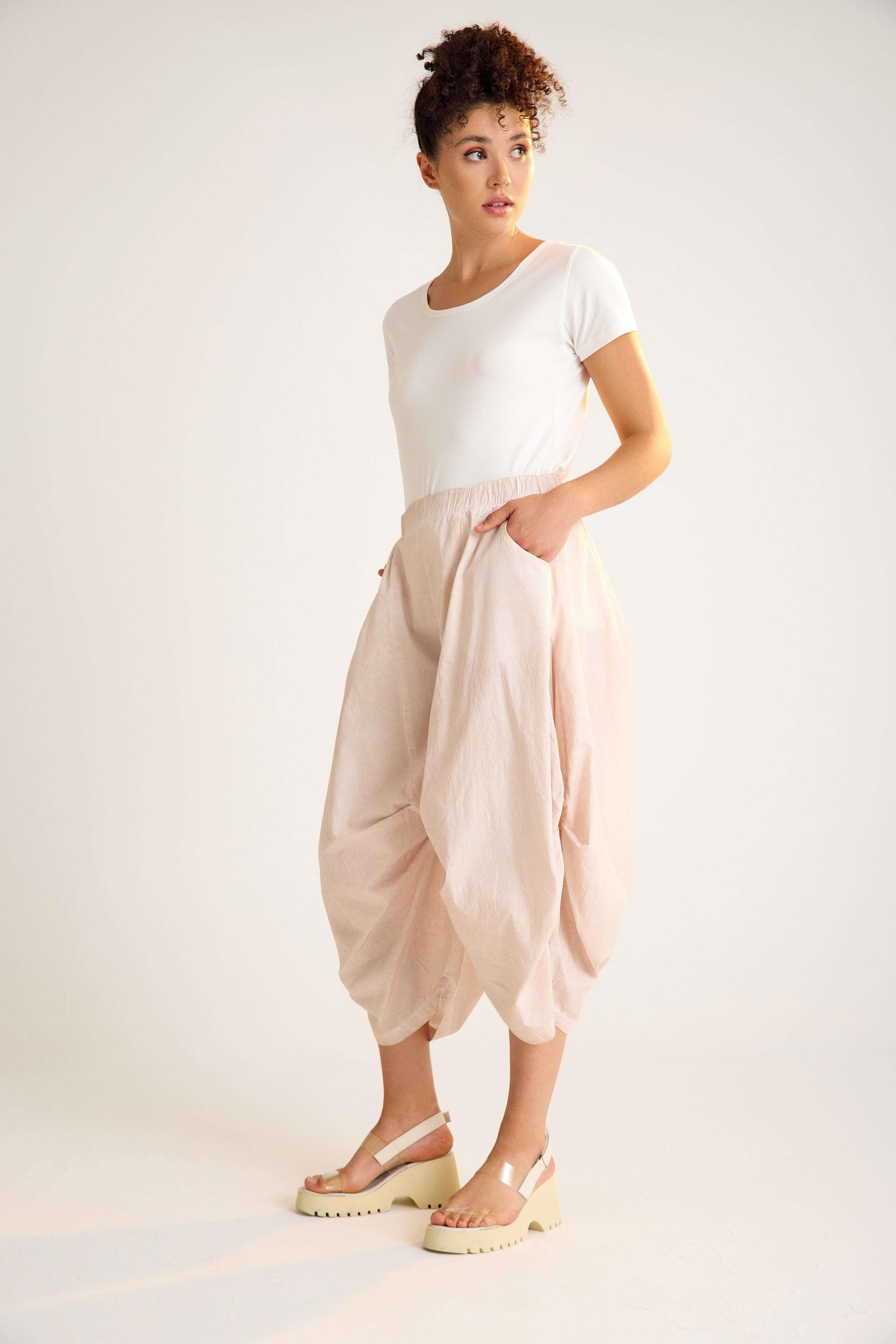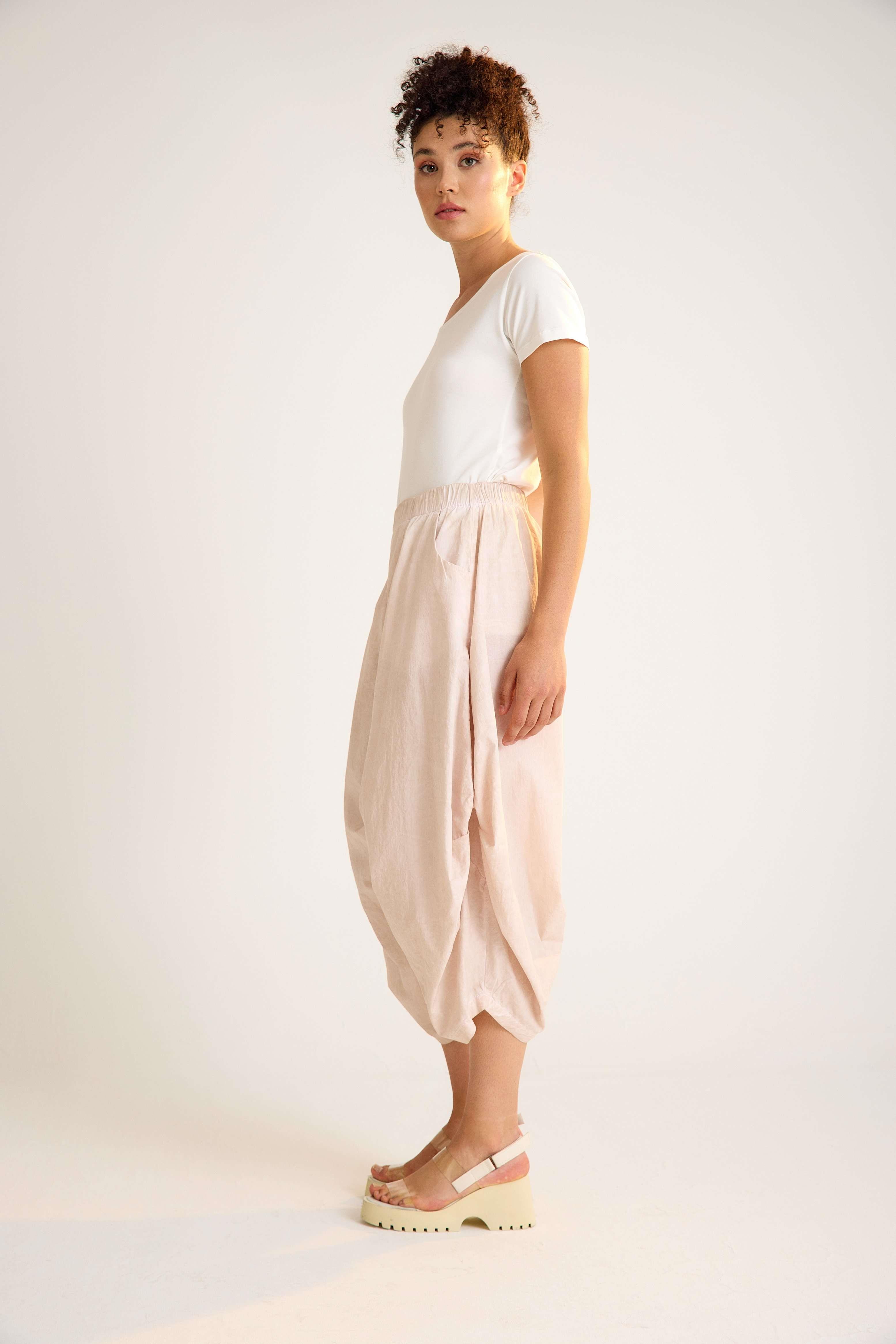 Cotton trousers with an elastic waistband and practical side pockets, crafted in crisp cotton fabric for comfort and style. Designed with a slightly balloon-shaped silhouette for a modern avant-garde touch. Available in anthracite and white. A versatile and timeless piece, perfect for wholesale buyers and retail fashion boutiques.