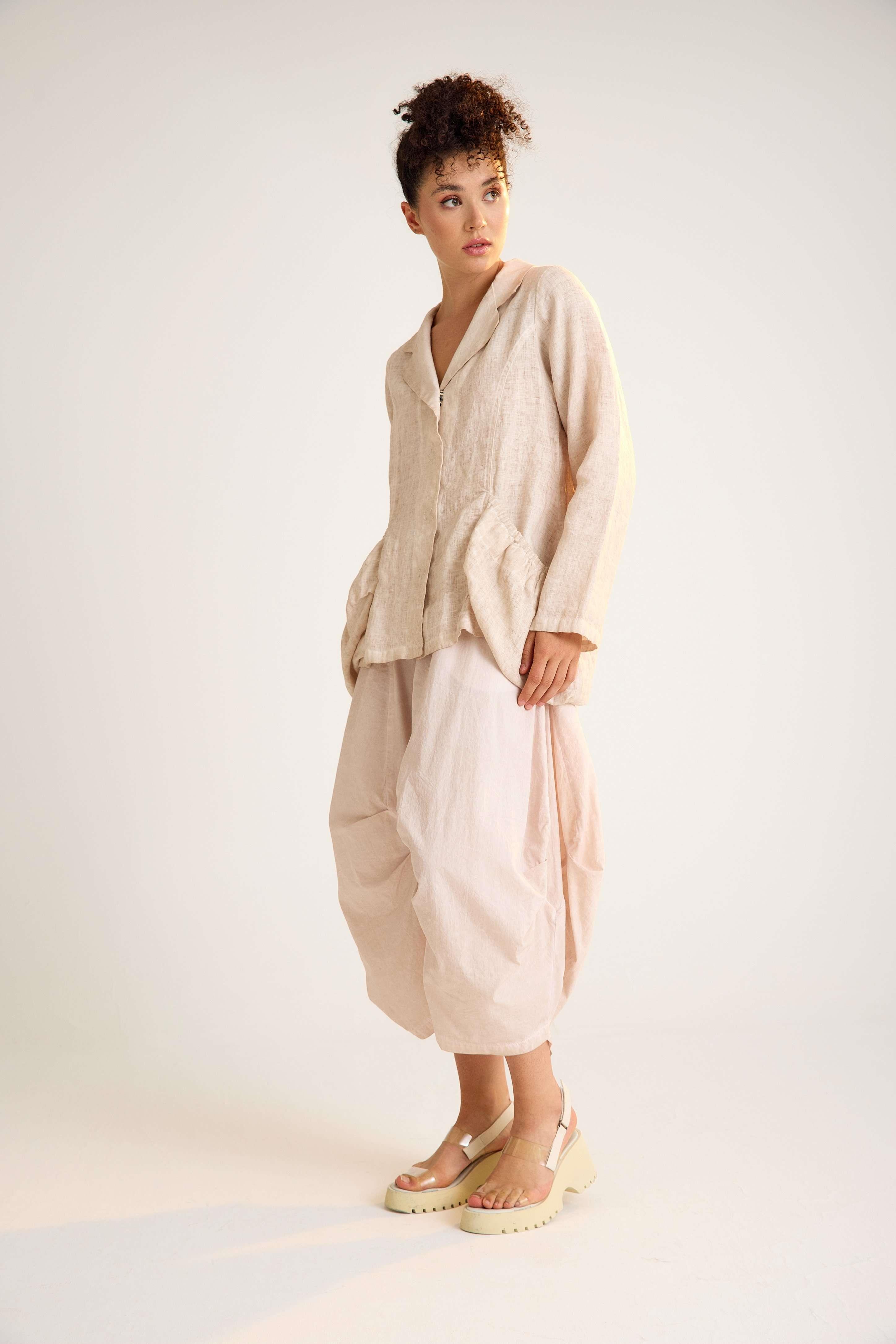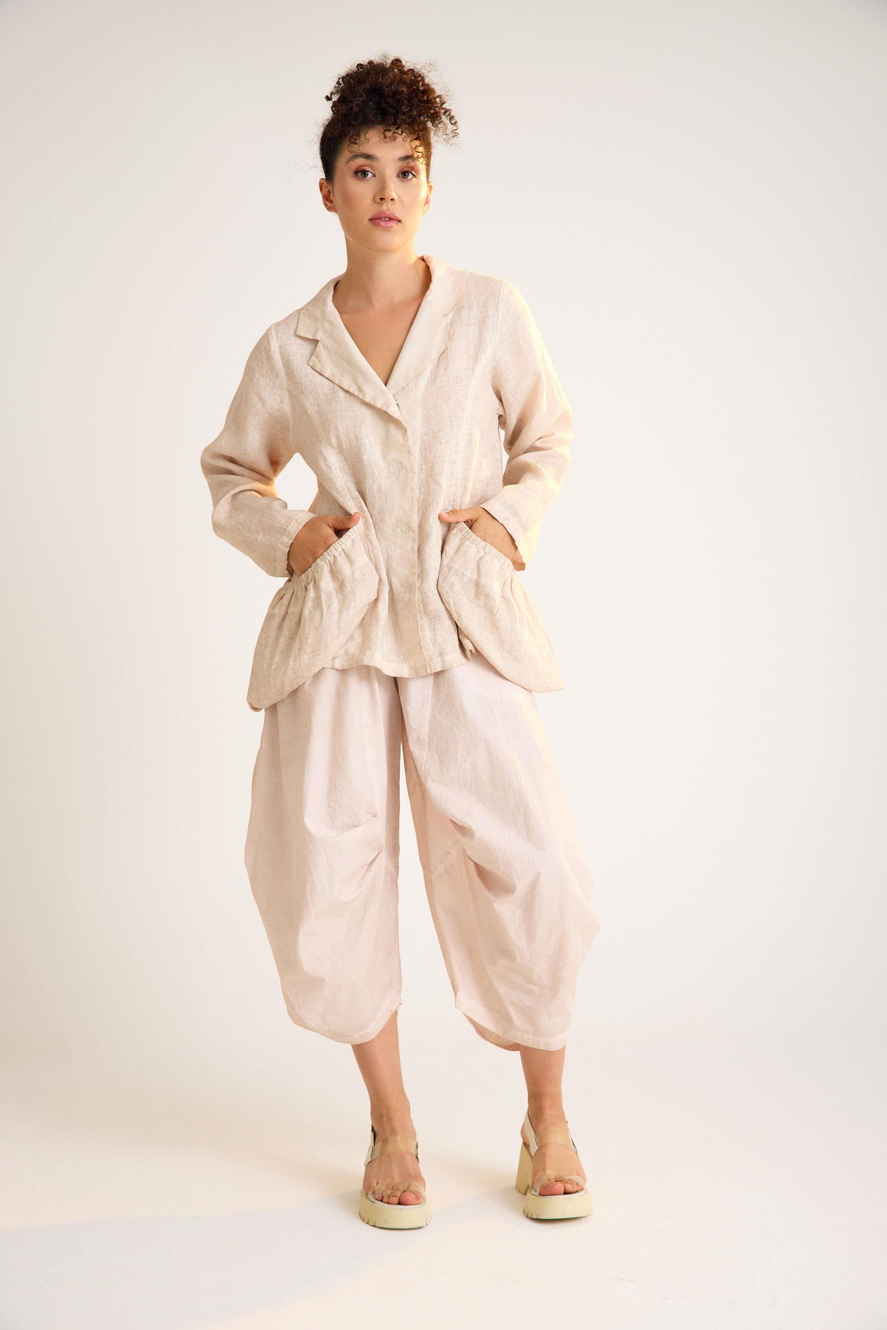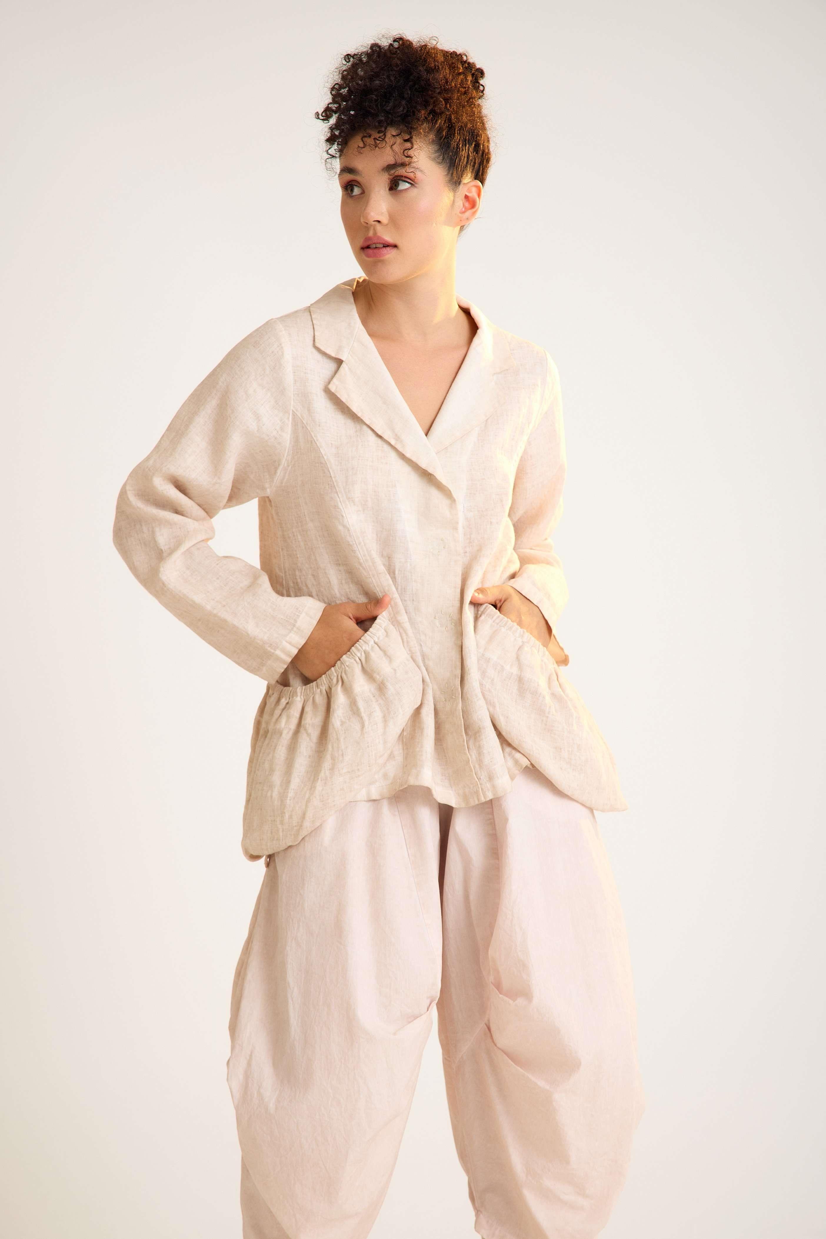 Linen Jacket with Gathered Oversized Pockets and Classic Collar A relaxed-fit linen jacket featuring long sleeves, a traditional shirt collar, and oversized gathered pockets, combining everyday comfort with modern minimalist style.