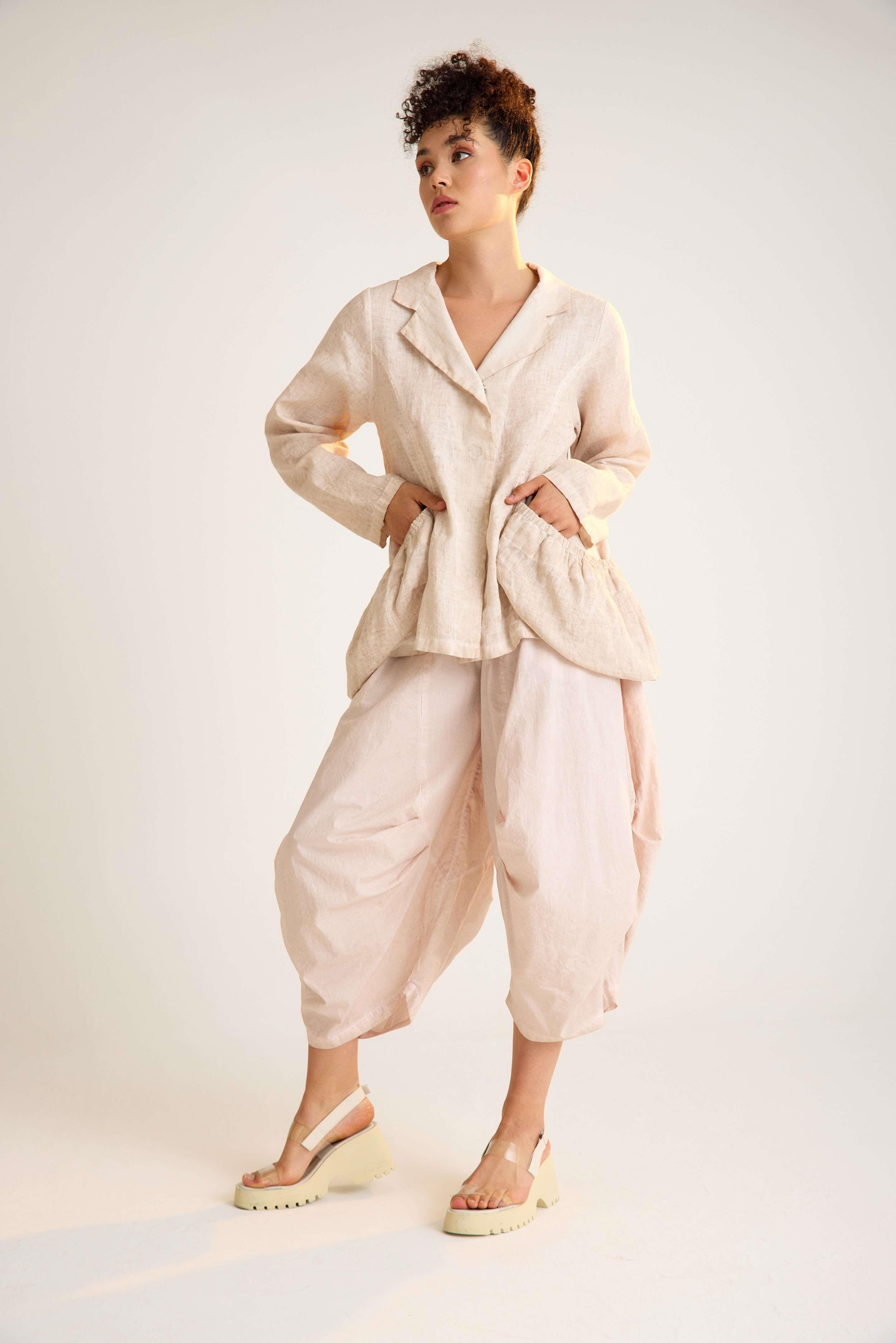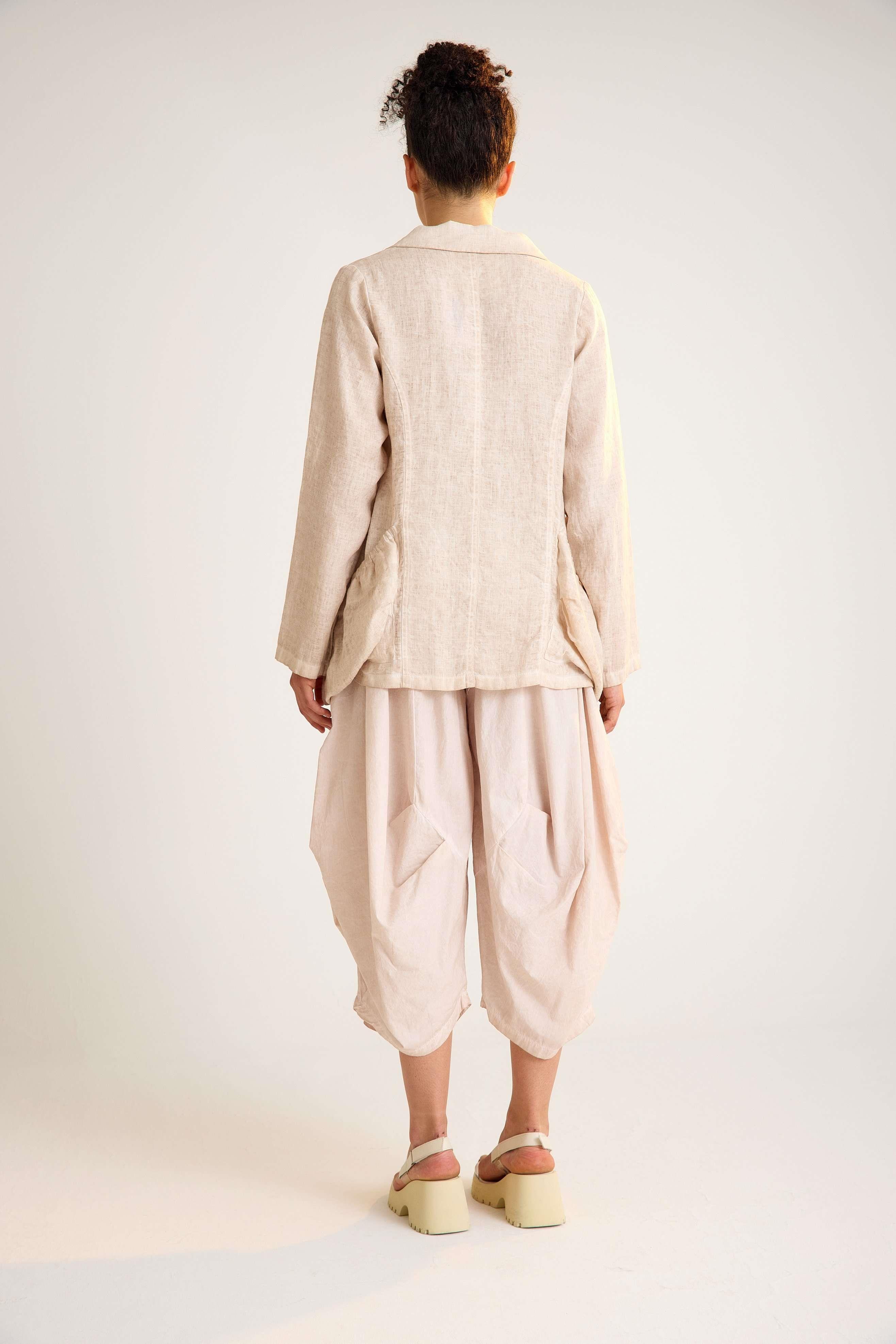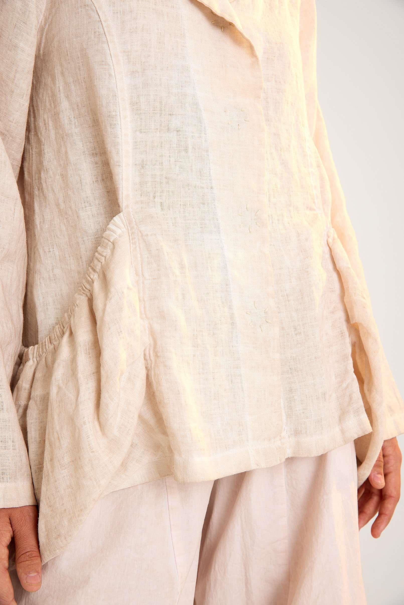Linen Jacket with Gathered Oversized Pockets and Classic Collar A relaxed-fit linen jacket featuring long sleeves, a traditional shirt collar, and oversized gathered pockets, combining everyday comfort with modern minimalist style.