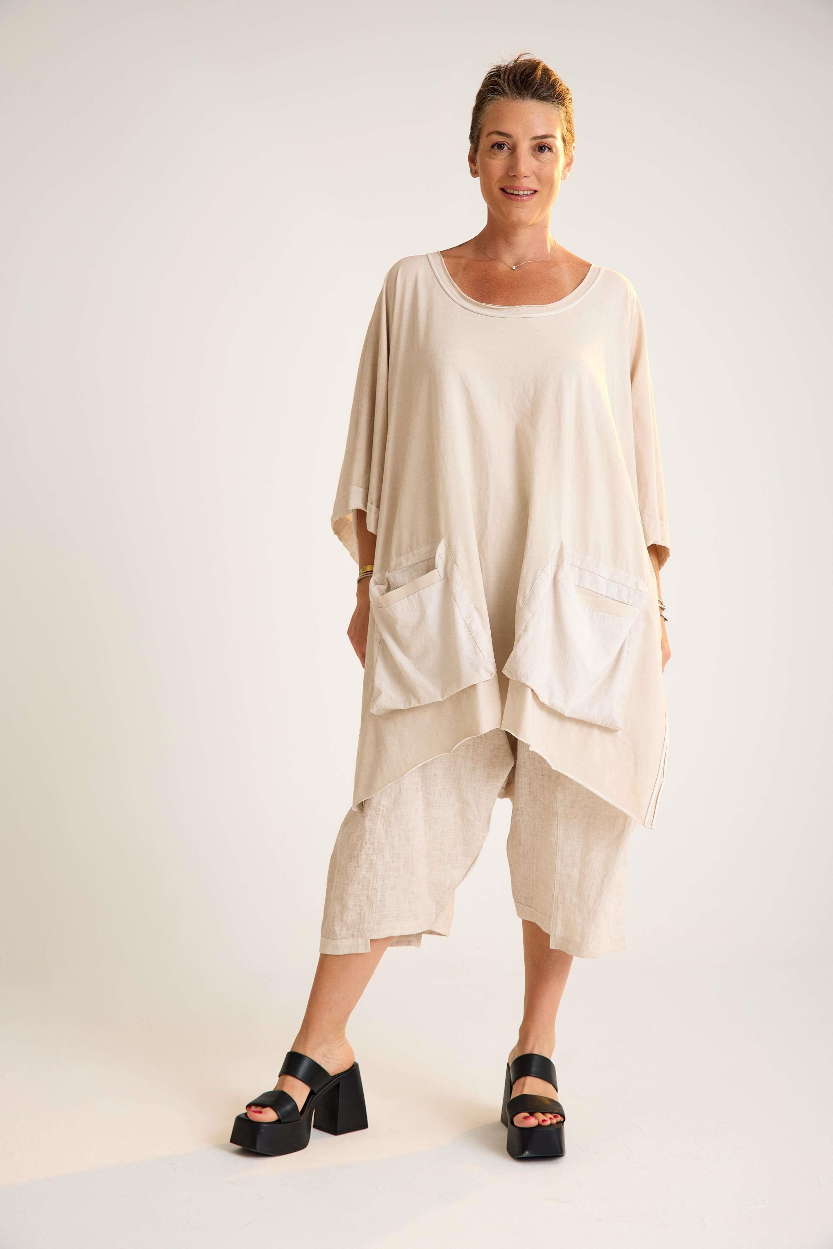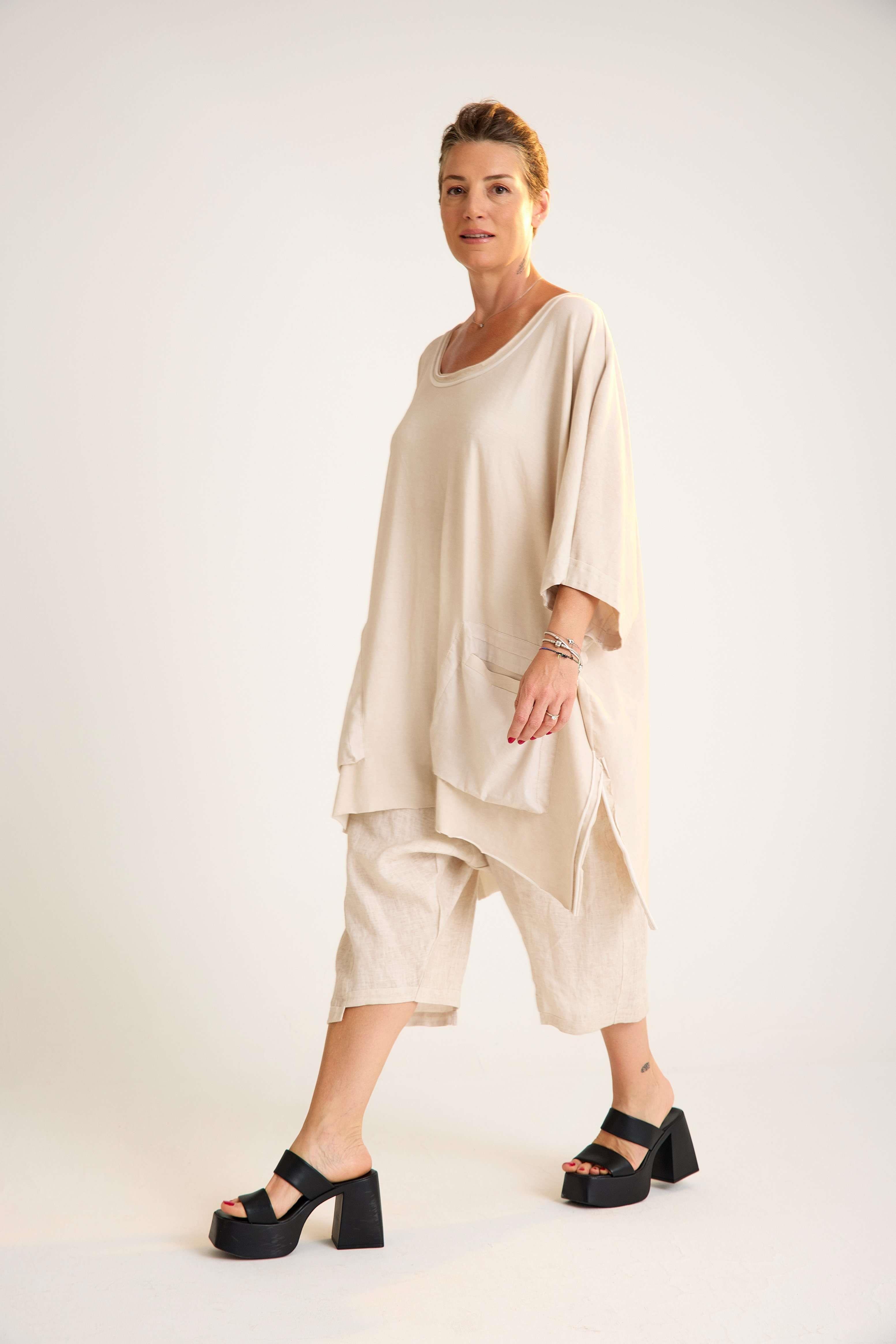 Oversize Cotton Tunic – Asymmetrical, Modern, Relaxed Fit This oversize cotton tunic features raglan three-quarter sleeves and an asymmetrical cut, creating a contemporary silhouette with effortless movement. Designed with a clean oval neckline and two small front pockets, it balances style with subtle functionality. Crafted from a soft cotton blend with a hint of stretch, the tunic offers breathable comfort and relaxed wear. Its asymmetrical hemline adds a modern edge, making it versatile for both casual and chic combinations. Key features: Oval neckline with relaxed finish Raglan three-quarter sleeves (truvakar) Asymmetrical cut for modern flow Two small front pockets 93% cotton, 7% elastane blend A stylish and comfortable wardrobe staple that combines everyday ease with a touch of contemporary elegance.
