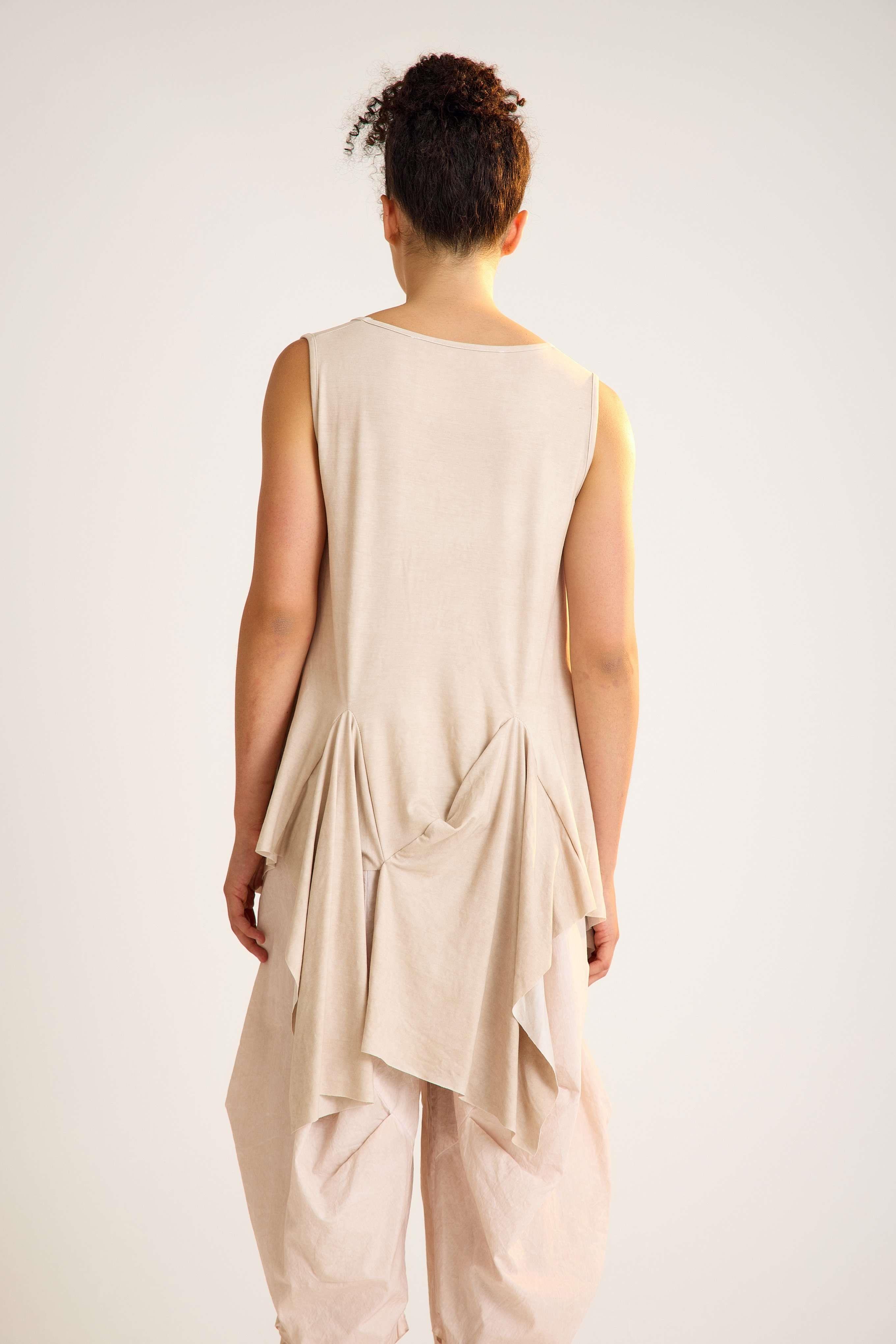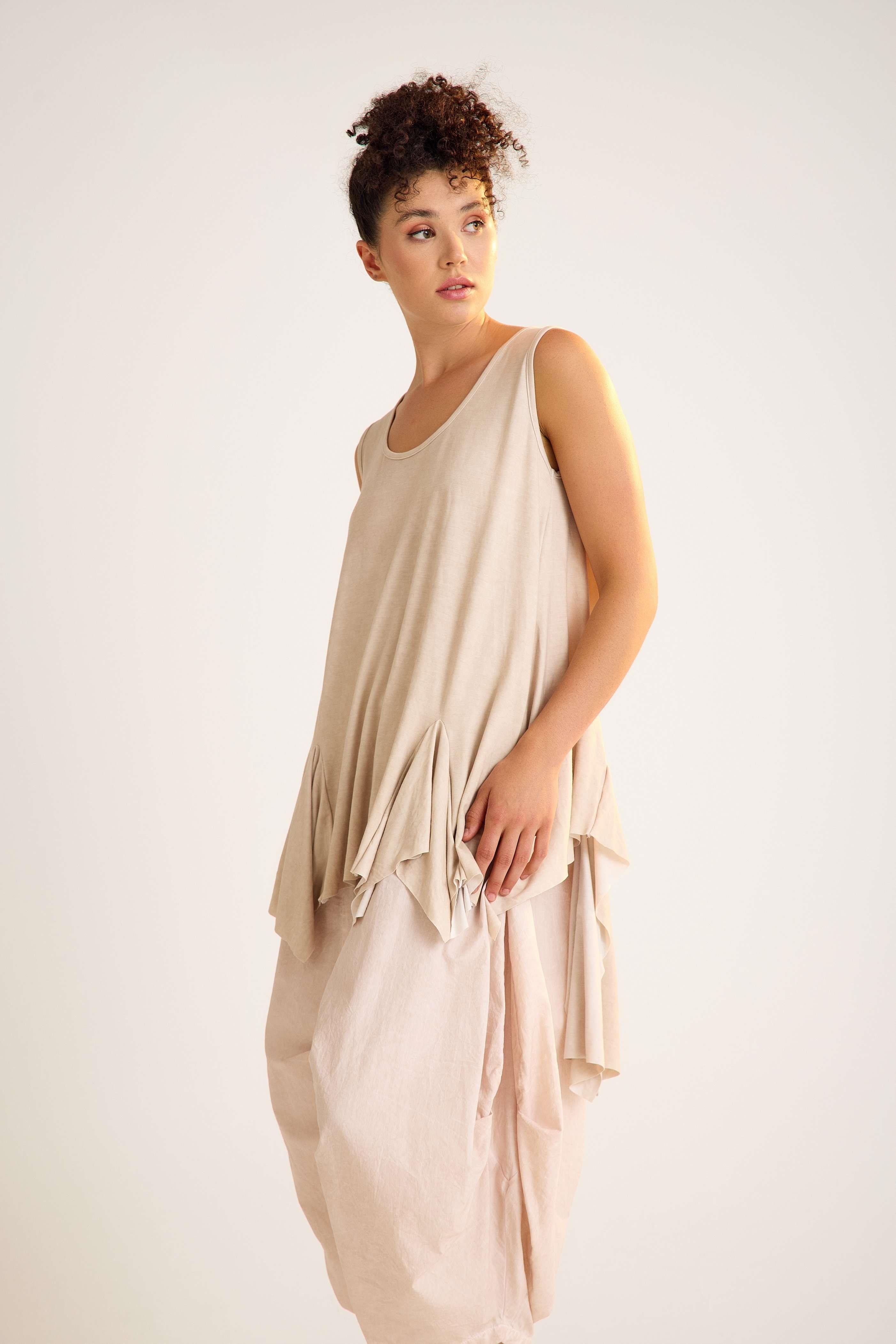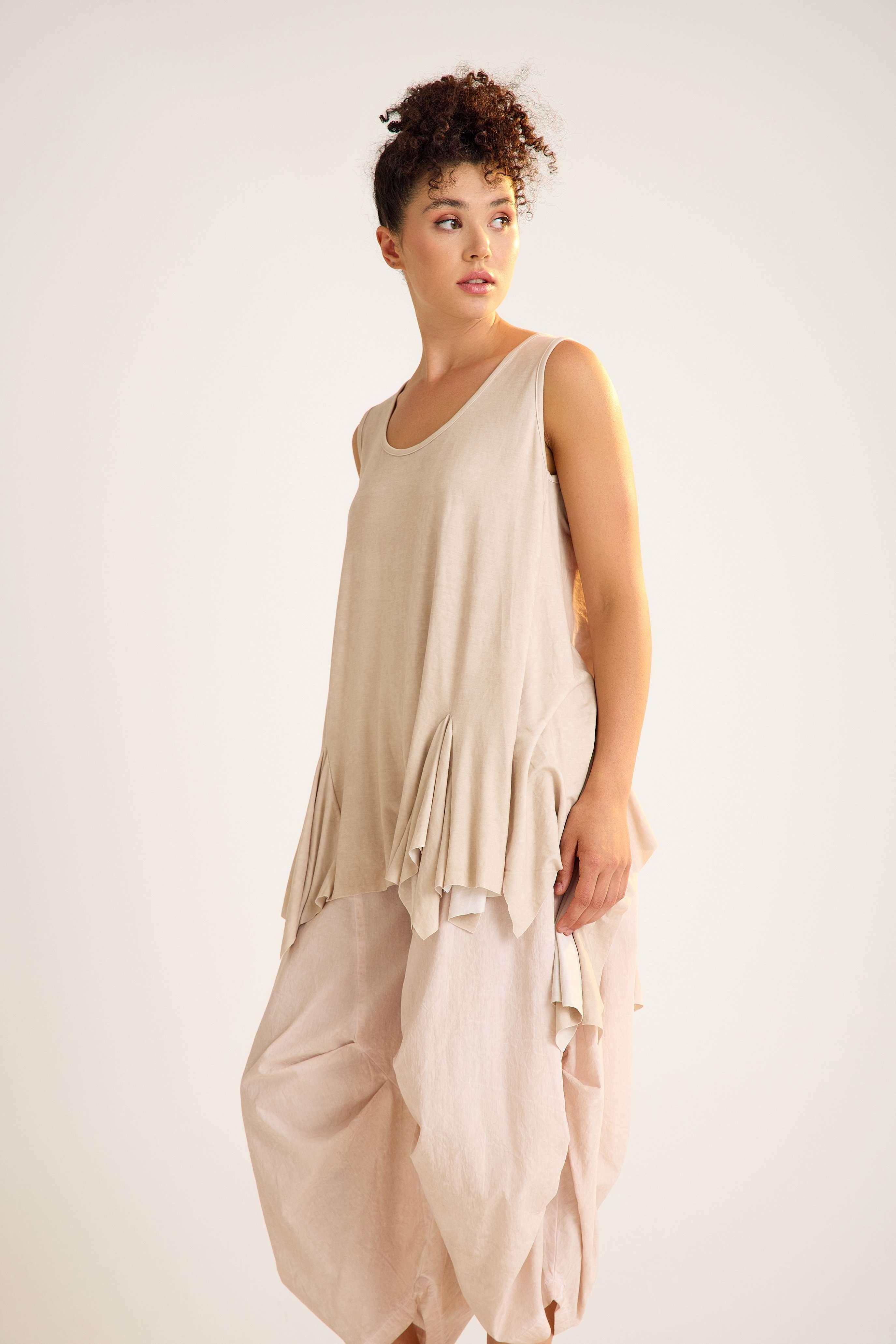 Viscose Tunic – Sleeveless, Flowing, Asymmetrical Elegance This viscose tunic is crafted with a sleeveless design and a flowing asymmetrical hemline that adds graceful movement to every step. The U-neckline enhances its modern simplicity, while the relaxed fit creates an effortless, flattering silhouette. Made from a soft viscose blend with stretch, it drapes beautifully over the body, offering both comfort and flexibility. The asymmetric cut with a longer back gives this piece a contemporary edge, making it perfect for both casual and refined styling. Key features: Sleeveless design with wide straps U-neckline with trimmed edges Flowing asymmetrical hemline Relaxed A-line silhouette 95% viscose, 5% elastane for comfort and stretch A timeless yet modern tunic that moves beautifully with you — ideal for versatile, day-to-night looks.