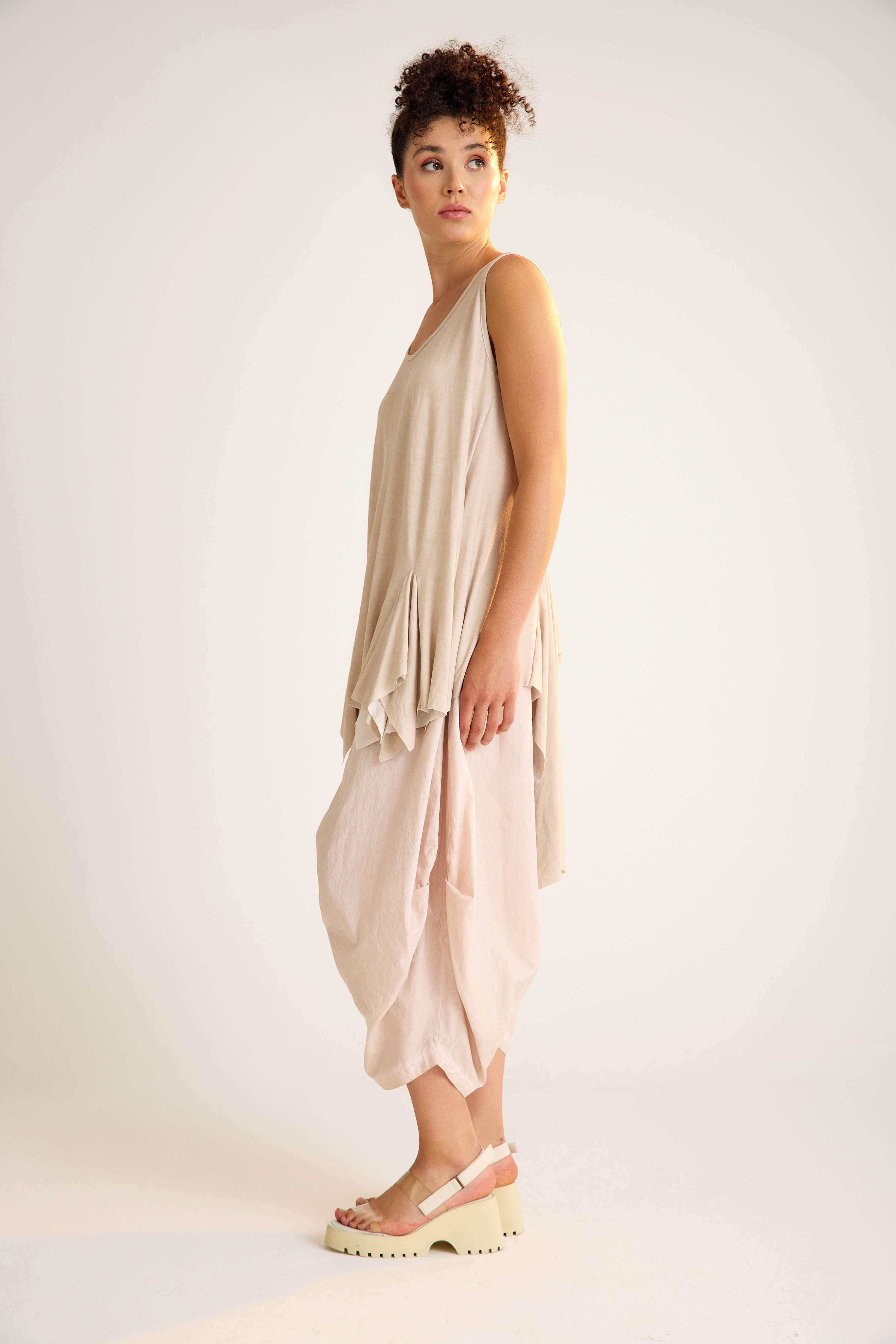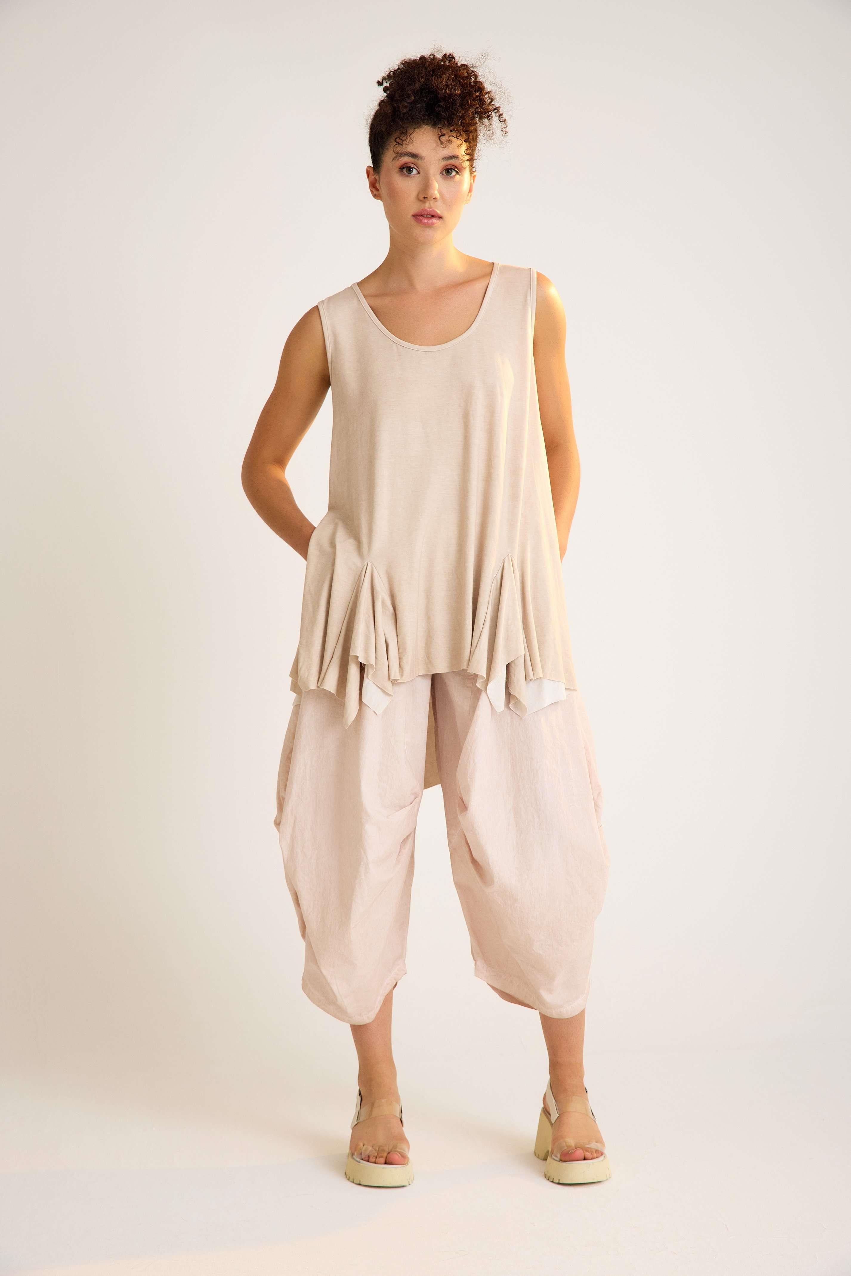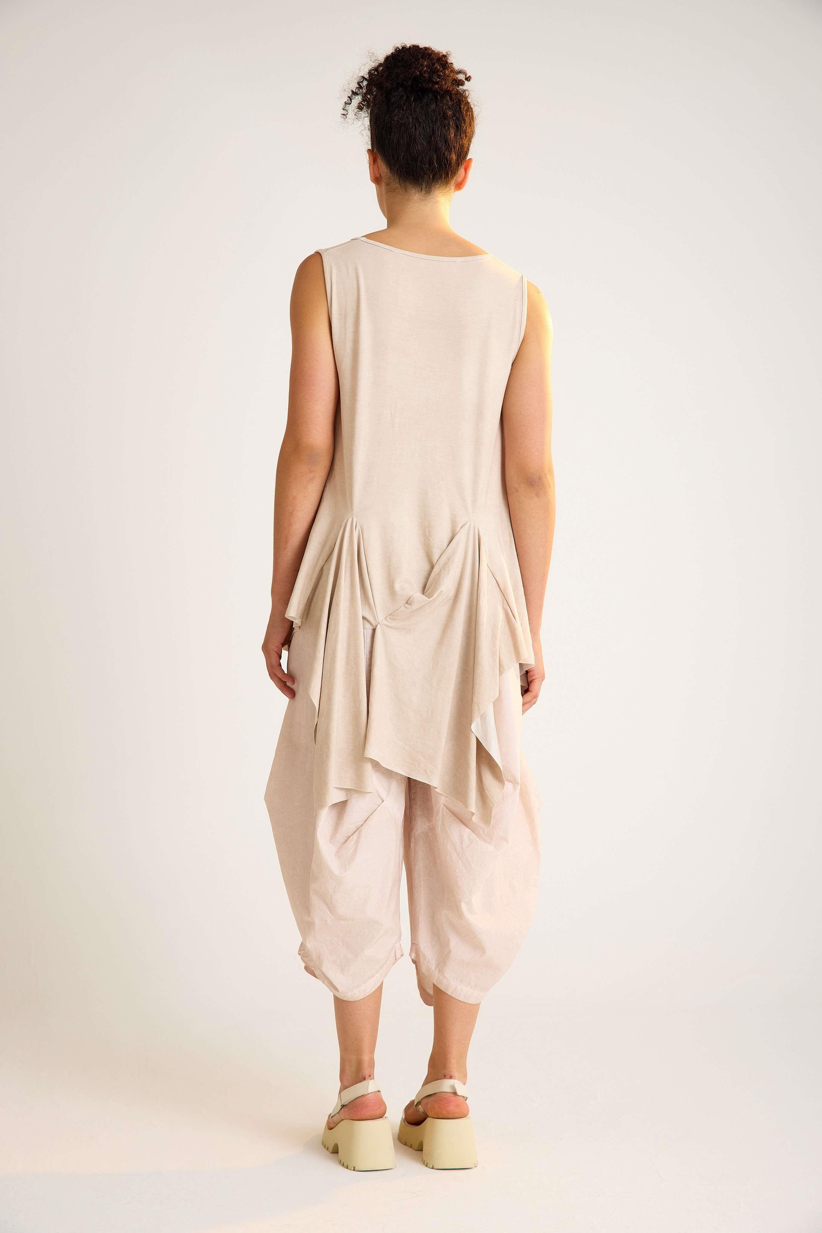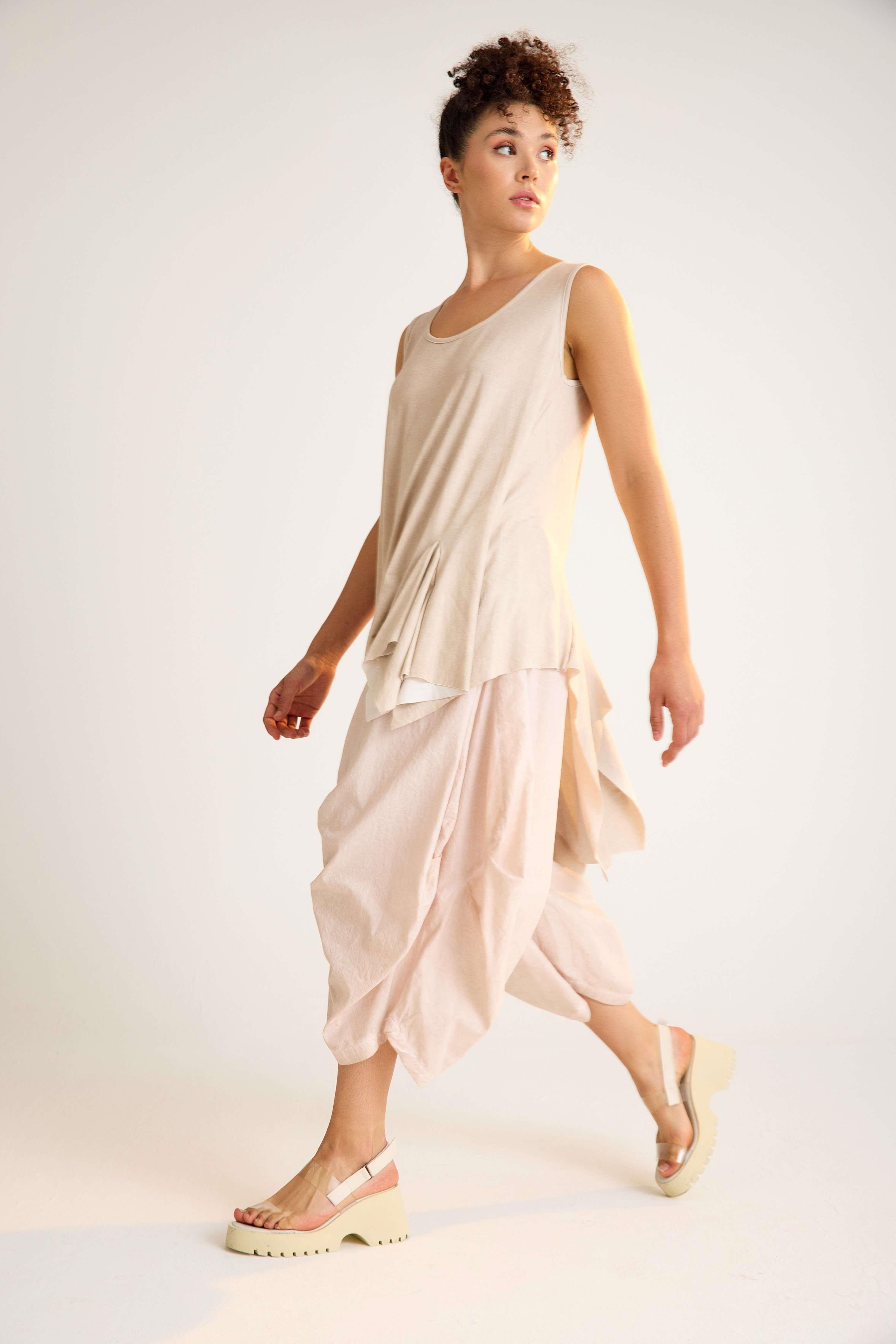 Viscose Tunic – Sleeveless, Flowing, Asymmetrical Elegance This viscose tunic is crafted with a sleeveless design and a flowing asymmetrical hemline that adds graceful movement to every step. The U-neckline enhances its modern simplicity, while the relaxed fit creates an effortless, flattering silhouette. Made from a soft viscose blend with stretch, it drapes beautifully over the body, offering both comfort and flexibility. The asymmetric cut with a longer back gives this piece a contemporary edge, making it perfect for both casual and refined styling. Key features: Sleeveless design with wide straps U-neckline with trimmed edges Flowing asymmetrical hemline Relaxed A-line silhouette 95% viscose, 5% elastane for comfort and stretch A timeless yet modern tunic that moves beautifully with you — ideal for versatile, day-to-night looks.