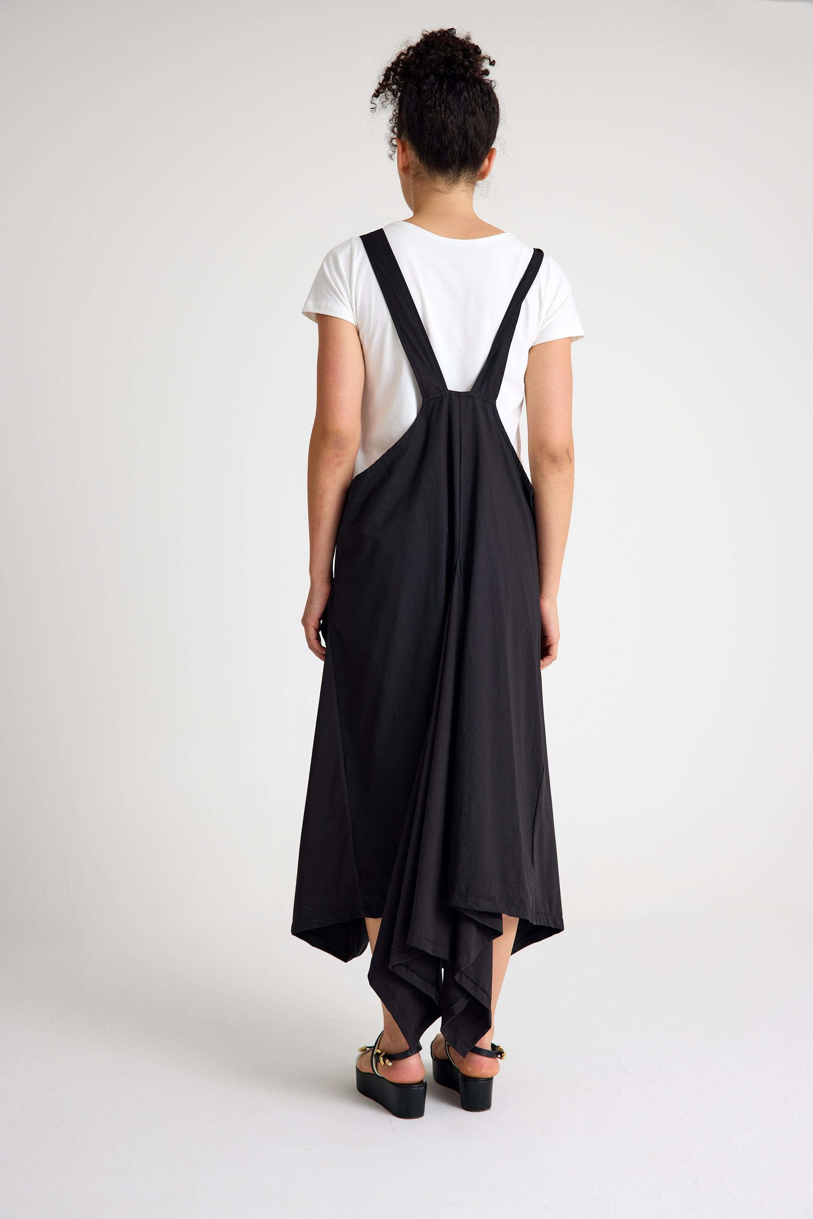 Loose-Fit Cotton Salopette Dress with Oversized Pocket Details: Relaxed salopette-inspired design Large statement front pockets Sleeveless cut with a casual, easy fit Soft washed cotton fabric with natural texture Asymmetrical loose silhouette for everyday comfort Minimal seams for a clean, modern look Material: 100% Cotton Color: Black Fit: Oversized, relaxed silhouette
