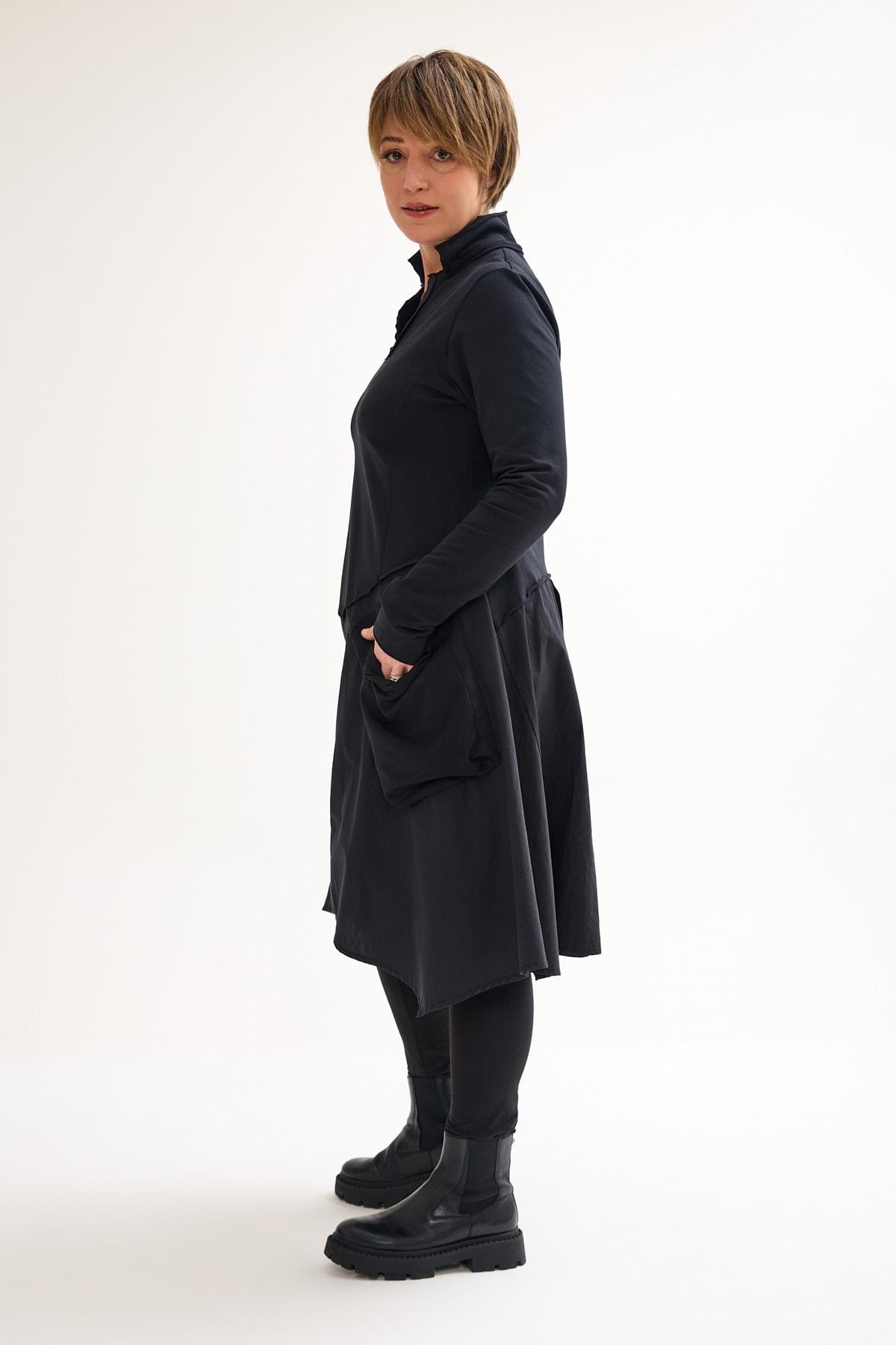 This avant-garde cotton dress features a tulip-shaped silhouette, long sleeves, and practical side pockets. Designed with decorative seam details, a zip-up collar, and raw edge finishes, it combines comfort and modern style in a timeless oversized fit.