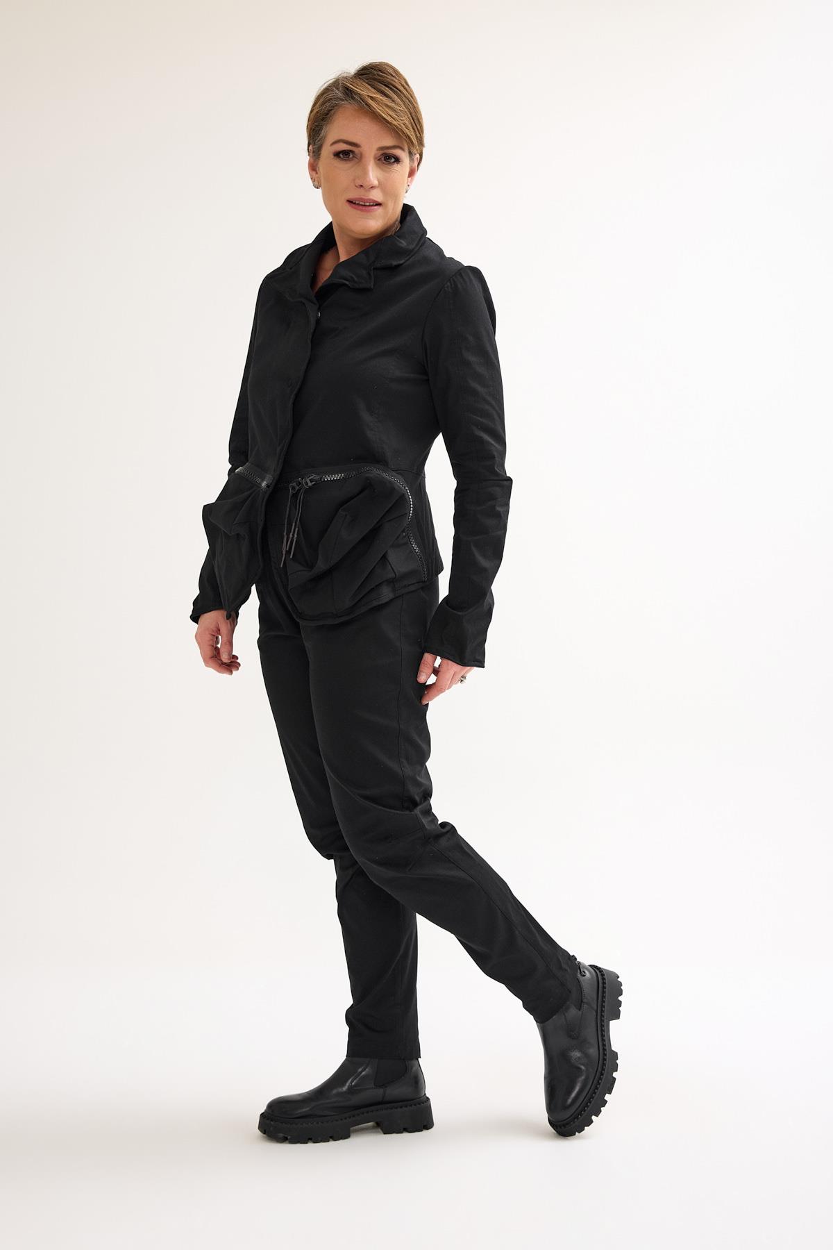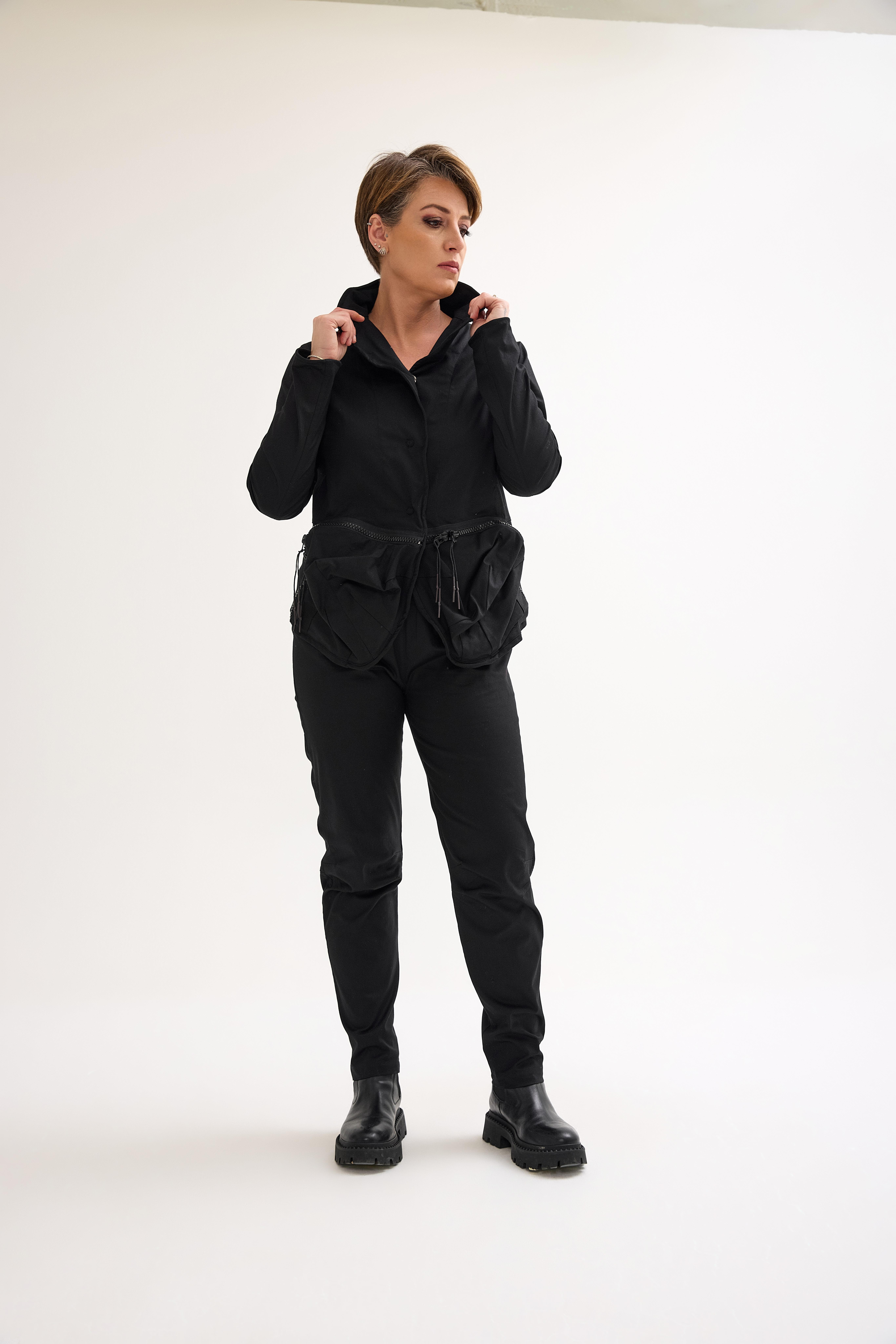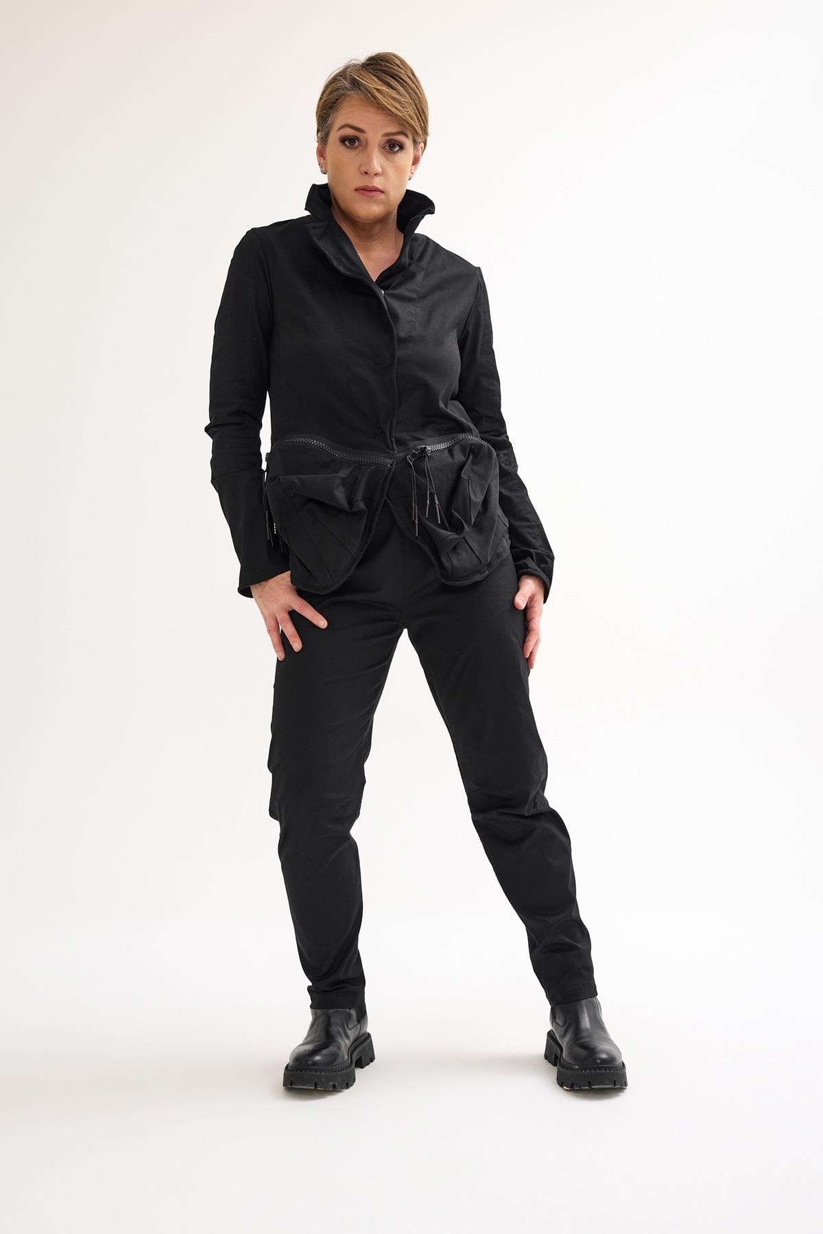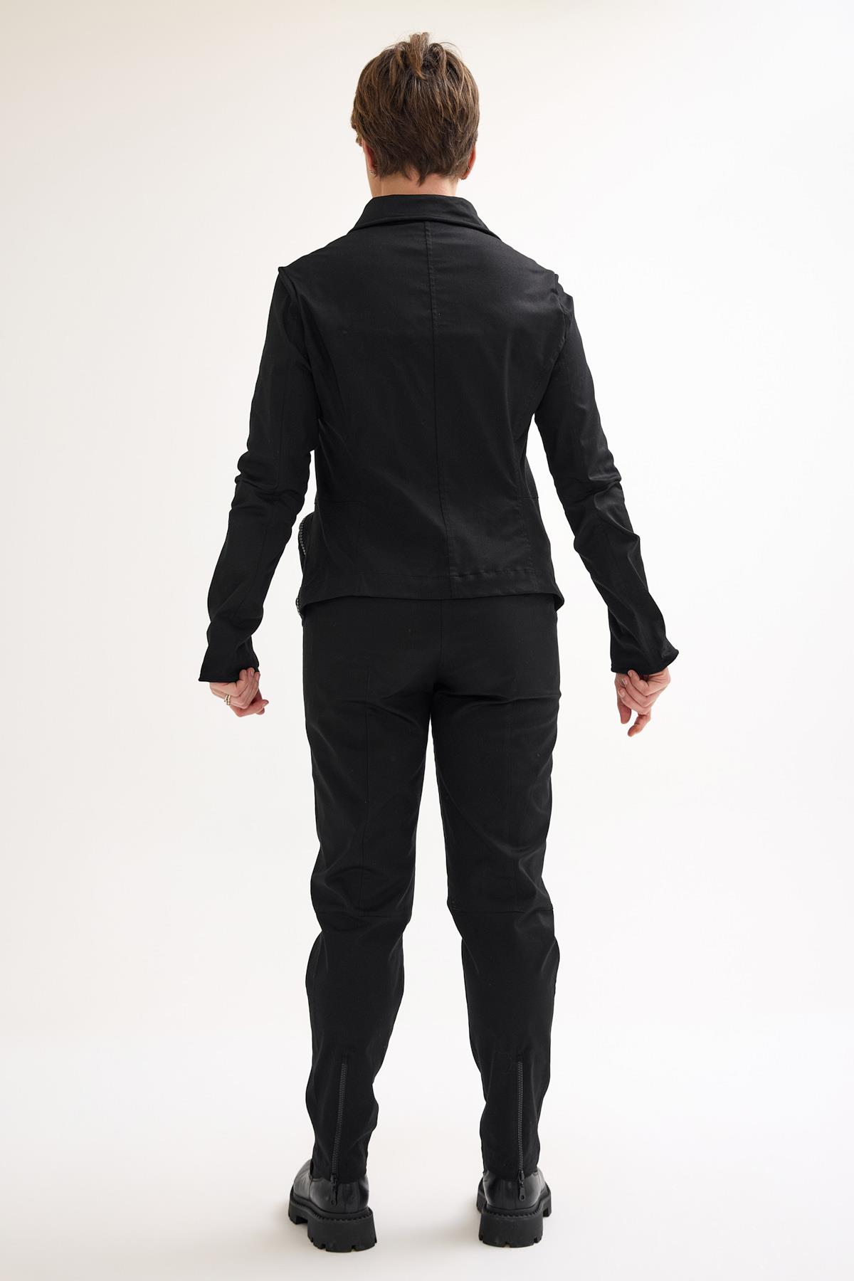 Cotton Jacket with Wired Collar and Oversized Zippered Pockets This tailored cotton jacket combines structure with avant-garde detailing, featuring a metal-wired collar that can be shaped for volume, oversized pockets with bold two-way zippers, and front popper fastenings. Designed in a stretch cotton blend for comfort and modern edge.
