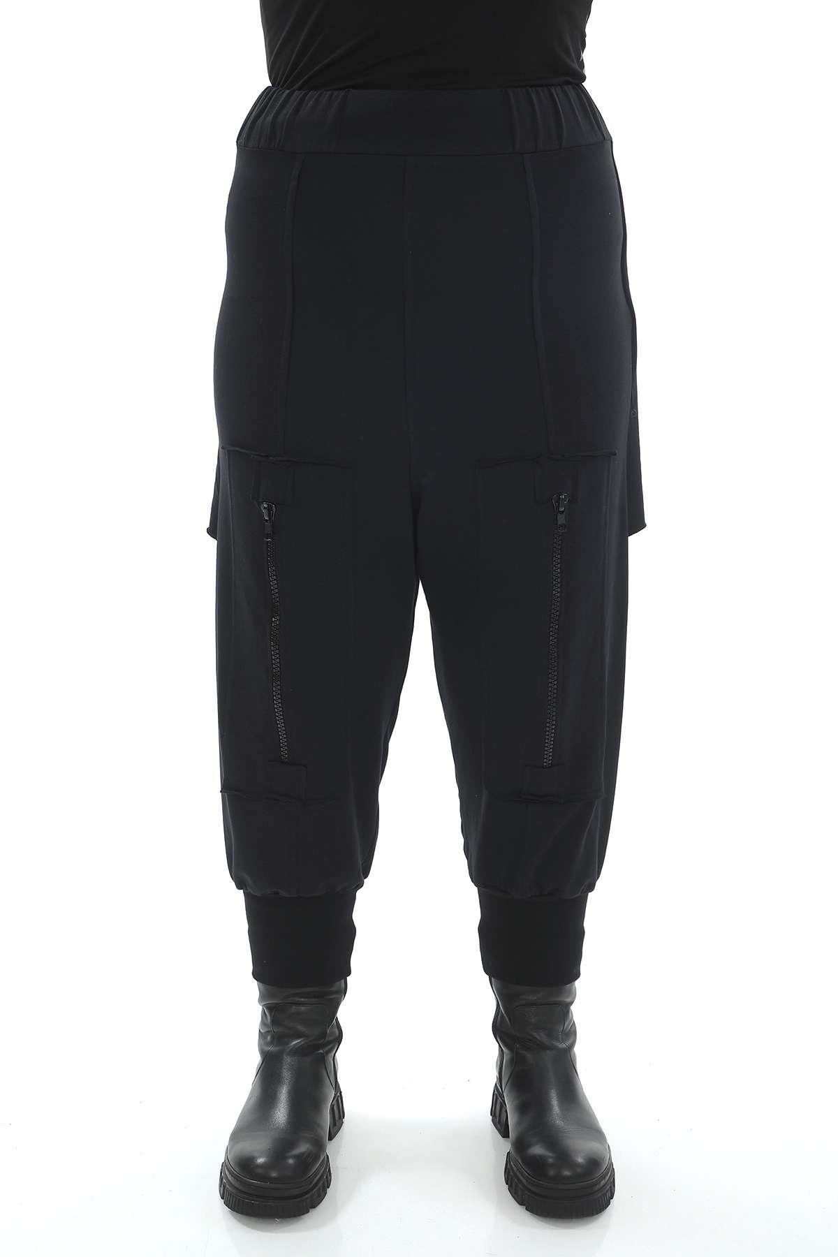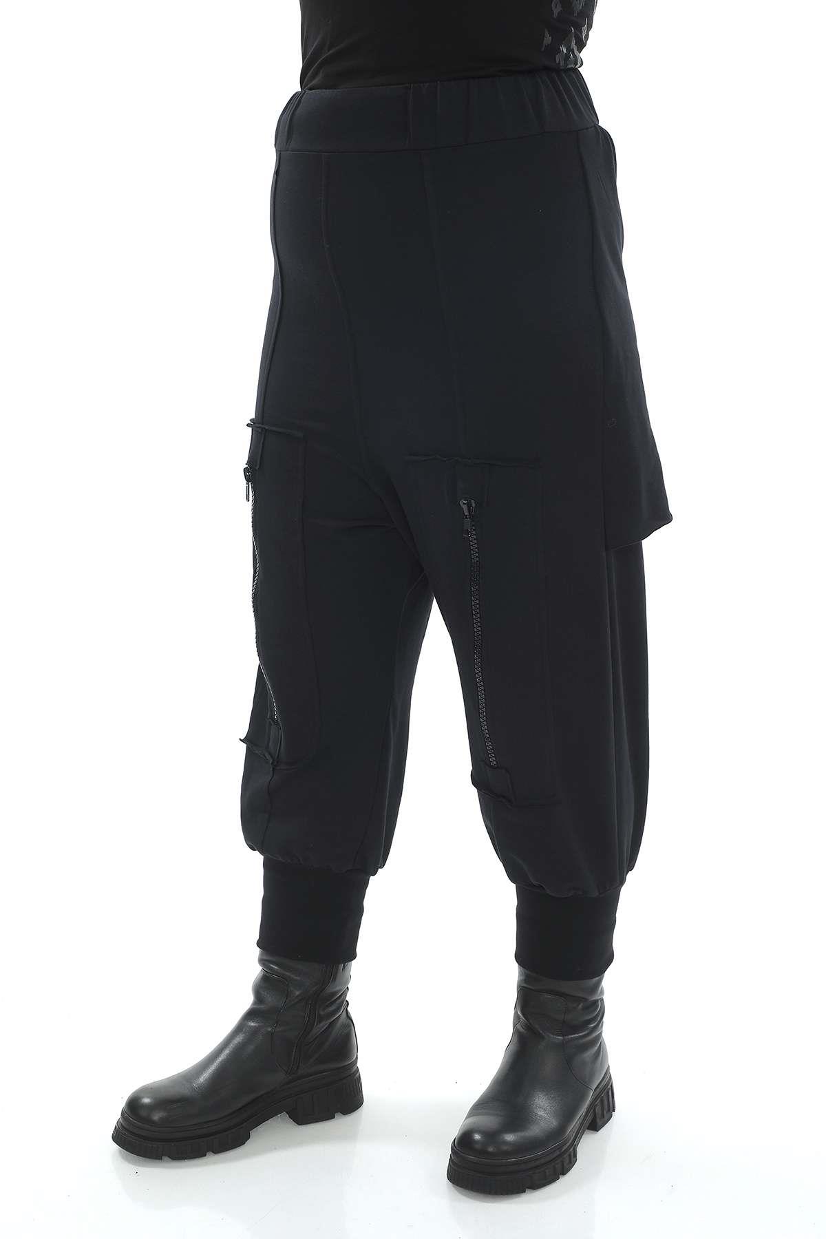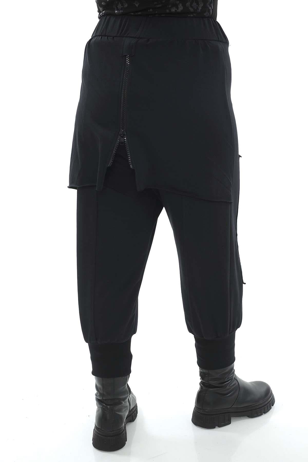 Cotton sweatpants with an elastic waistband, cuffed ankles, and modern zipper details at the front and back. Designed with a unique skirt-like overlapping panel at the back with zipper closure, crafted from thick cotton-elastane fabric for comfort and movement. A stylish and timeless avant-garde design in black – perfect for wholesale buyers and retail fashion boutiques