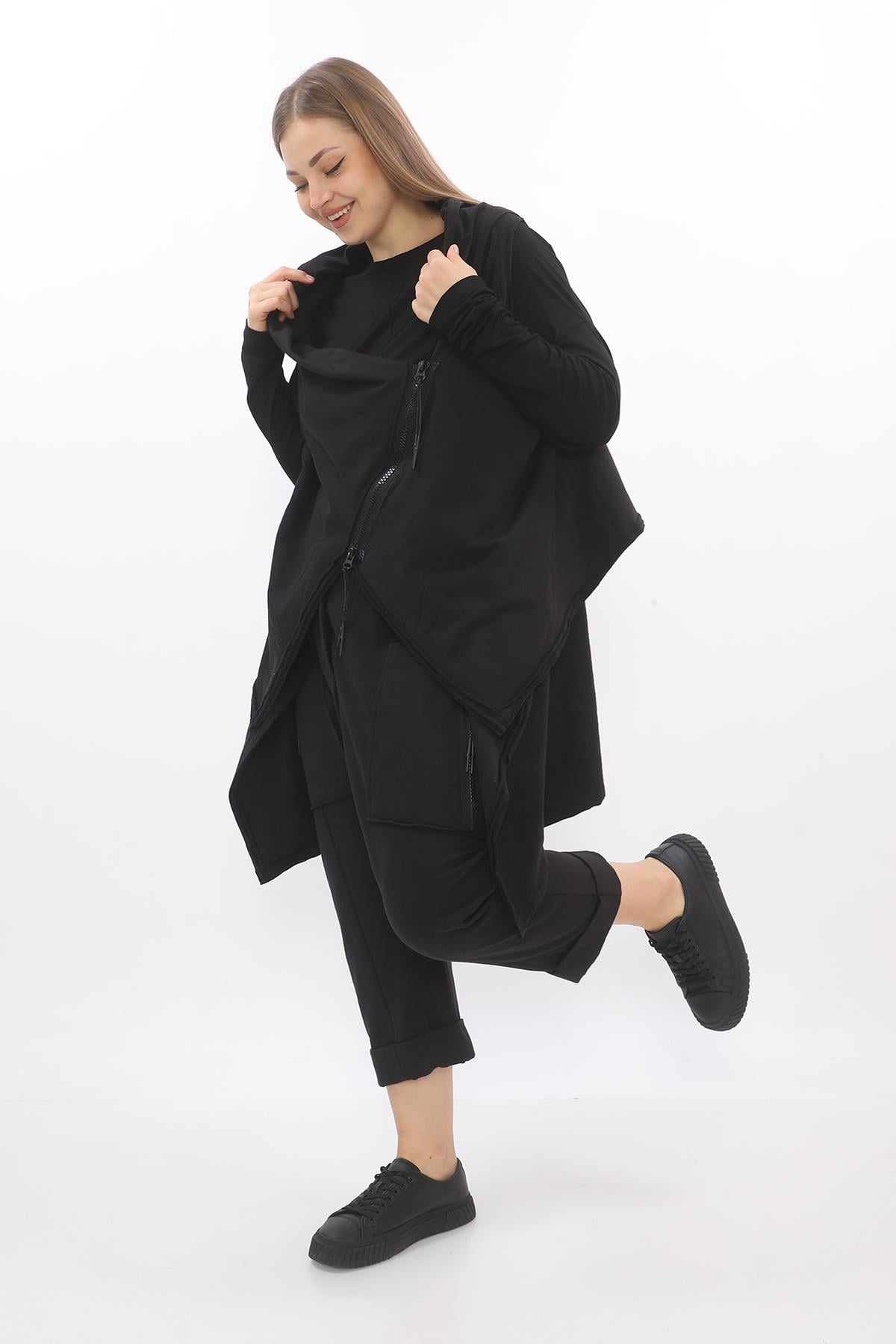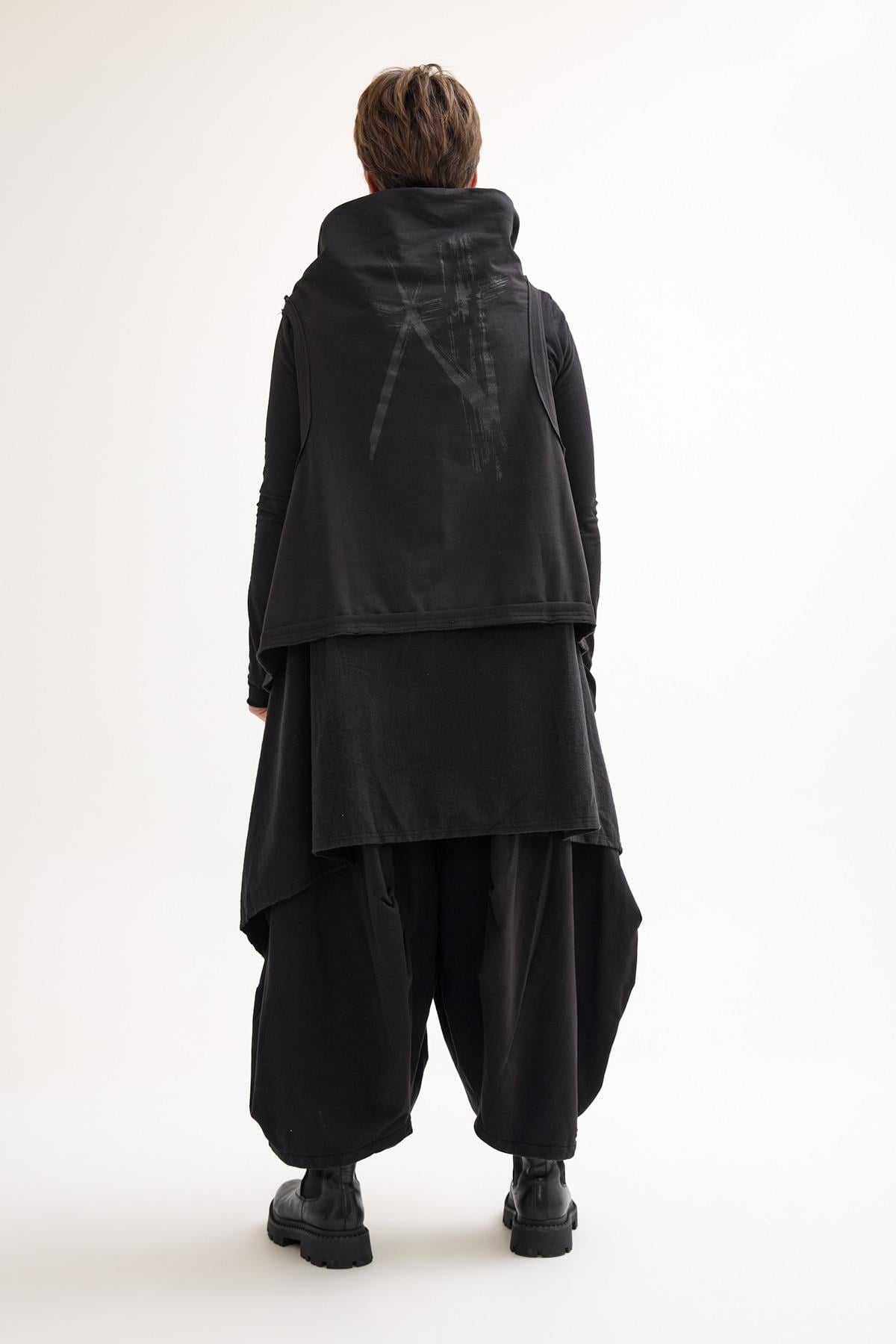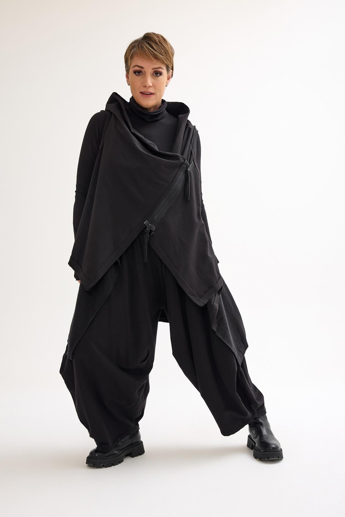 Asymmetrical zip cotton vest with a high-low hem, designed as a versatile layering piece.