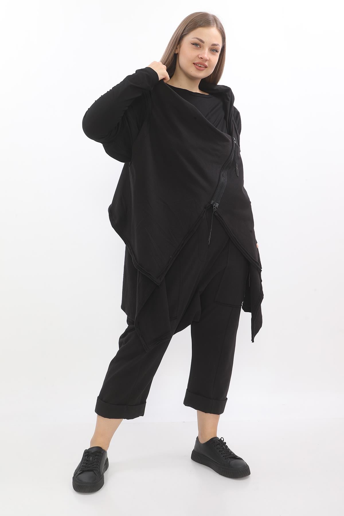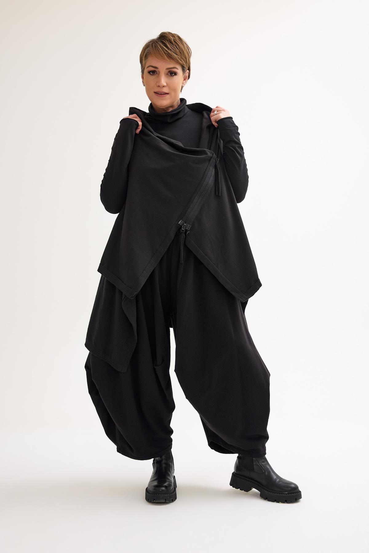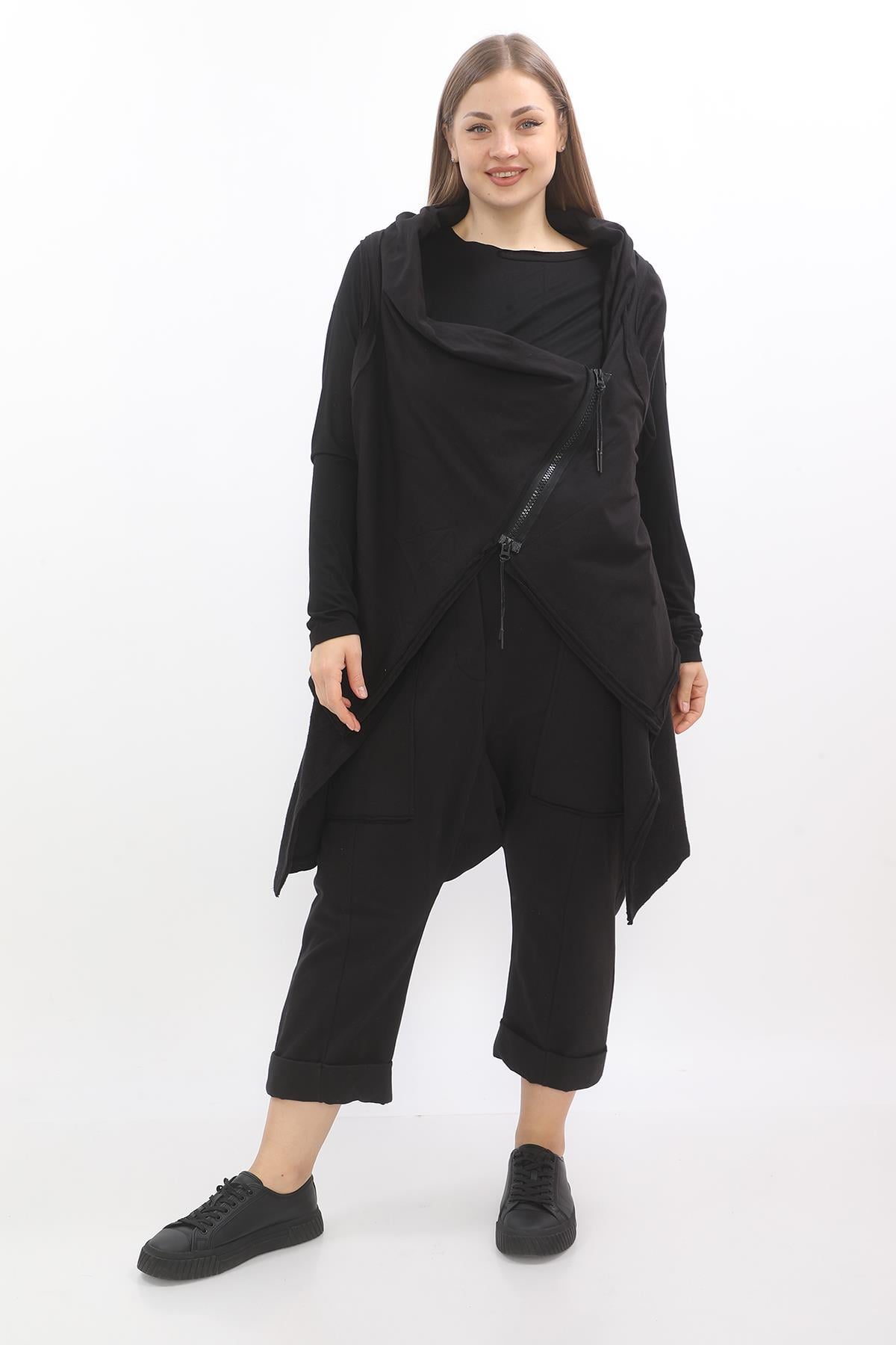 Asymmetrical zip cotton vest with a high-low hem, designed as a versatile layering piece.