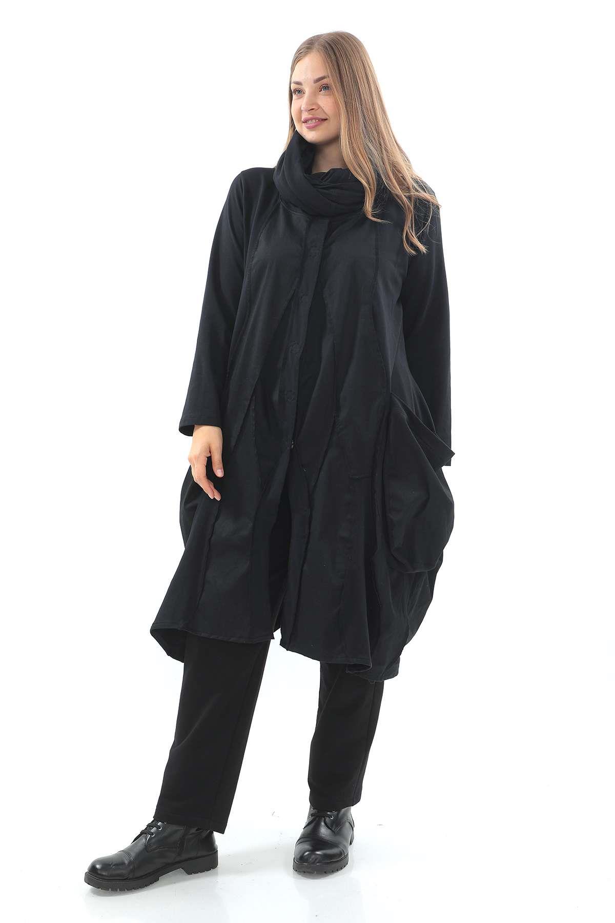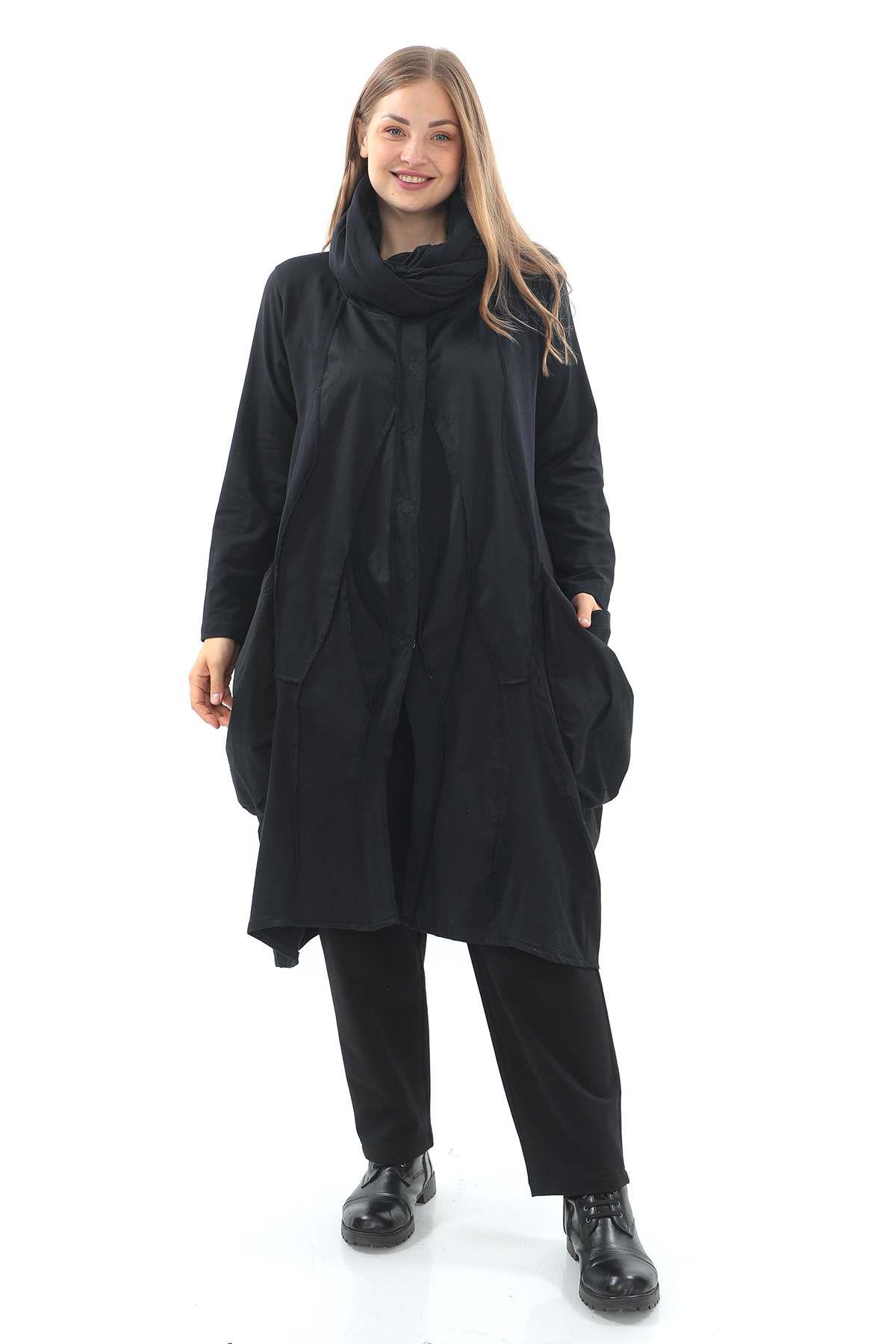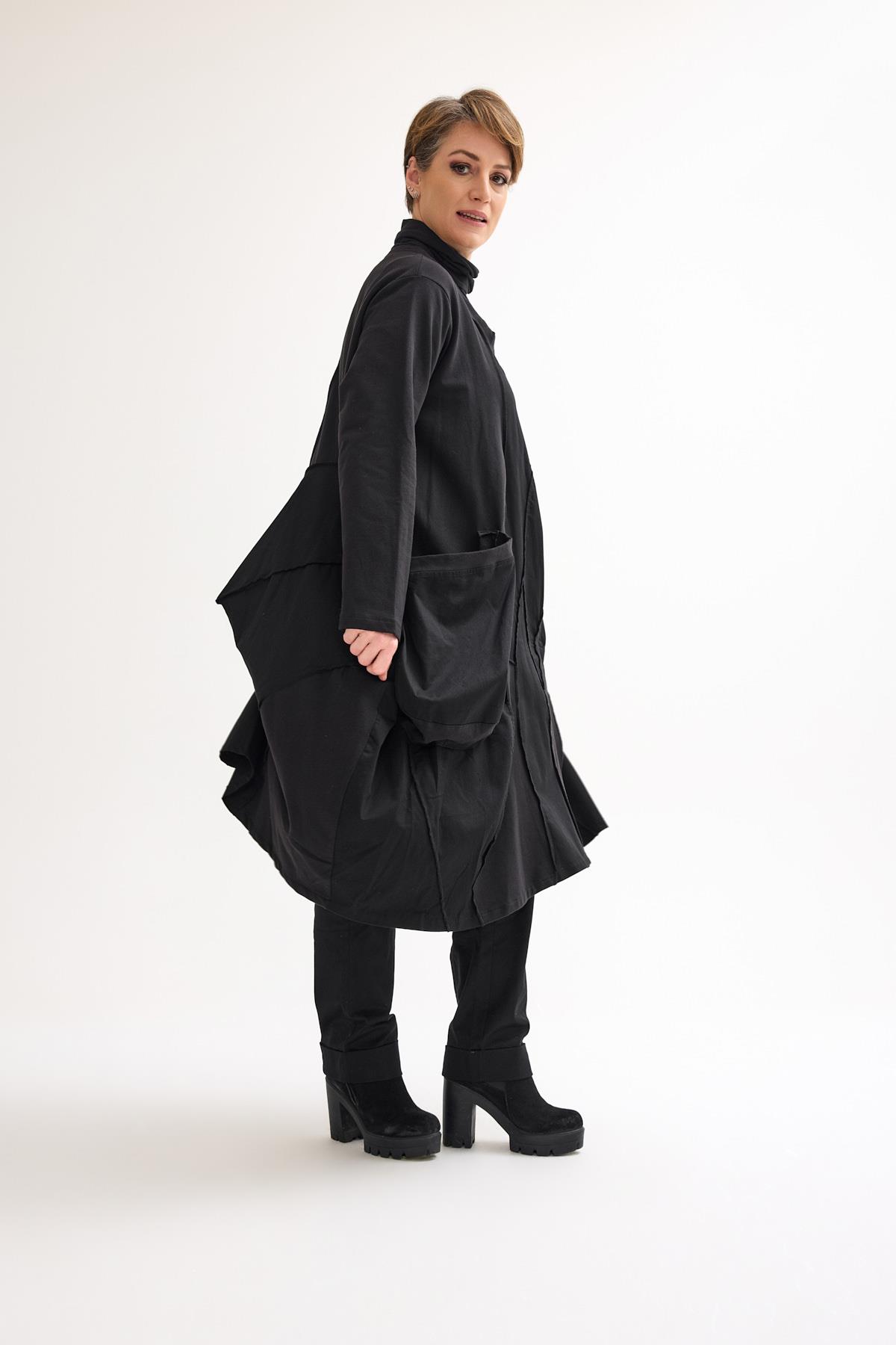 Modern long cotton jacket with an asymmetric cut, round neckline, concealed large snap closure, and refined back detailing. A stylish and unique avant-garde piece designed for timeless appeal – perfect for wholesale collections and retail fashion buyers.