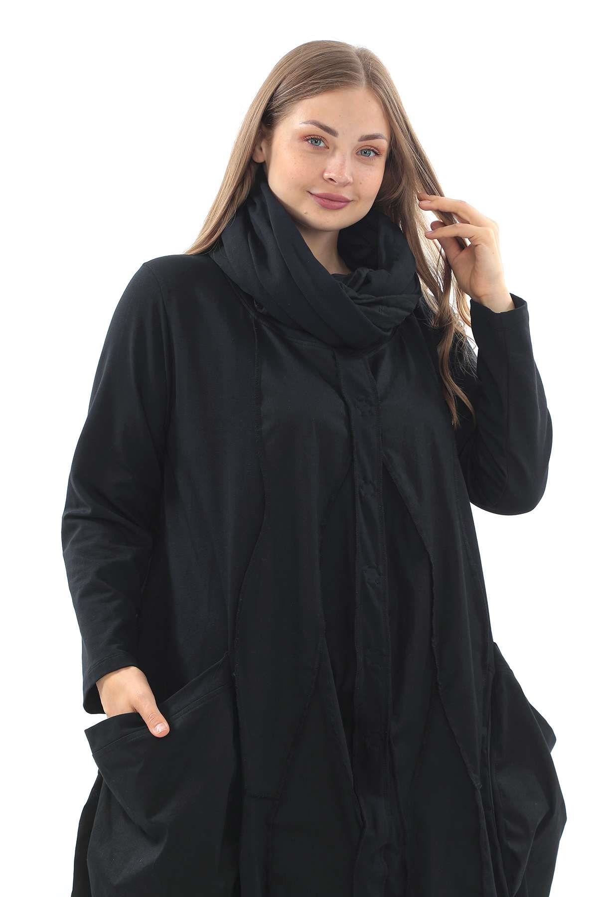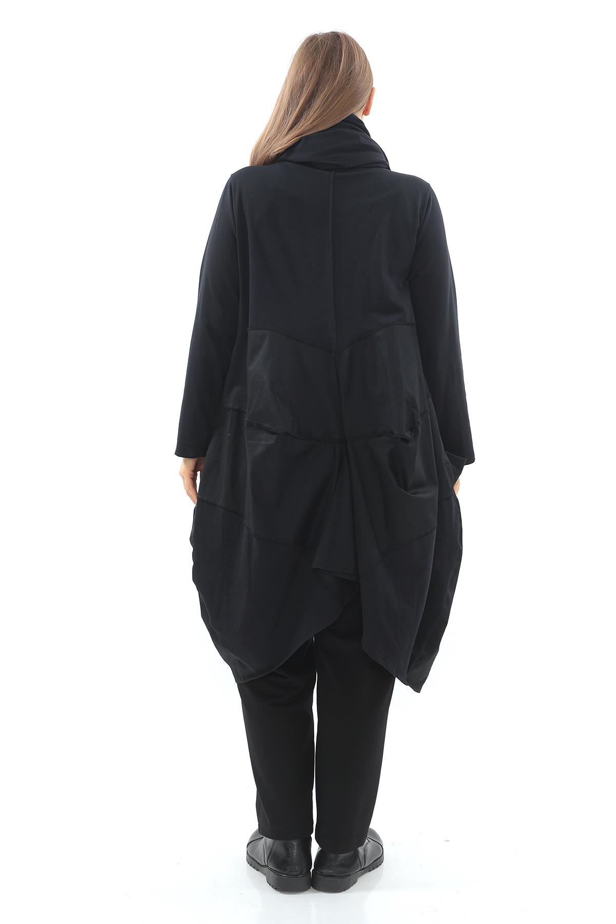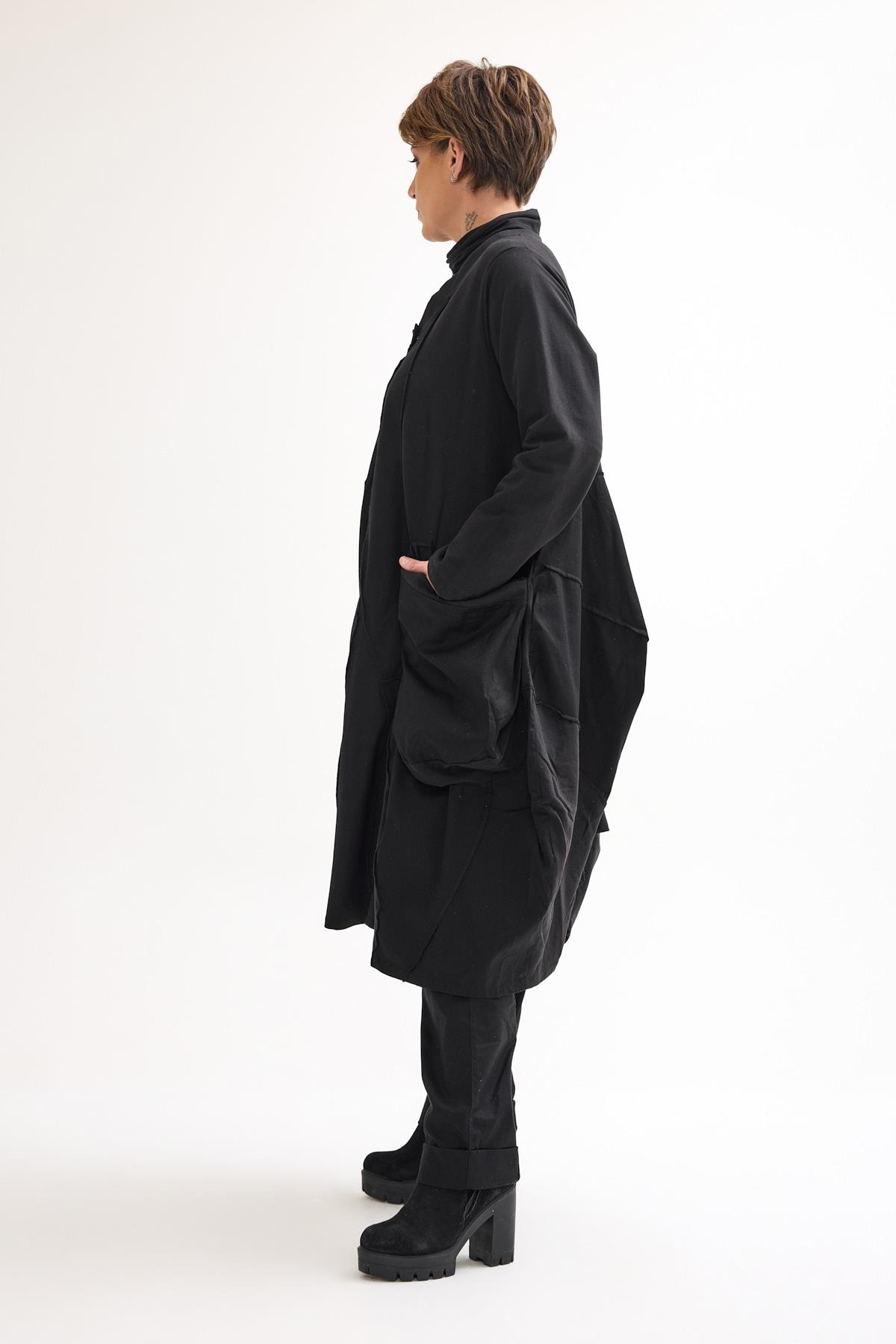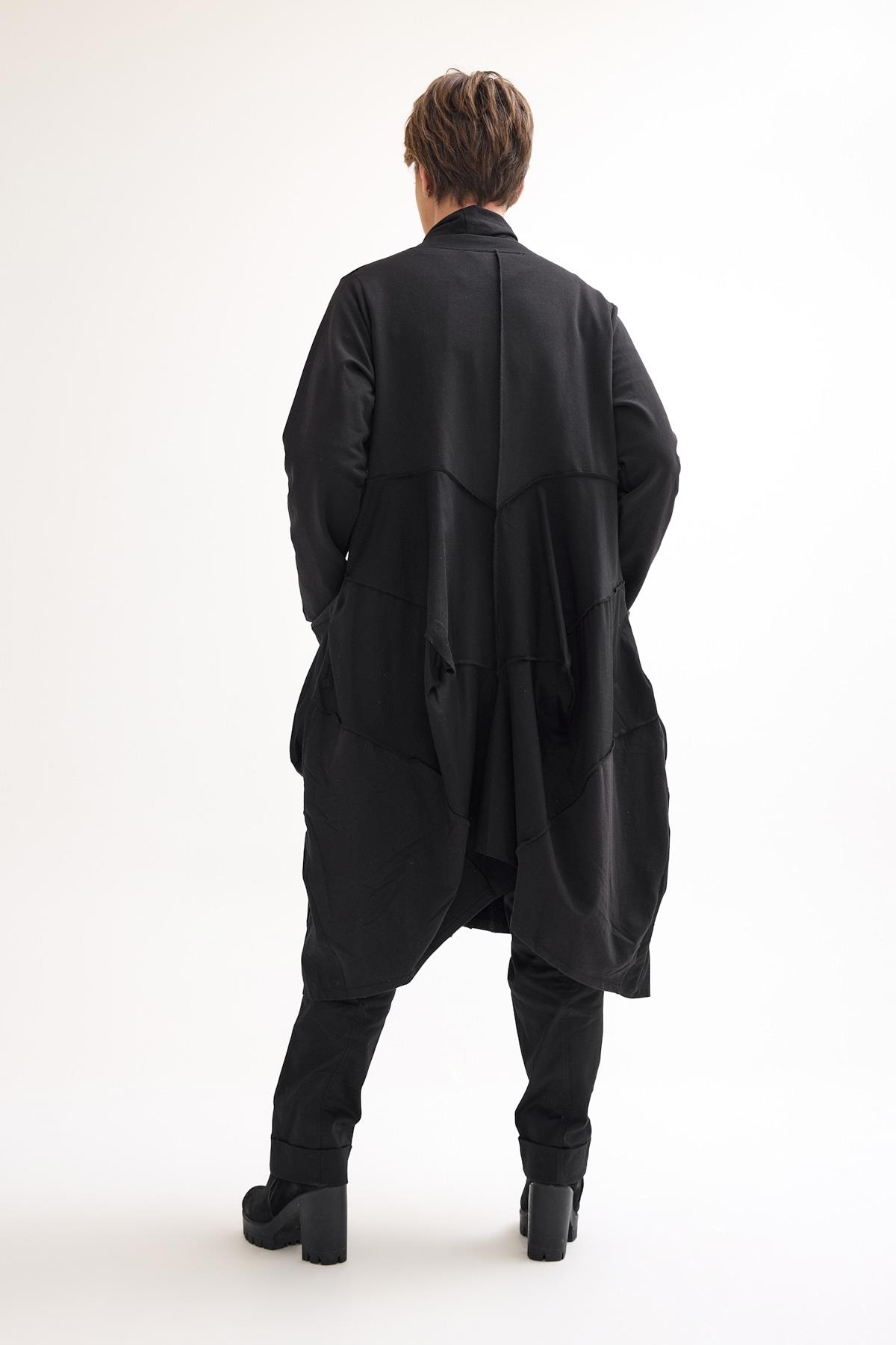 Modern long cotton jacket with an asymmetric cut, round neckline, concealed large snap closure, and refined back detailing. A stylish and unique avant-garde piece designed for timeless appeal – perfect for wholesale collections and retail fashion buyers.
