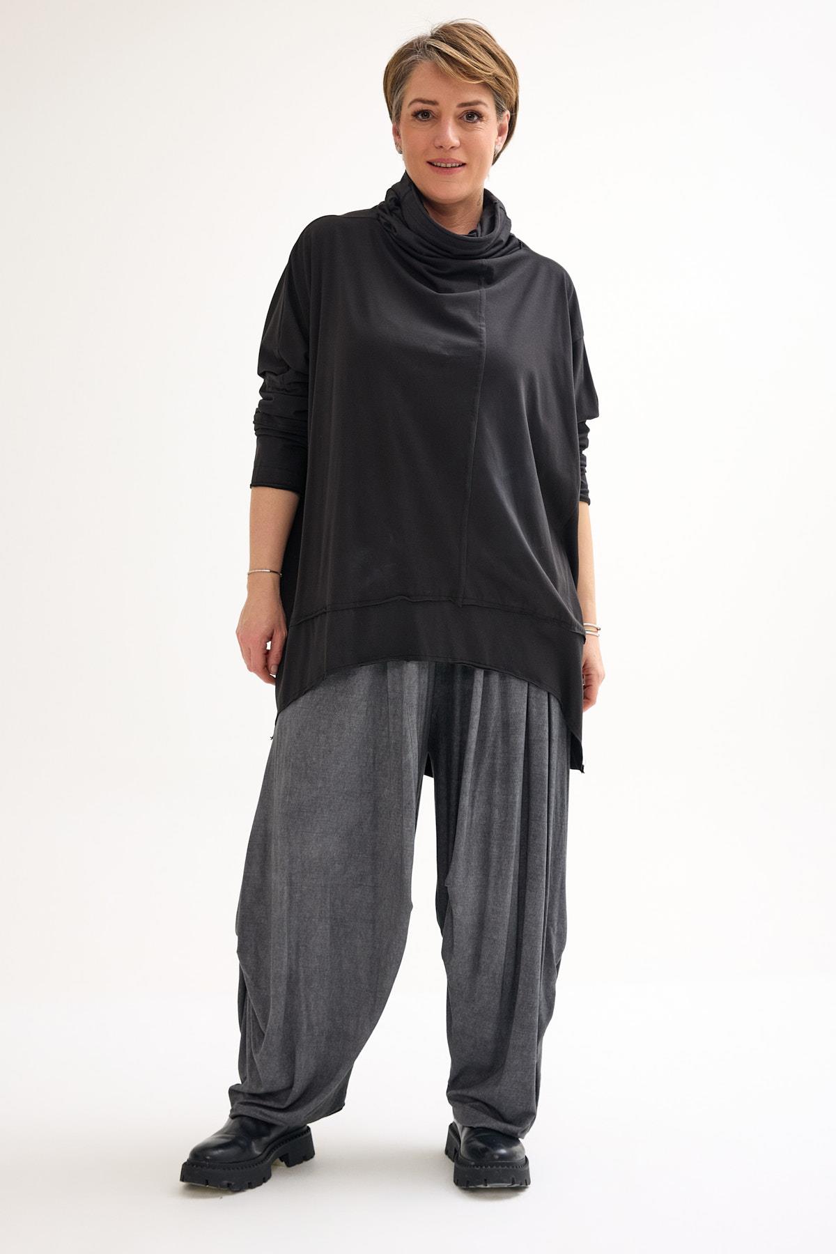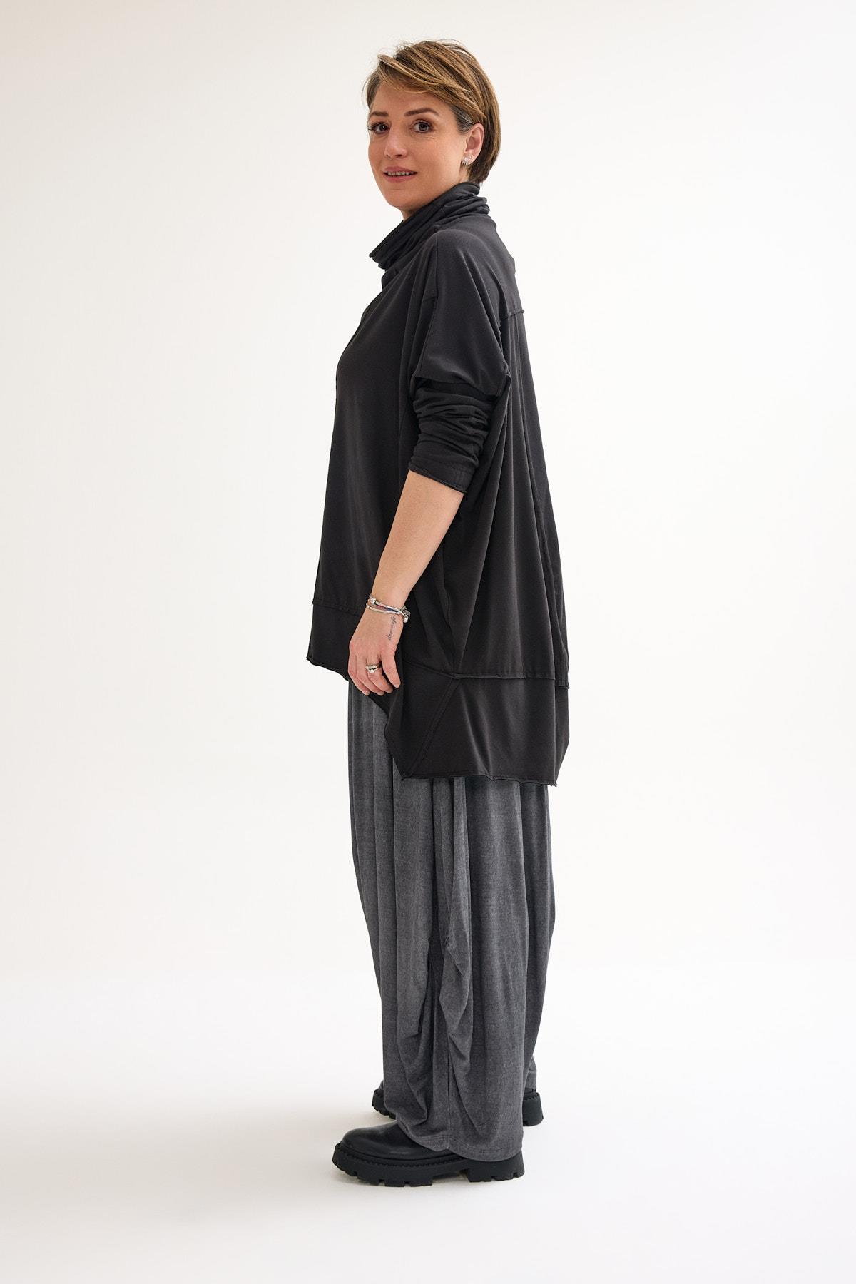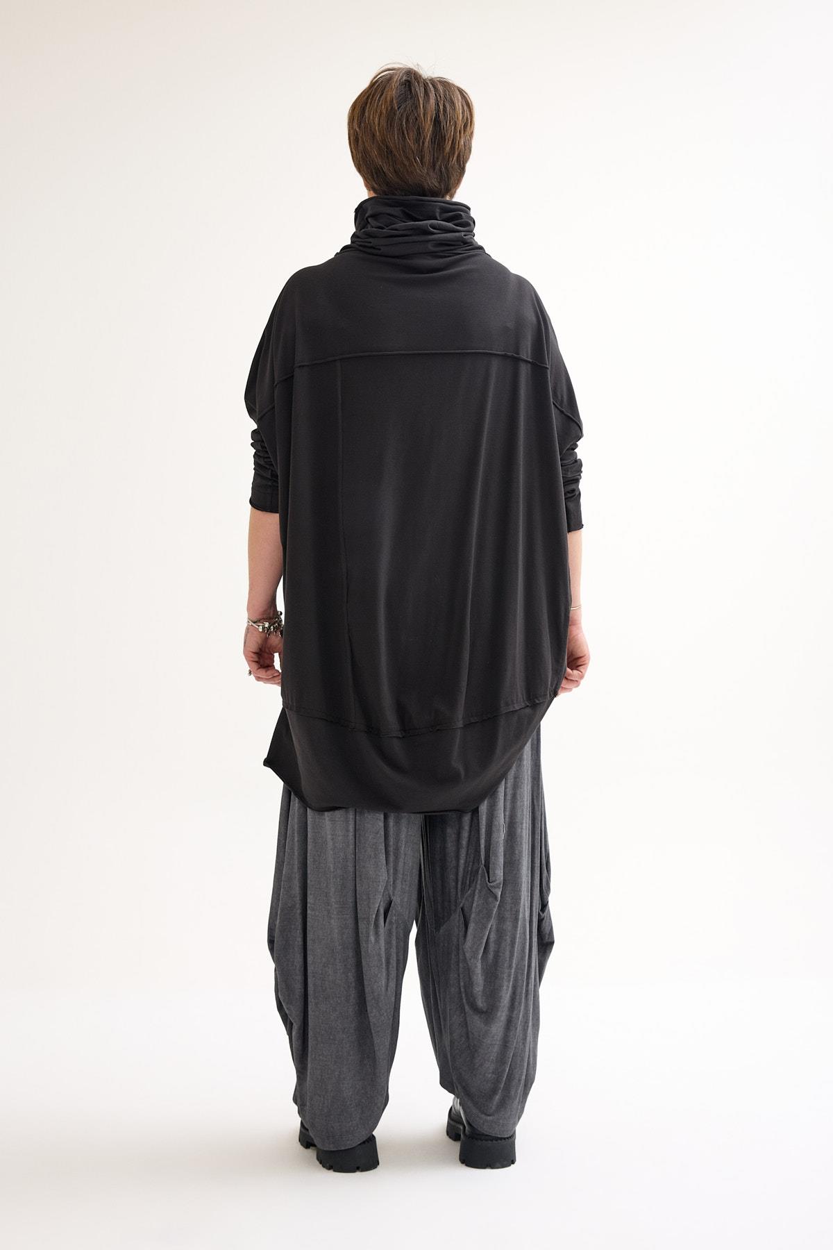 Oversized Cotton Tunic with Draped Neckline and Asymmetric Hem An avant-garde cotton tunic featuring a relaxed draped neckline, long sleeves, and a high-low asymmetric cut, designed in an oversized silhouette for modern everyday style.