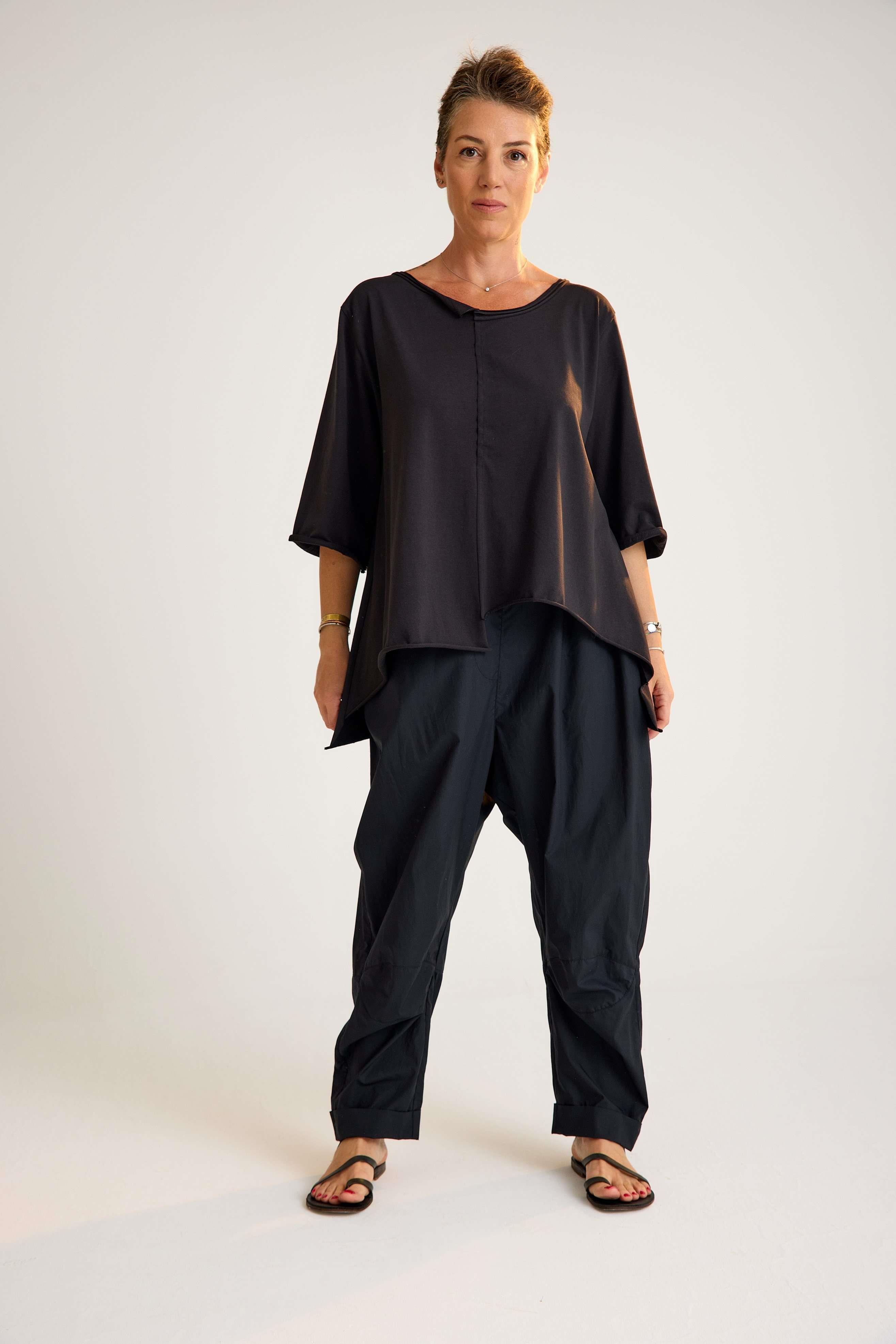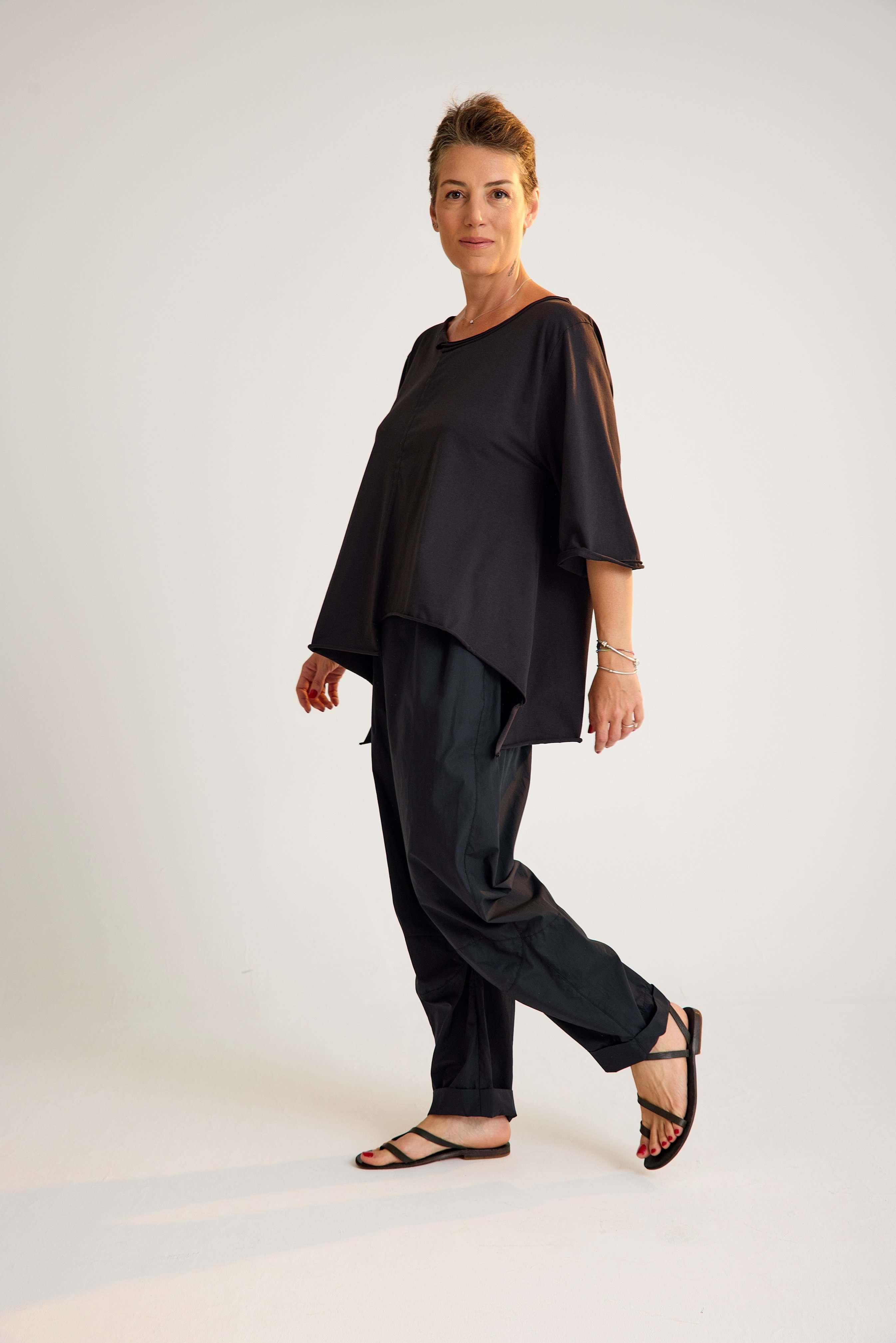 Oversize Cotton Tunic – Modern Cut, Relaxed Elegance This oversize cotton tunic features three-quarter sleeves and an oval neckline for a clean, versatile look. Designed with a high-low hemline — shorter in the front and longer at the back — it creates an effortless flow and contemporary silhouette. Crafted from soft cotton with a touch of stretch, the tunic offers breathable comfort and flexibility. The asymmetrical cut and relaxed fit make it easy to style for both casual and chic occasions. Key features: 3/4 length sleeves (truvakar style) Oval neckline for a modern touch High-low hemline (shorter front, longer back) Oversize fit with relaxed movement 97% cotton, 3% elastane for comfort and stretch A timeless yet modern tunic that combines comfort, elegance, and everyday versatility.