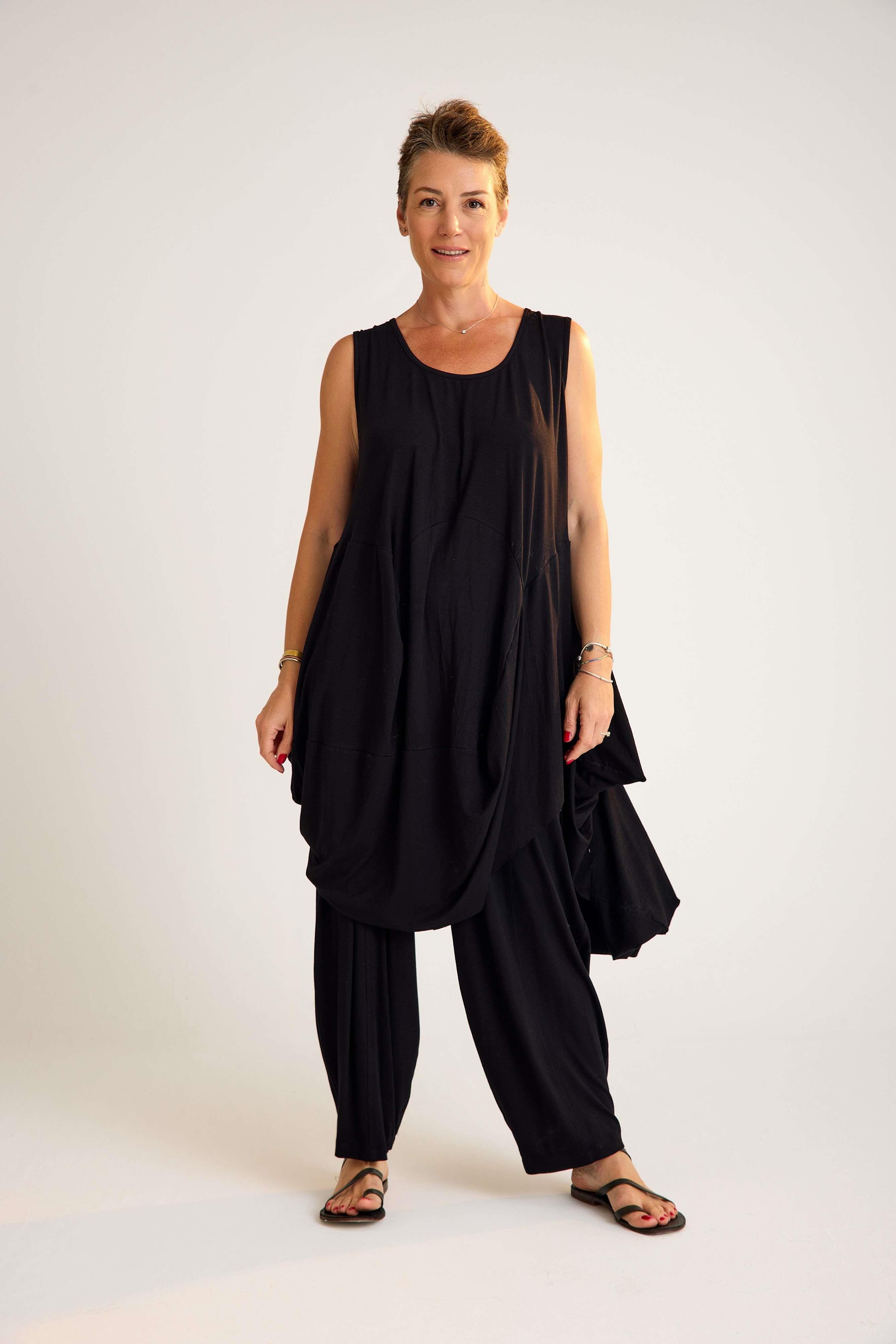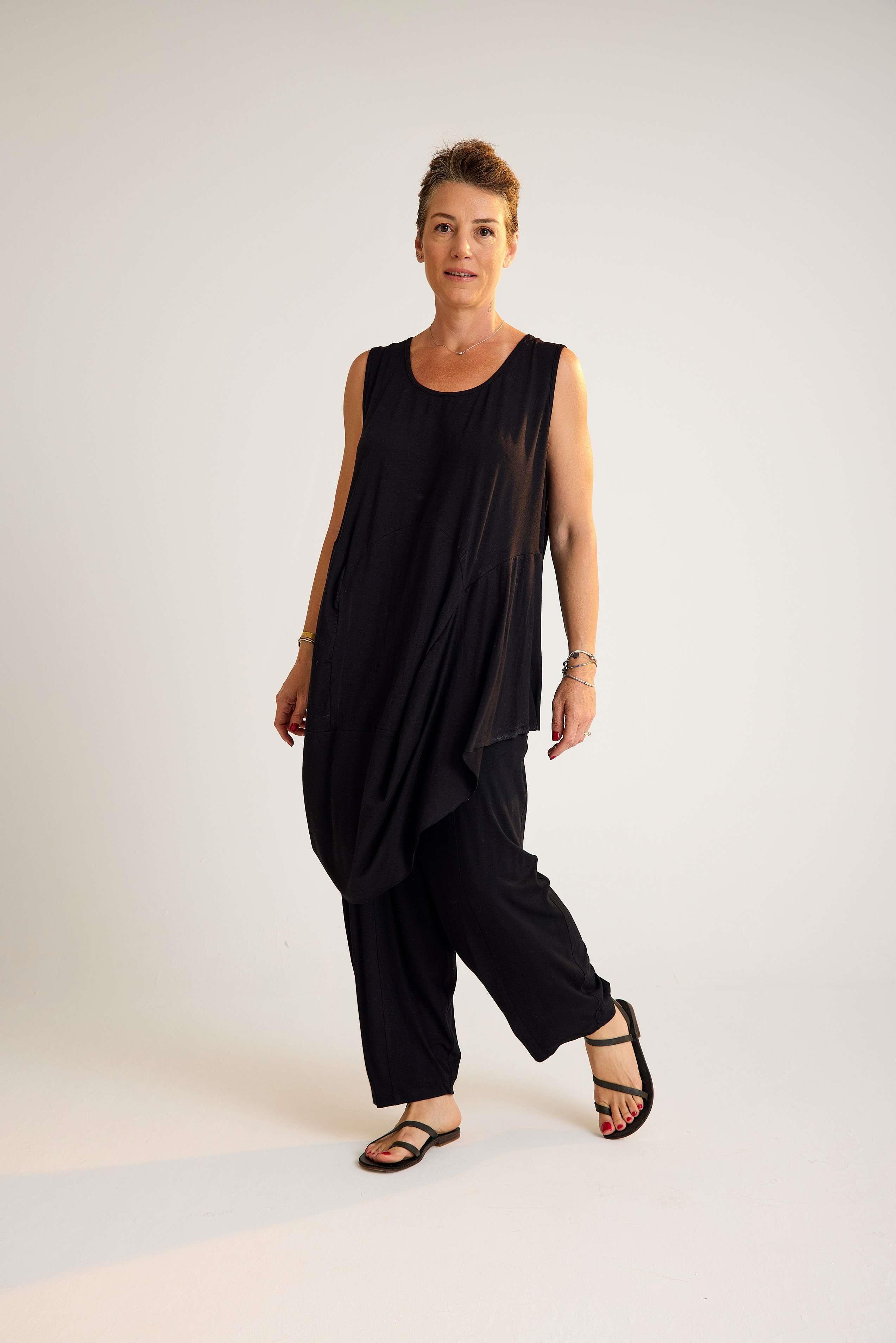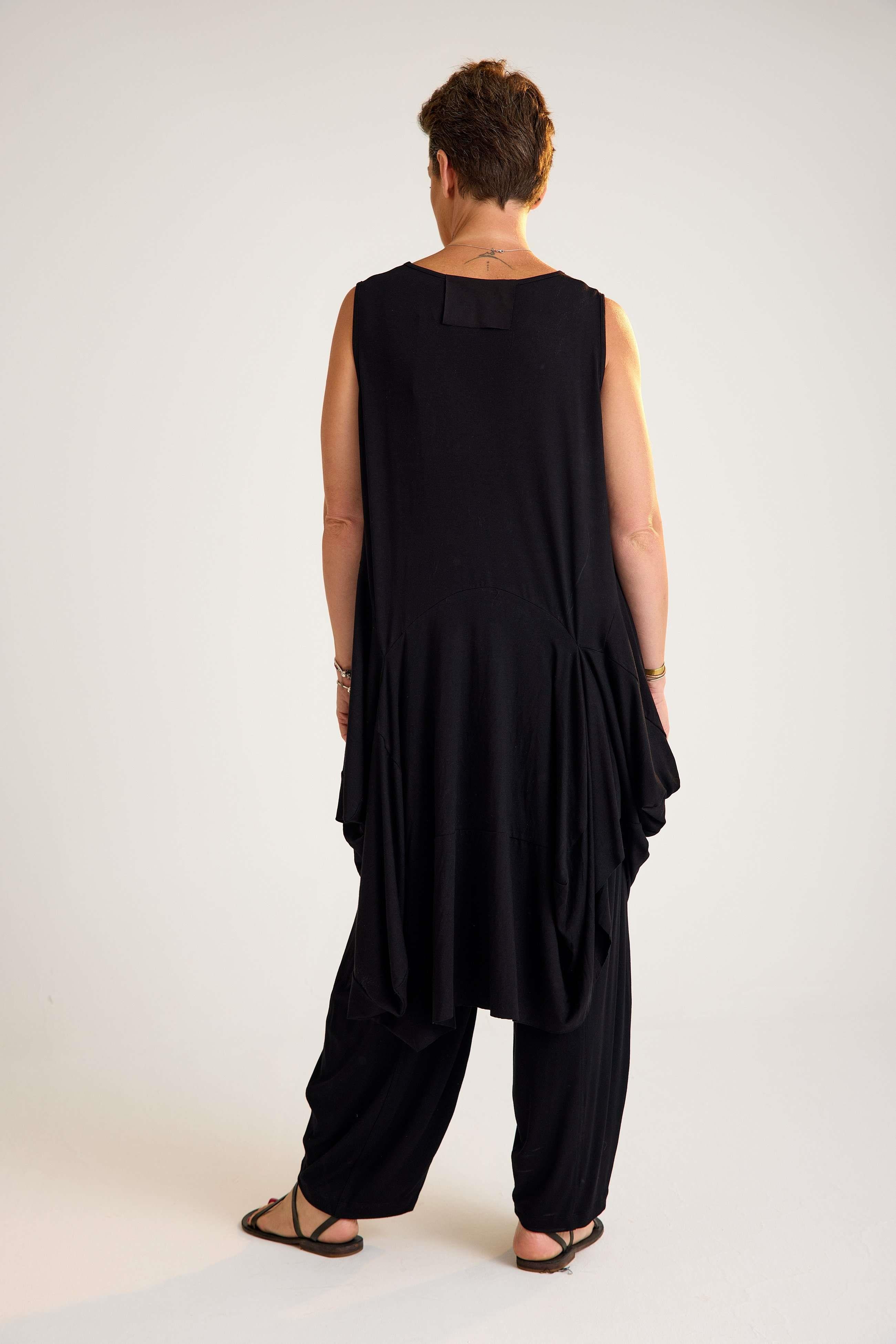 Oversized Sleeveless Viscose Tunic with Asymmetric Draped Hem A sleeveless viscose tunic featuring an asymmetric cut with a draped hemline, designed in a relaxed oversized silhouette for effortless modern style.