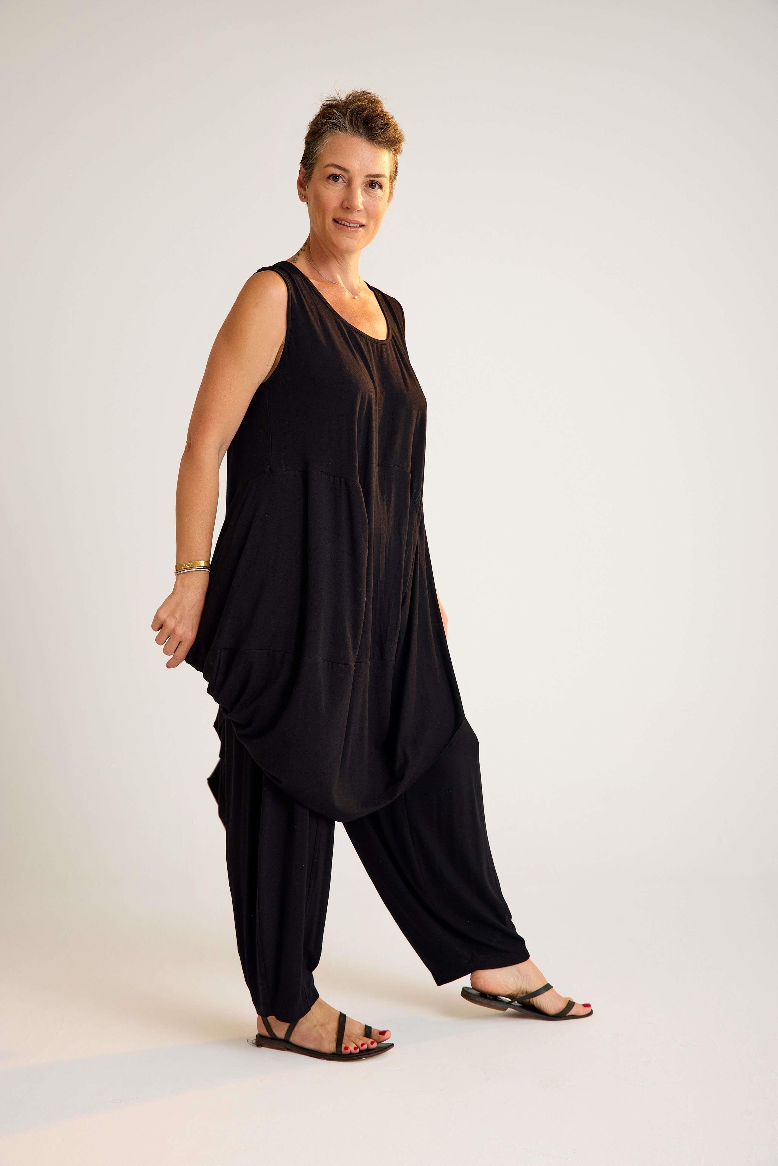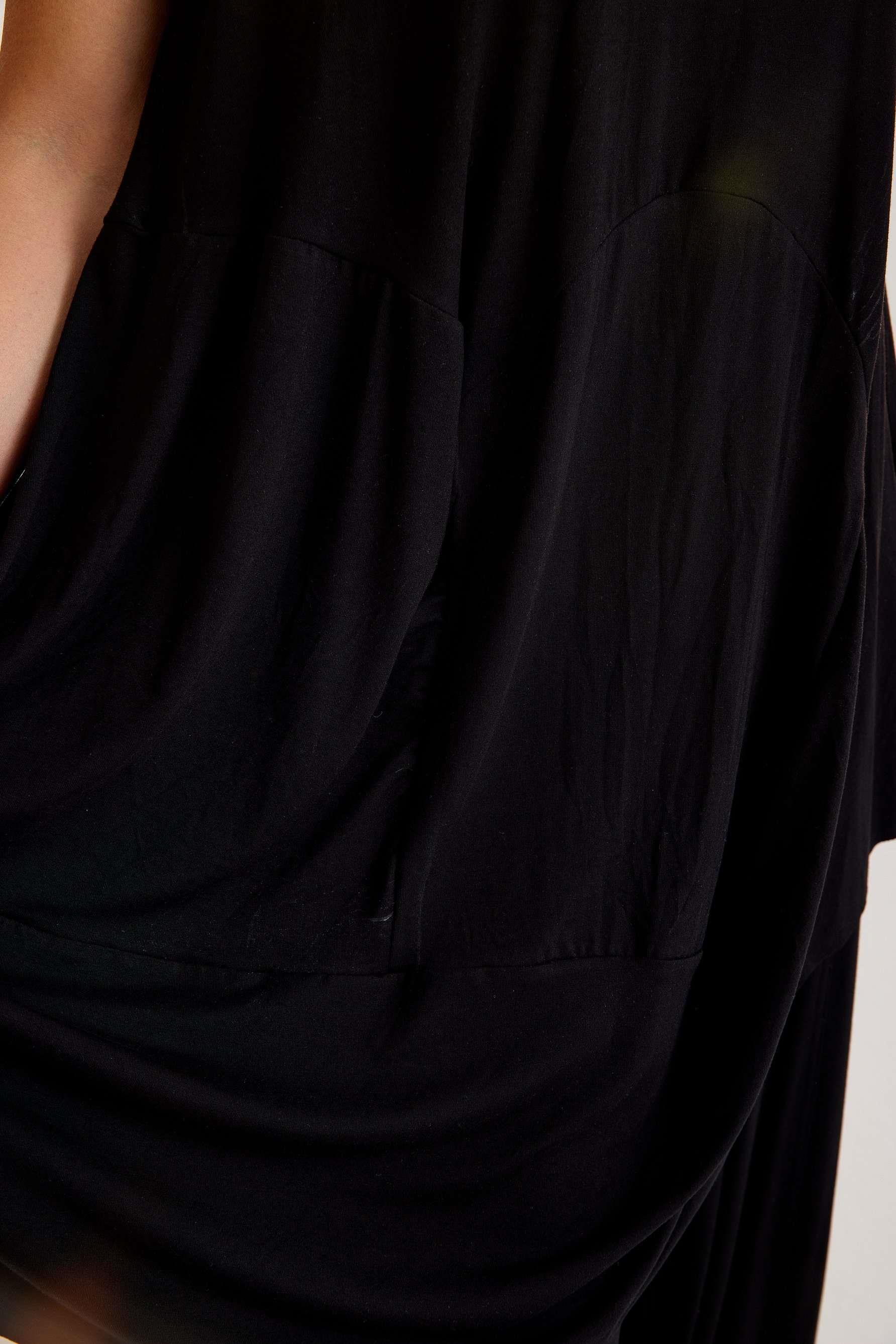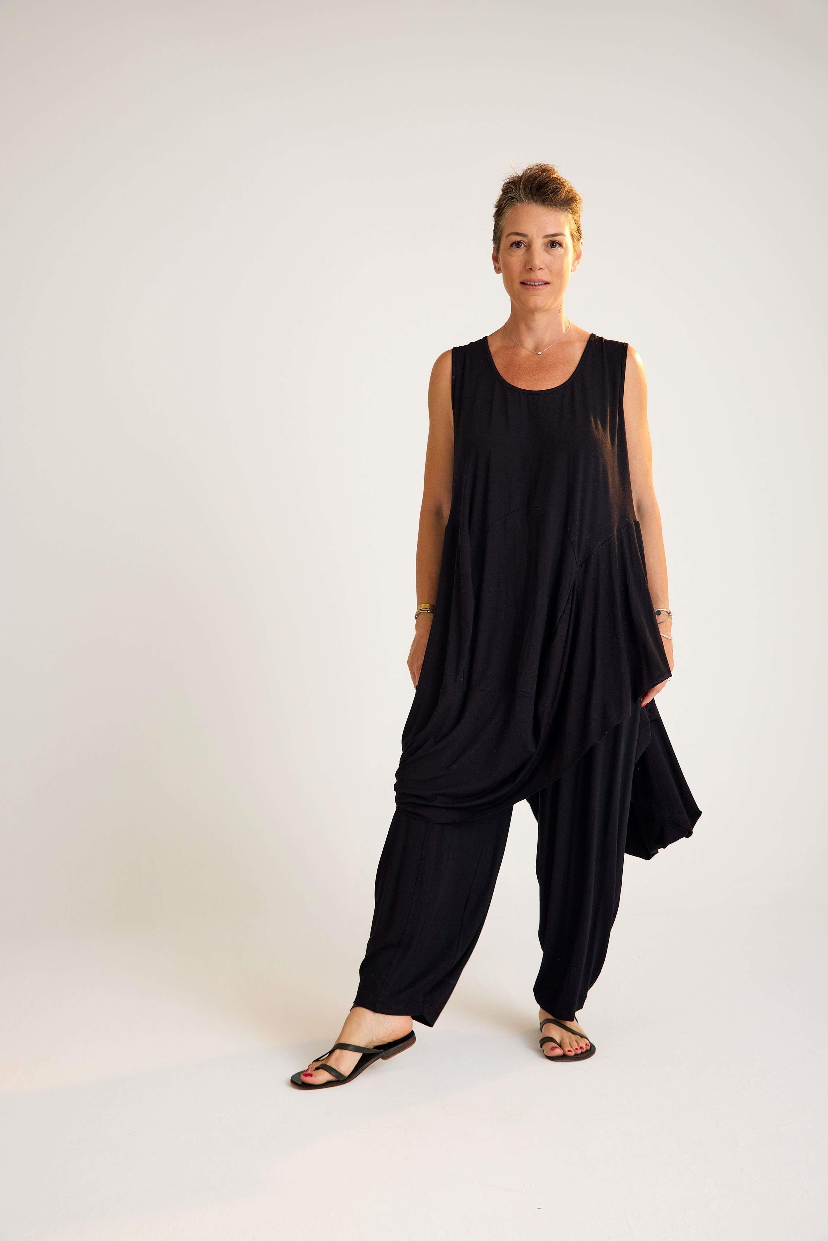 Oversized Sleeveless Viscose Tunic with Asymmetric Draped Hem A sleeveless viscose tunic featuring an asymmetric cut with a draped hemline, designed in a relaxed oversized silhouette for effortless modern style.