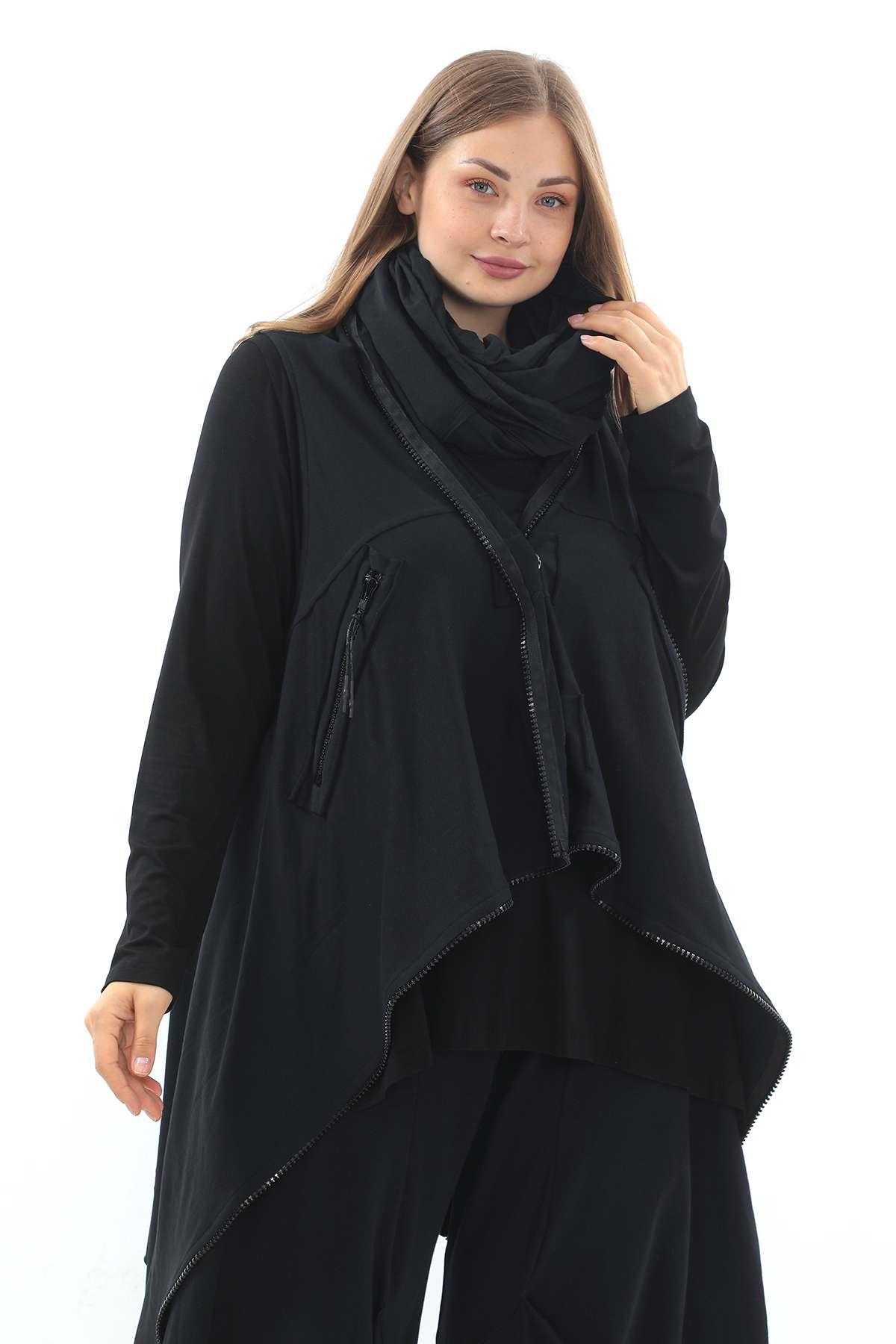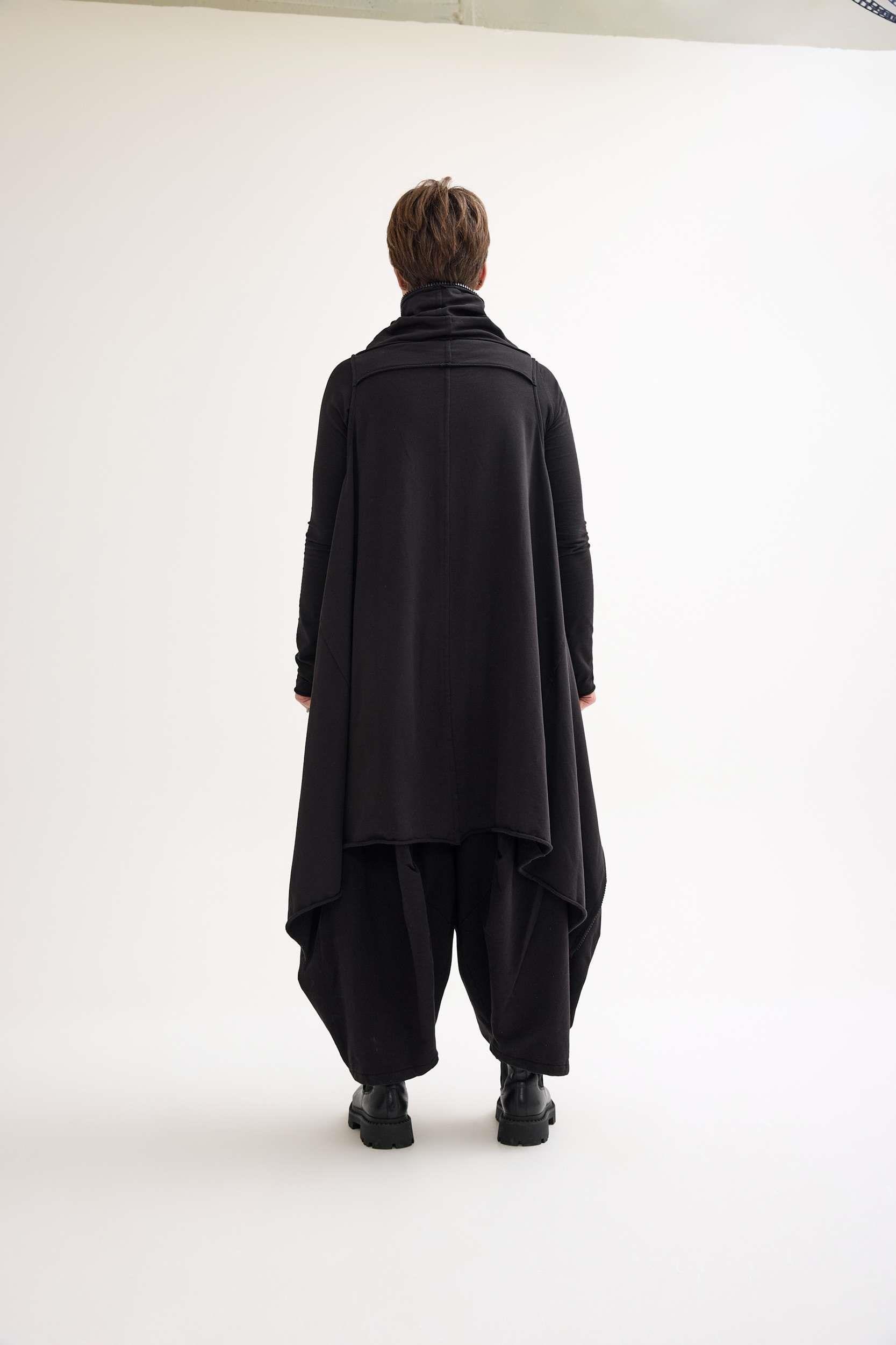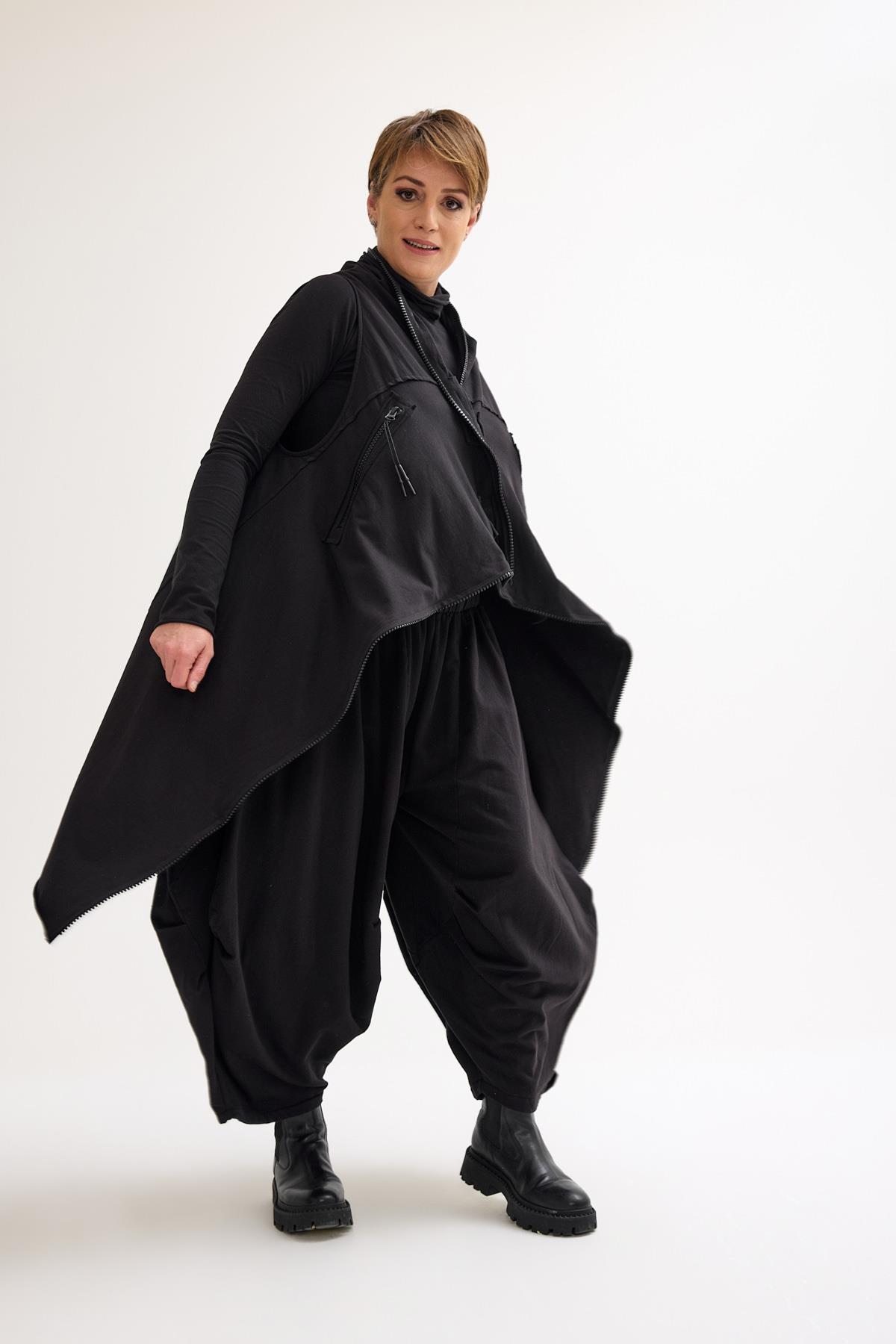 Asymmetric Cotton Vest with Zipper Details and Oversized Pockets An avant-garde cotton vest featuring zipper accents on the collar and hem, oversized zippered pockets, hidden snap fastenings, and a modern high-low cut for versatile layered styling.