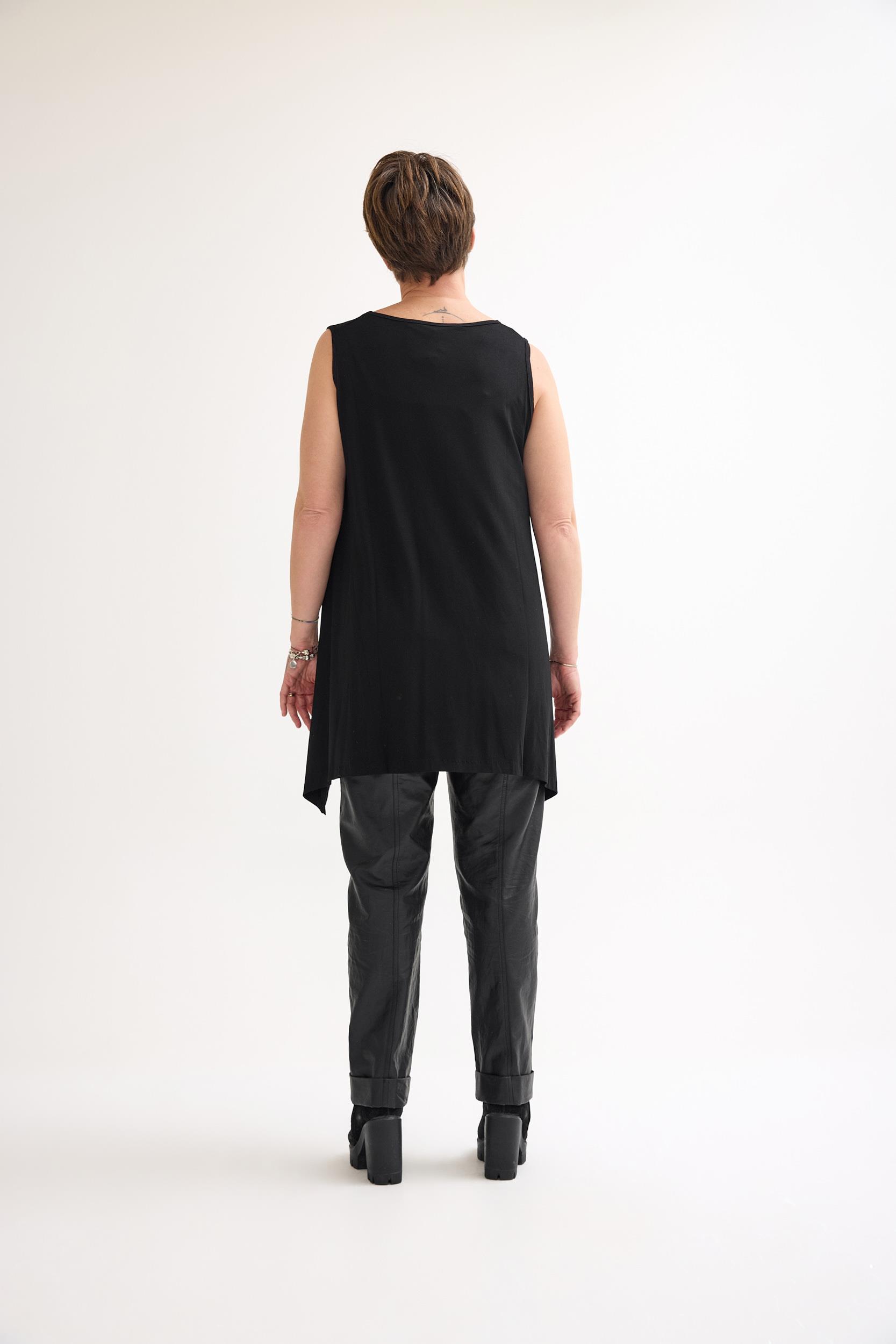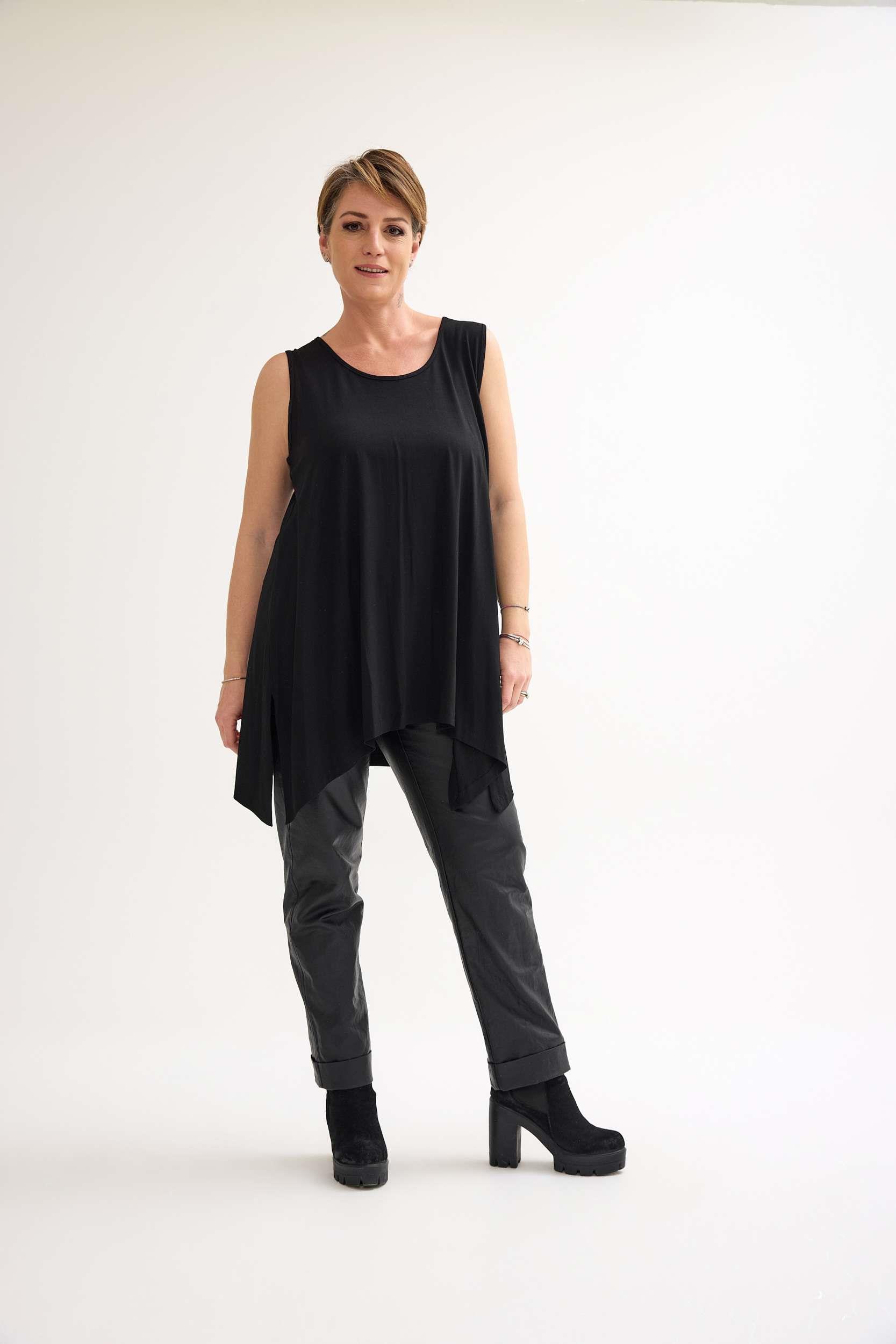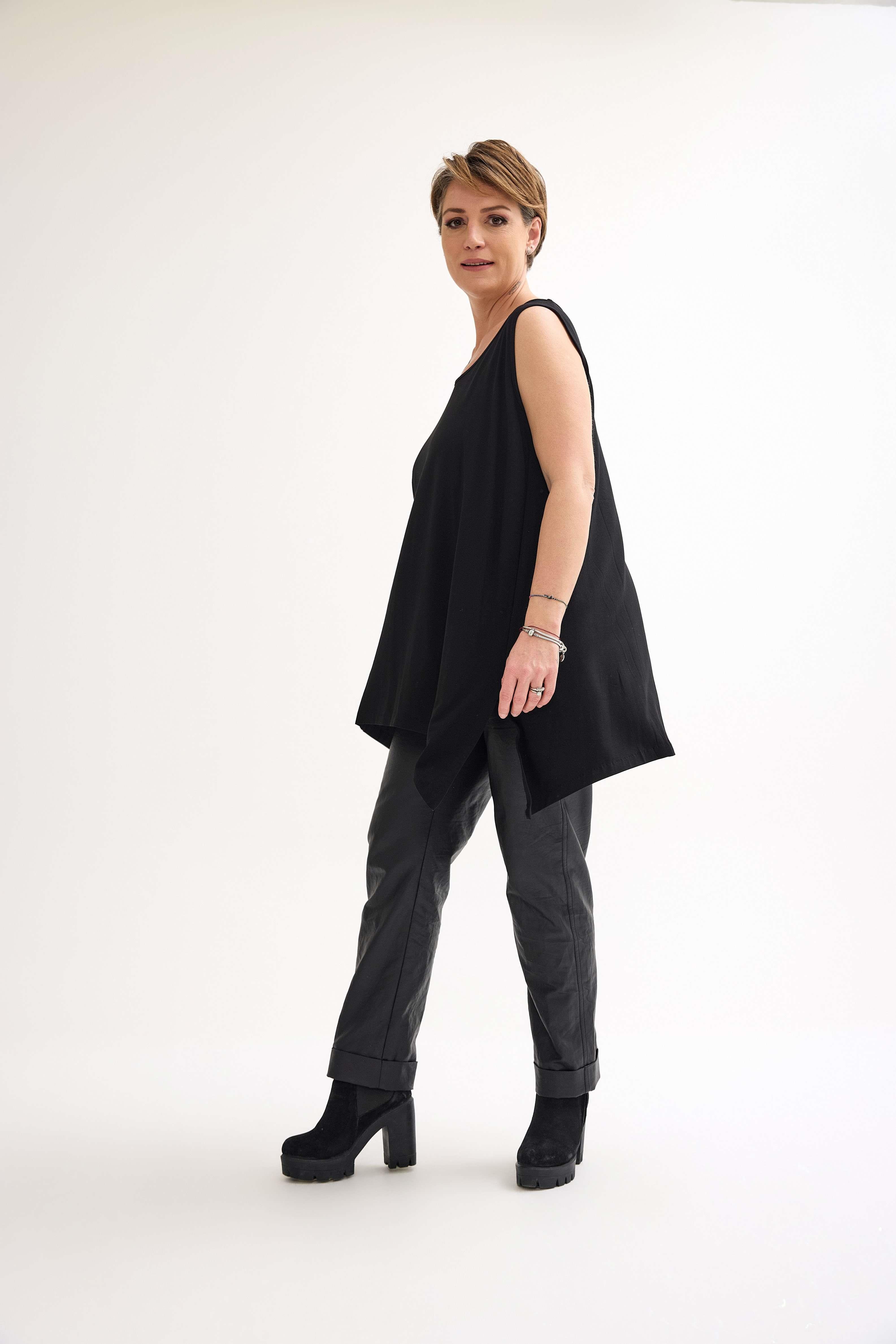 Sleeveless viscose blouse with a round neckline, asymmetric cut, and subtle side slit. Designed with a stretchy fabric for all-day comfort, making it a versatile choice for everyday styling