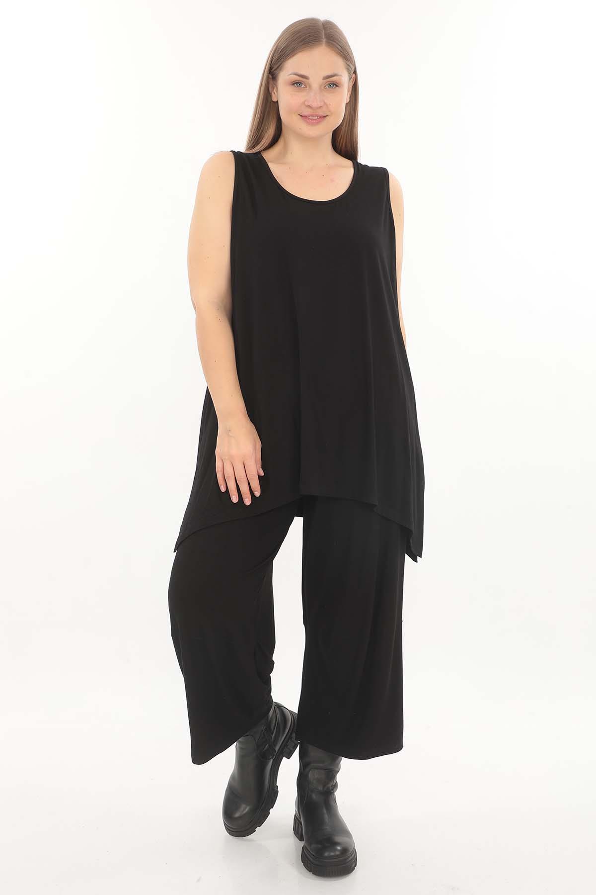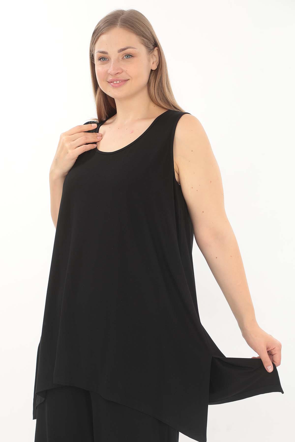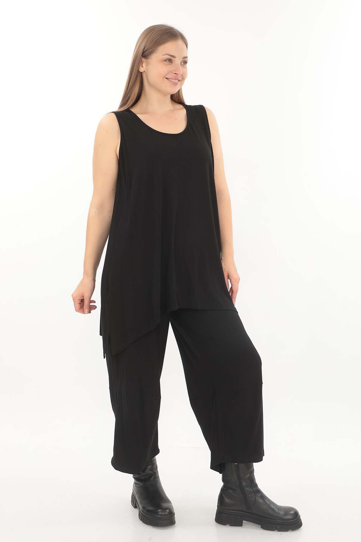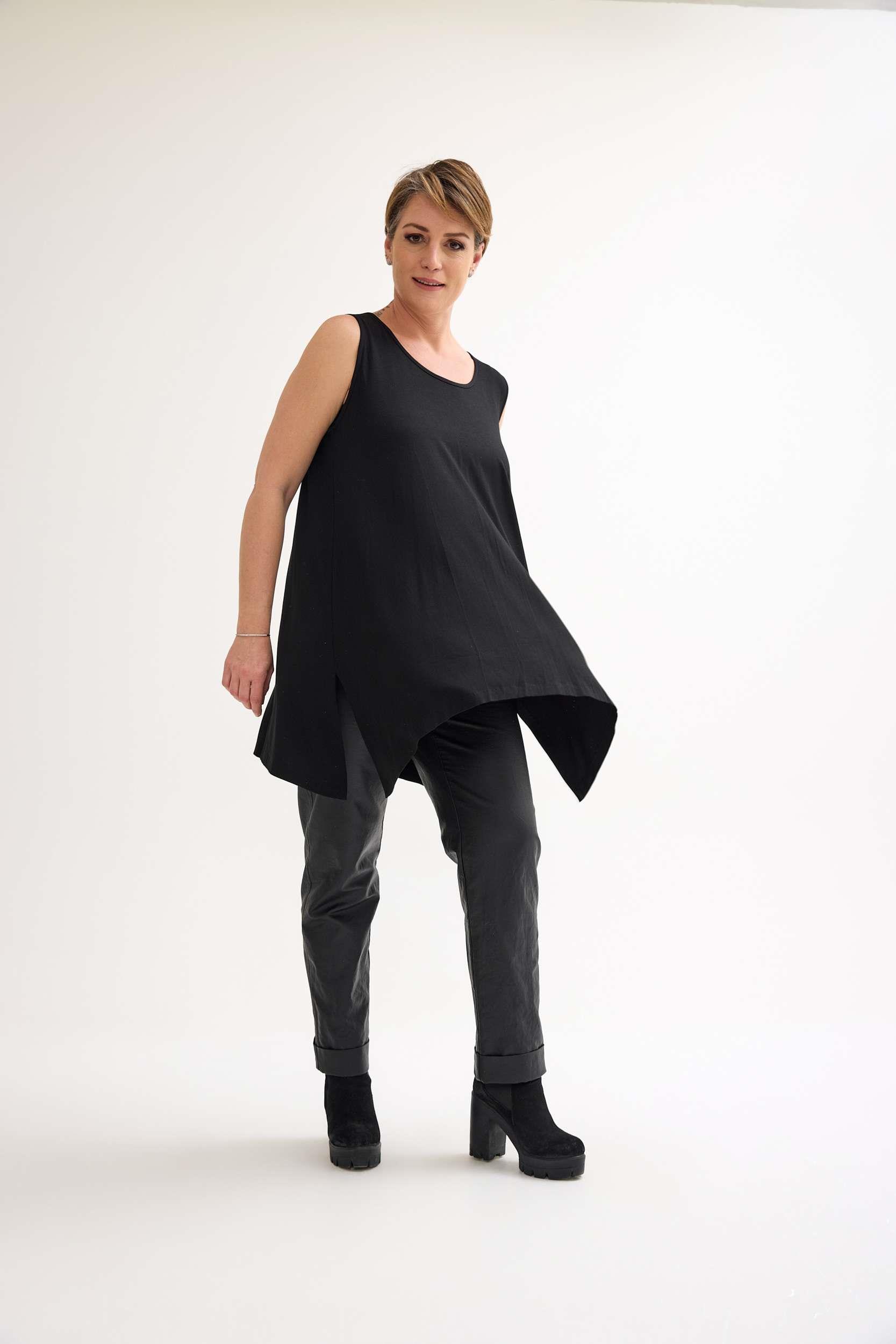 Sleeveless viscose blouse with a round neckline, asymmetric cut, and subtle side slit. Designed with a stretchy fabric for all-day comfort, making it a versatile choice for everyday styling