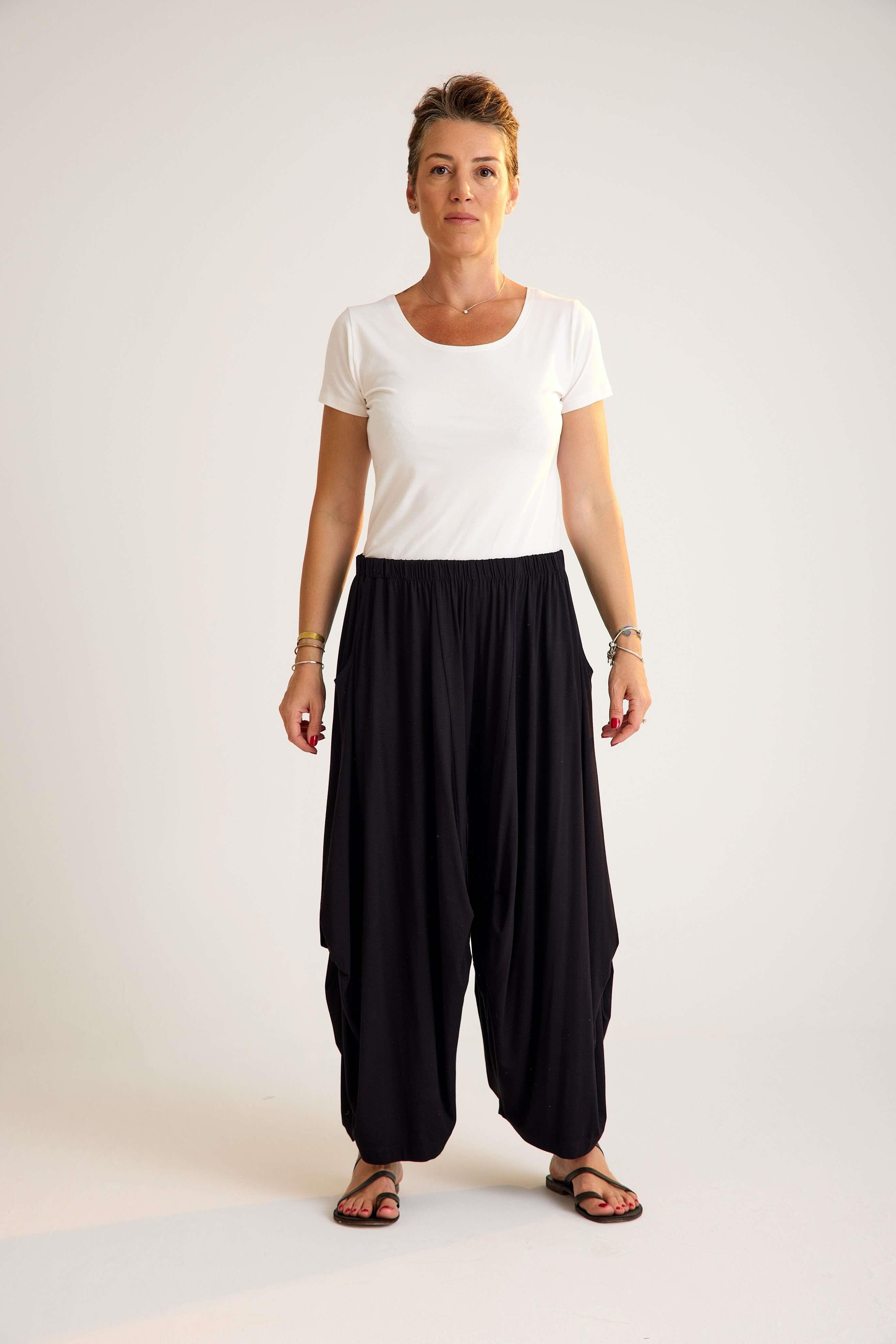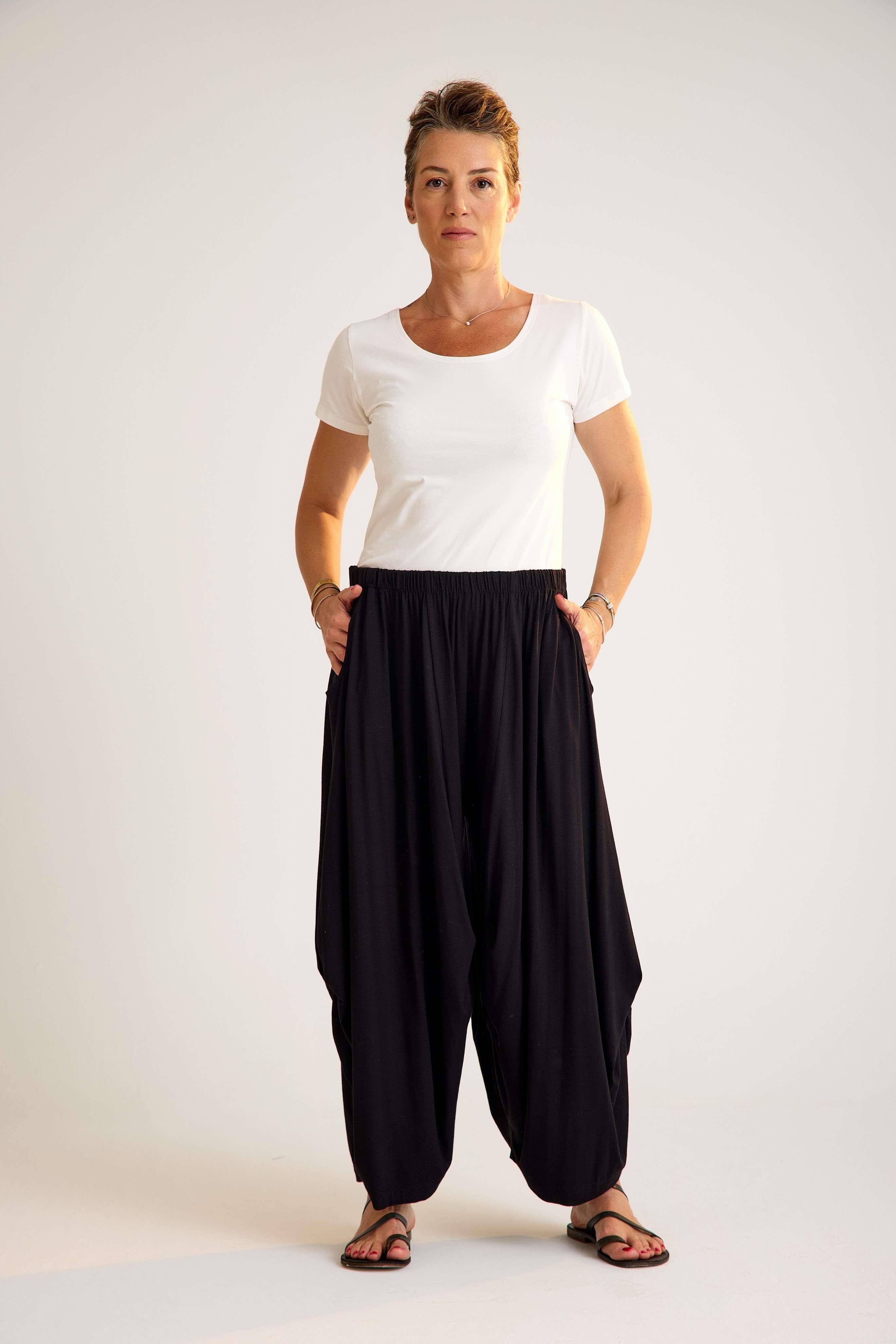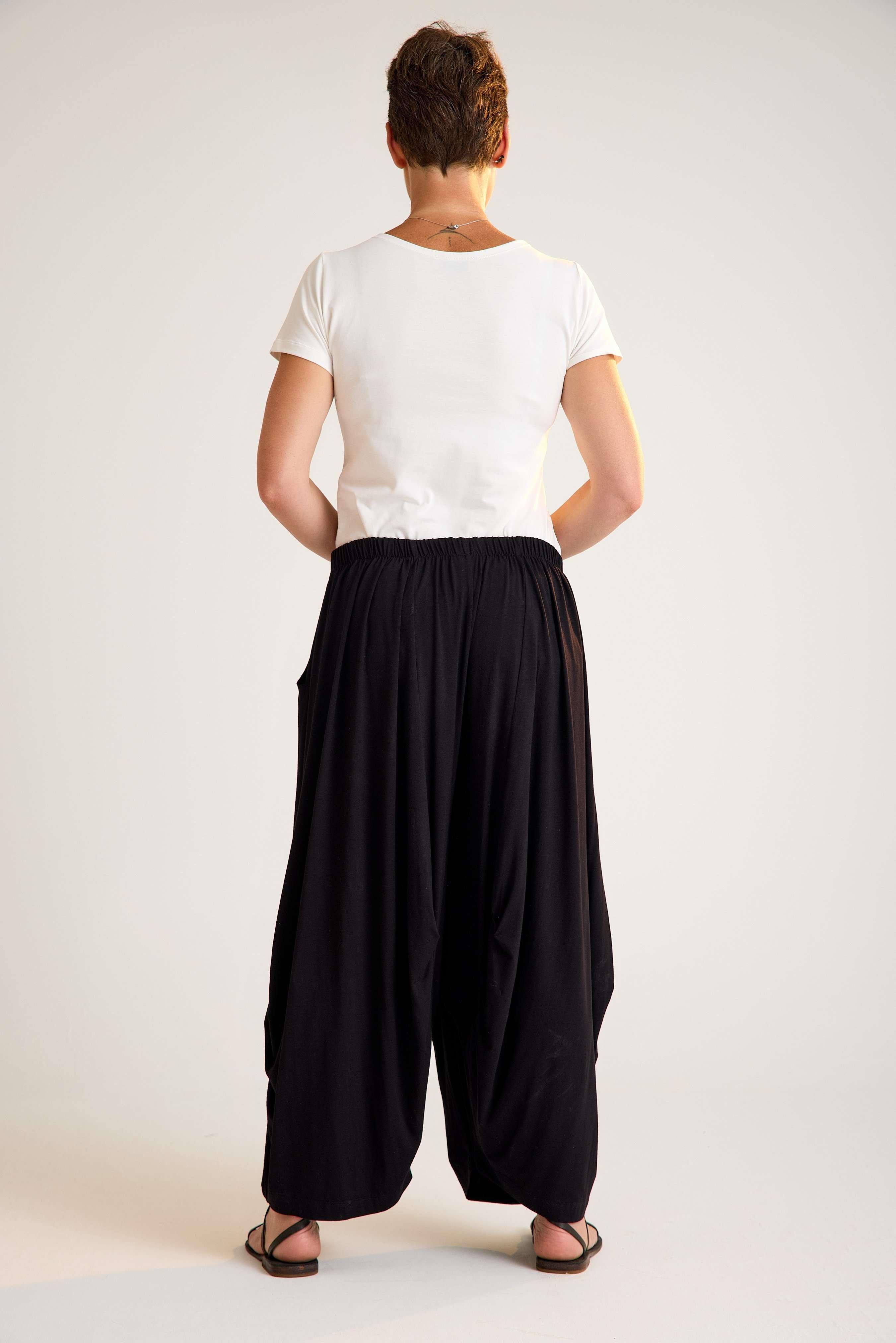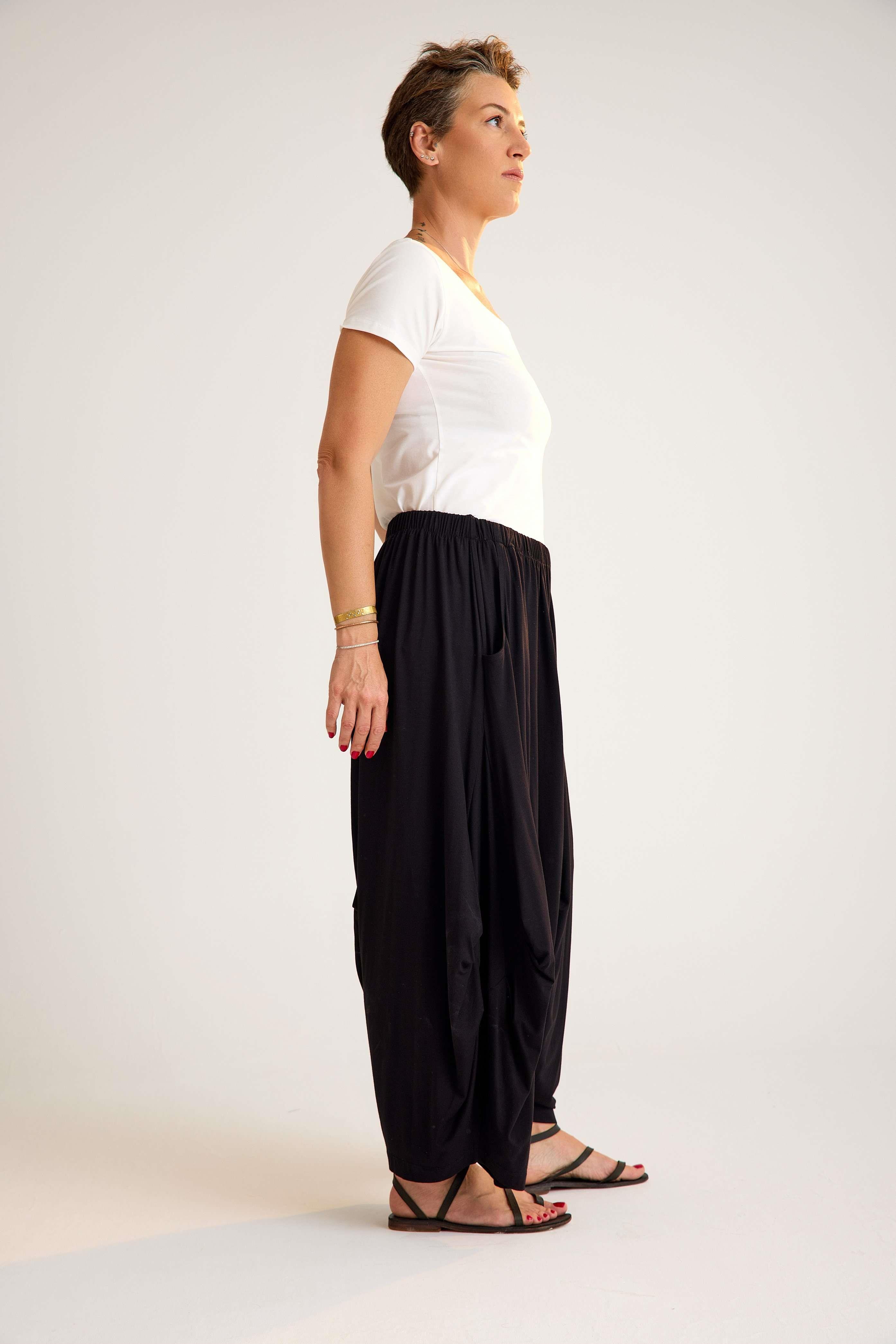 Viscose trousers with an elastic waistband – lightweight, flowy, and comfortable with a timeless avant-garde touch. A versatile piece designed for both wholesale buyers and retail fashion boutiques.