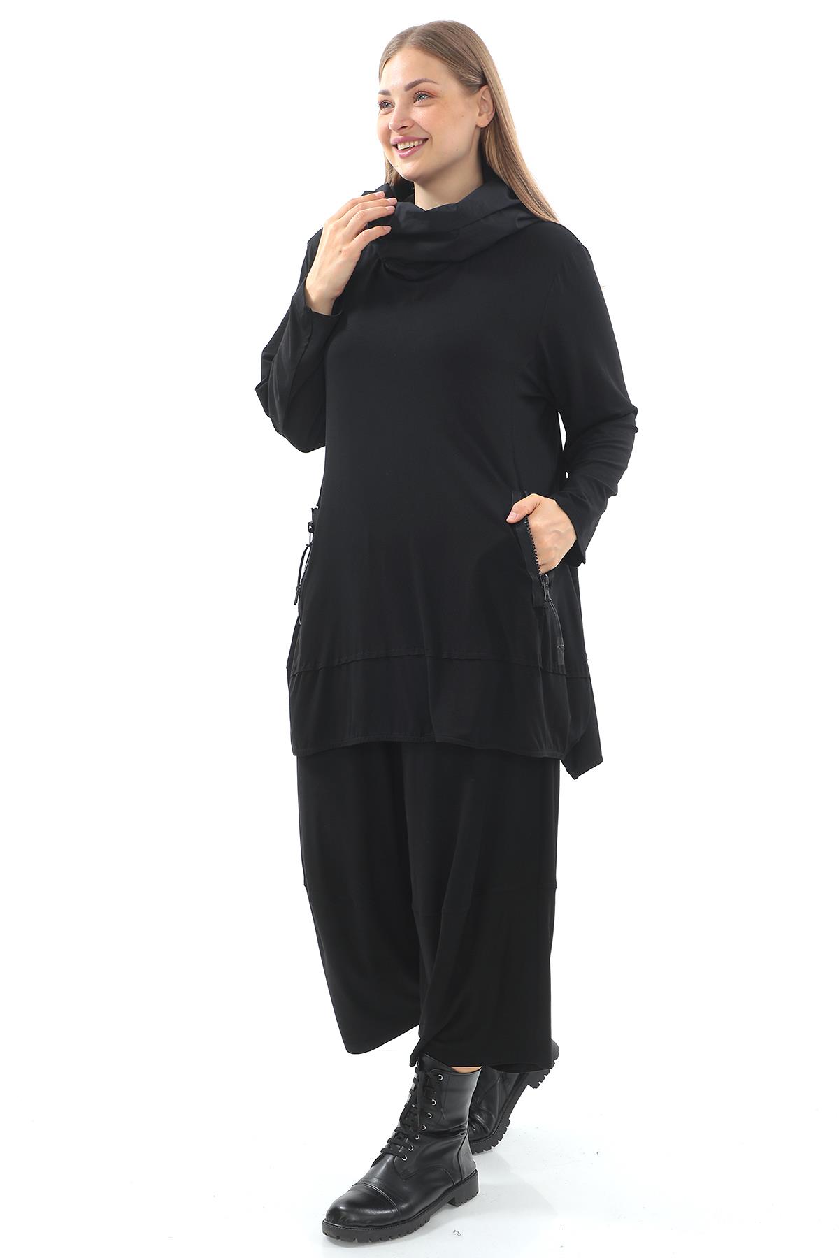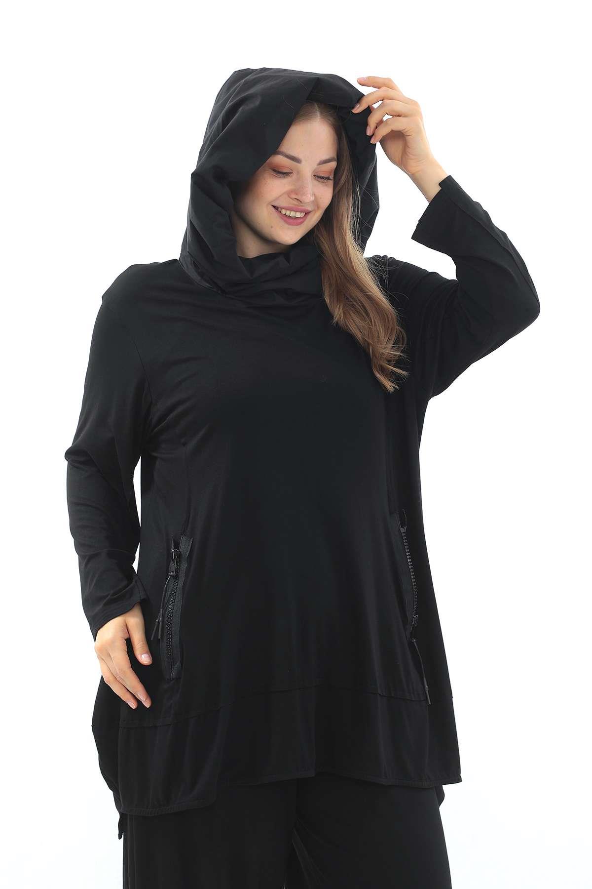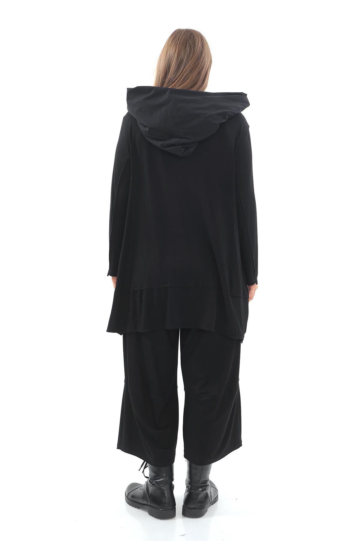 Oversized Viscose Tunic with Hood, Zippered Pockets, and Long Sleeves A relaxed-fit viscose tunic featuring a roomy hood, bold zippered pockets, and long sleeves, designed in an oversized silhouette for versatile and comfortable everyday wear.