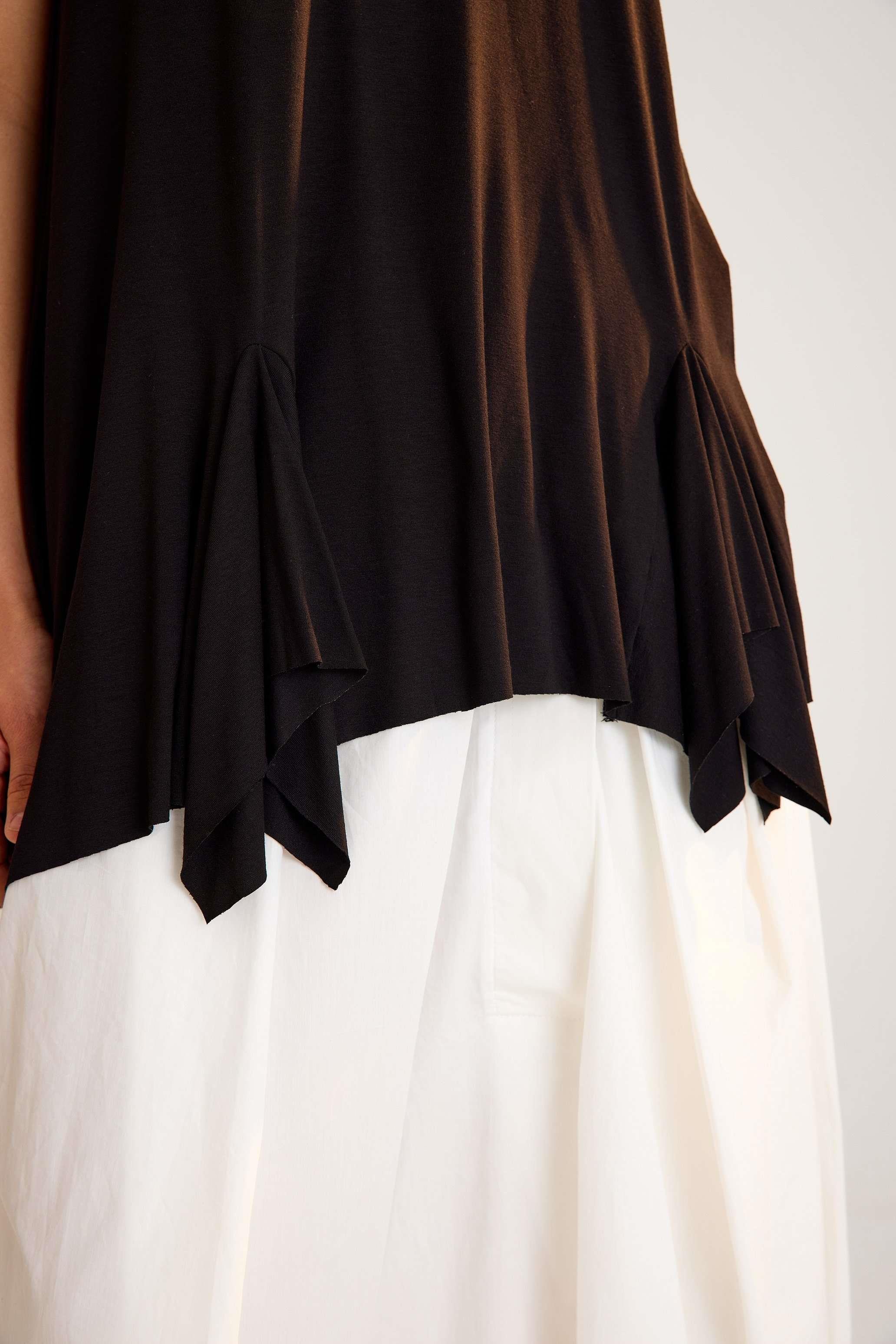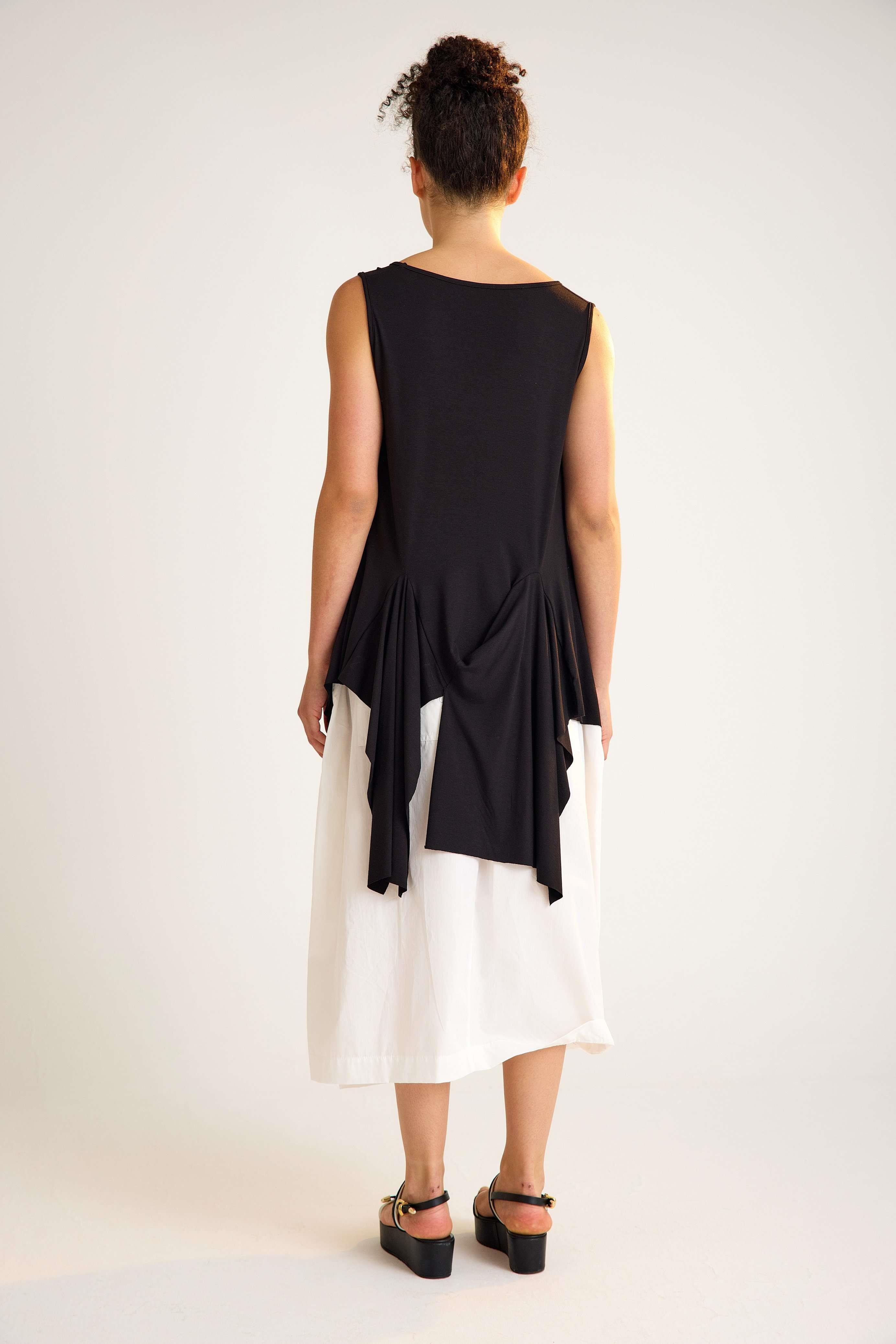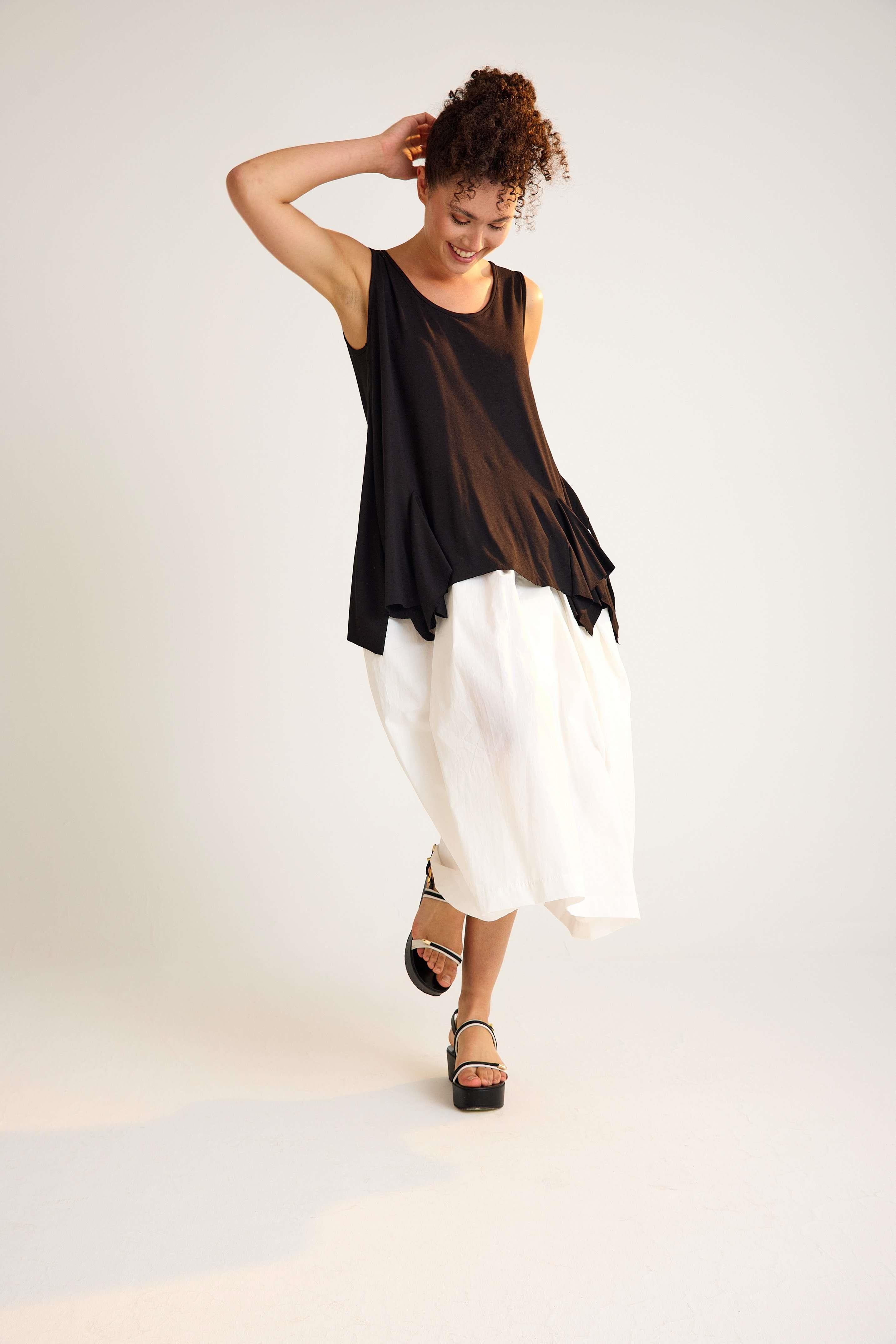 Viscose Tunic – Sleeveless, Flowing, Asymmetrical Elegance This viscose tunic is crafted with a sleeveless design and a flowing asymmetrical hemline that adds graceful movement to every step. The U-neckline enhances its modern simplicity, while the relaxed fit creates an effortless, flattering silhouette. Made from a soft viscose blend with stretch, it drapes beautifully over the body, offering both comfort and flexibility. The asymmetric cut with a longer back gives this piece a contemporary edge, making it perfect for both casual and refined styling. Key features: Sleeveless design with wide straps U-neckline with trimmed edges Flowing asymmetrical hemline Relaxed A-line silhouette 95% viscose, 5% elastane for comfort and stretch A timeless yet modern tunic that moves beautifully with you — ideal for versatile, day-to-night looks.