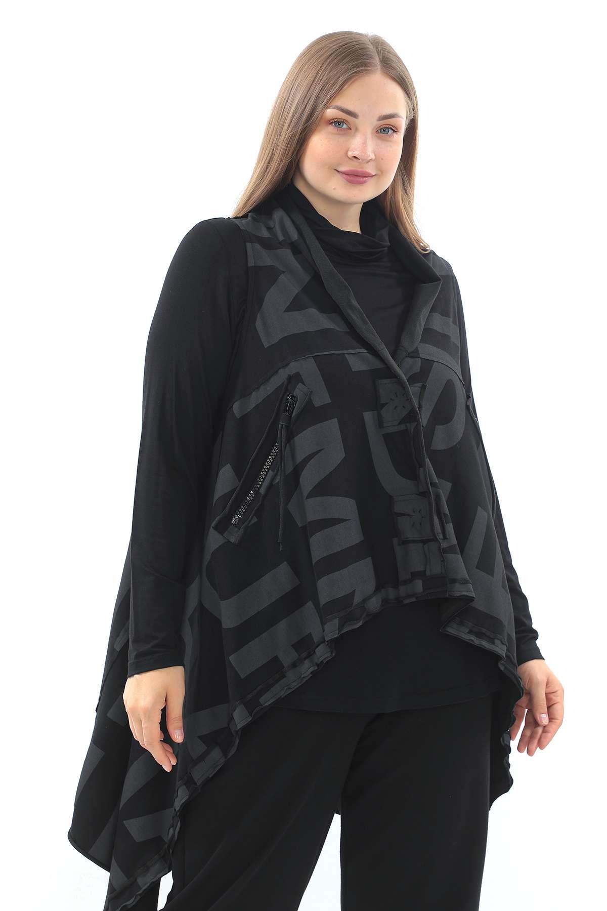 Asymmetric Cotton Vest with Patterned Design and Zippered Pockets A stylish cotton vest featuring a patterned finish, oversized zippered pockets, hidden snap fastenings, and a modern high-low cut for an avant-garde layered look.