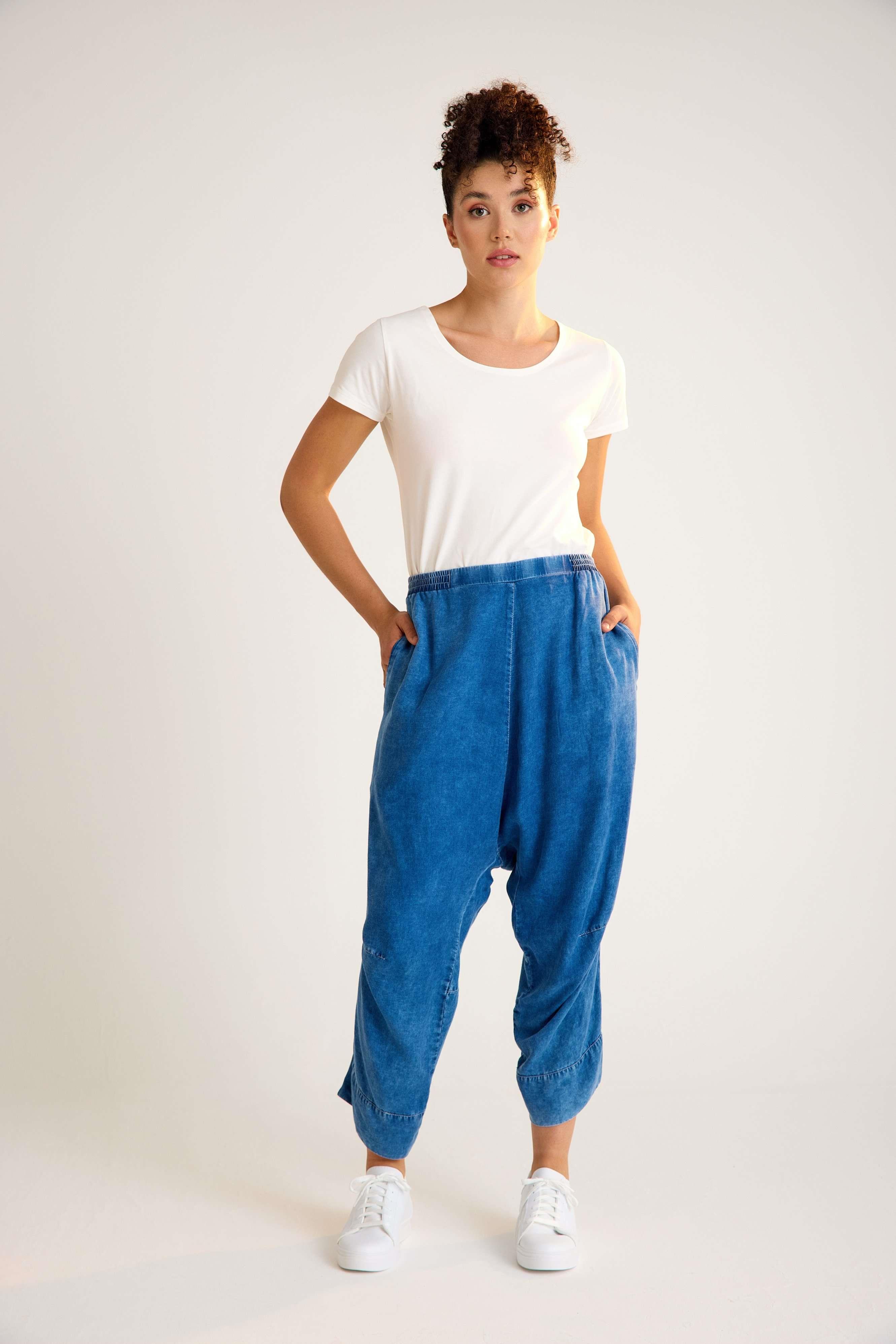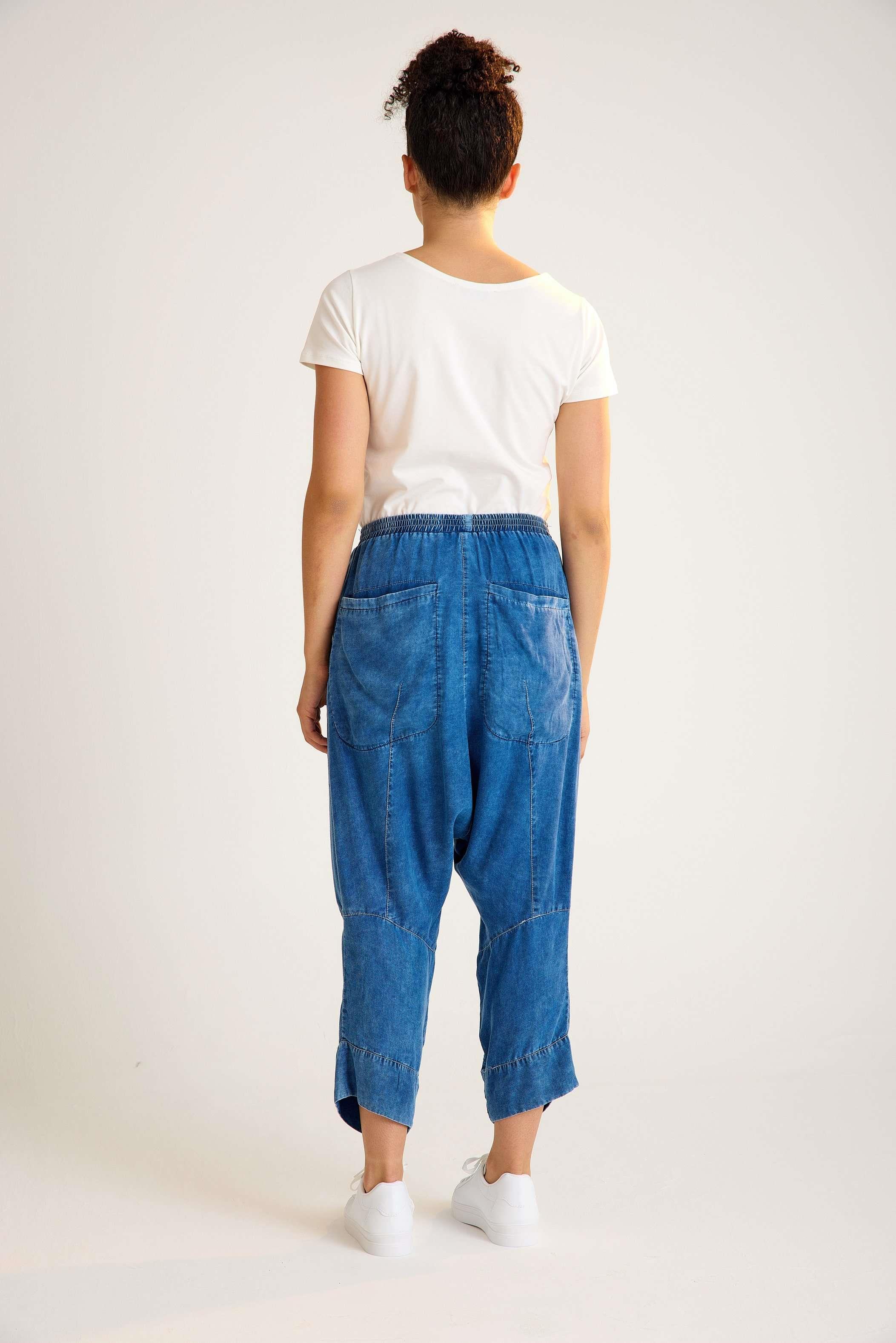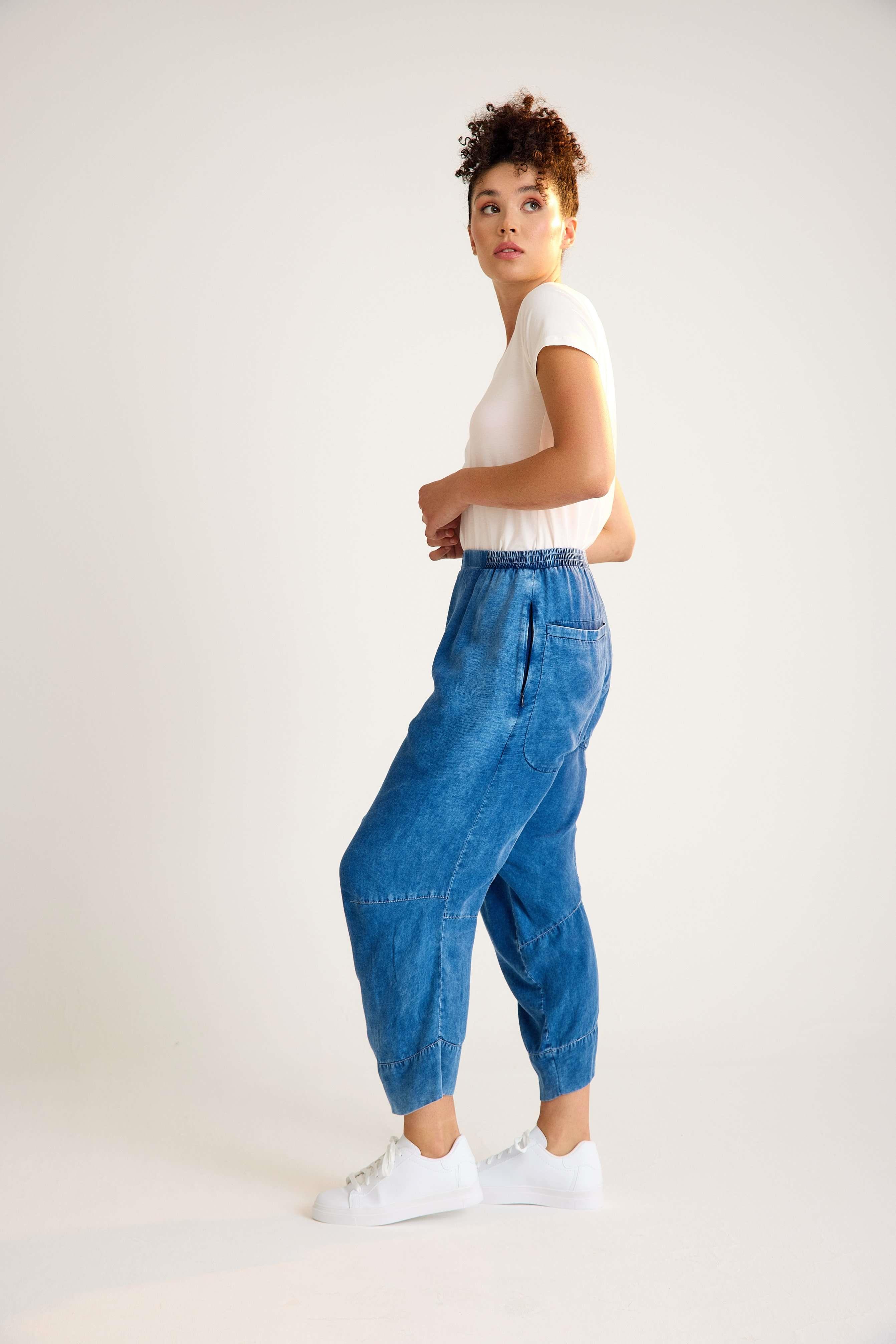 Tencel trousers with an elastic waistband – soft, breathable, and sustainably stylish, designed with a denim-look finish. A timeless avant-garde essential for modern wardrobes, perfect for wholesale buyers and retail fashion boutiques