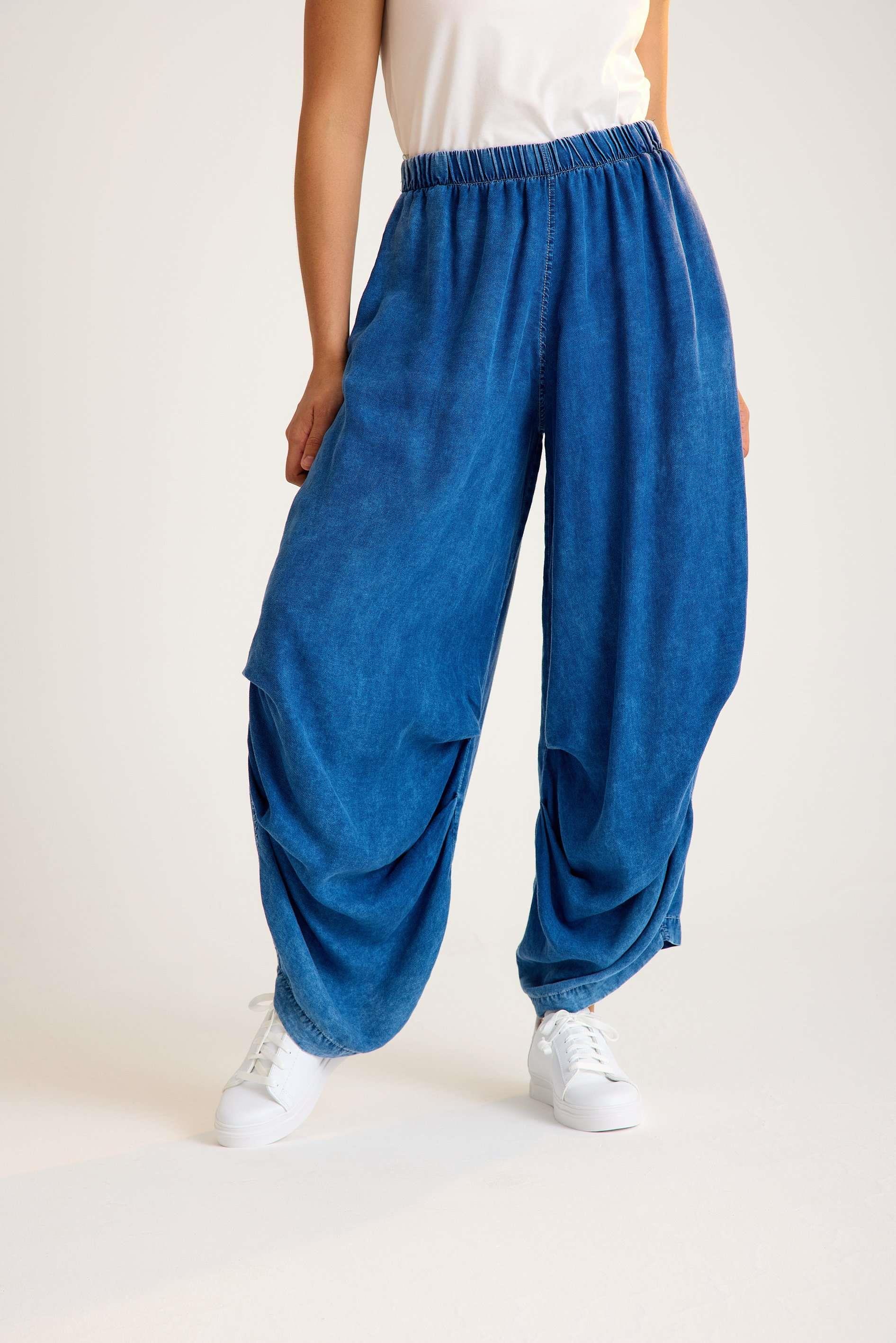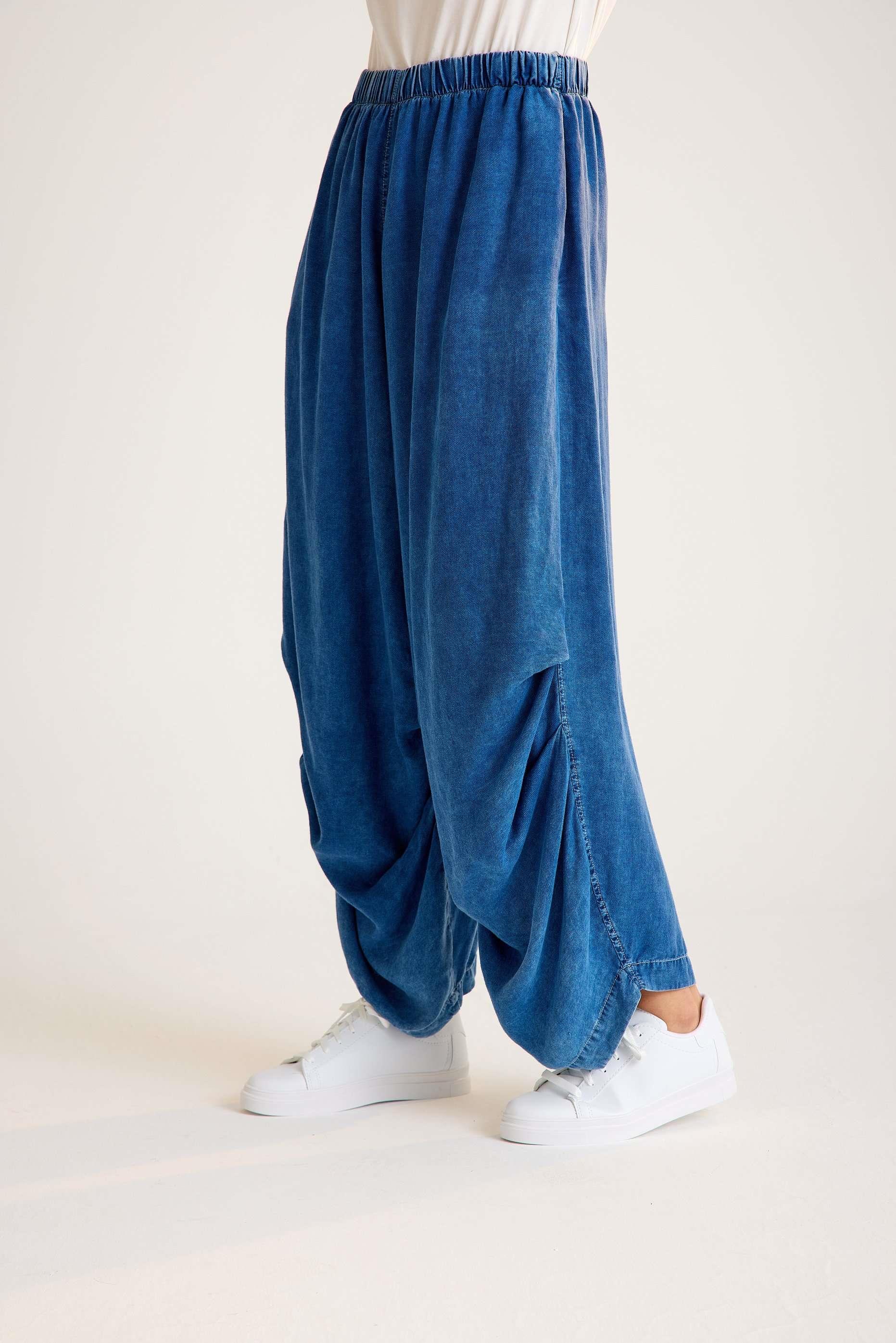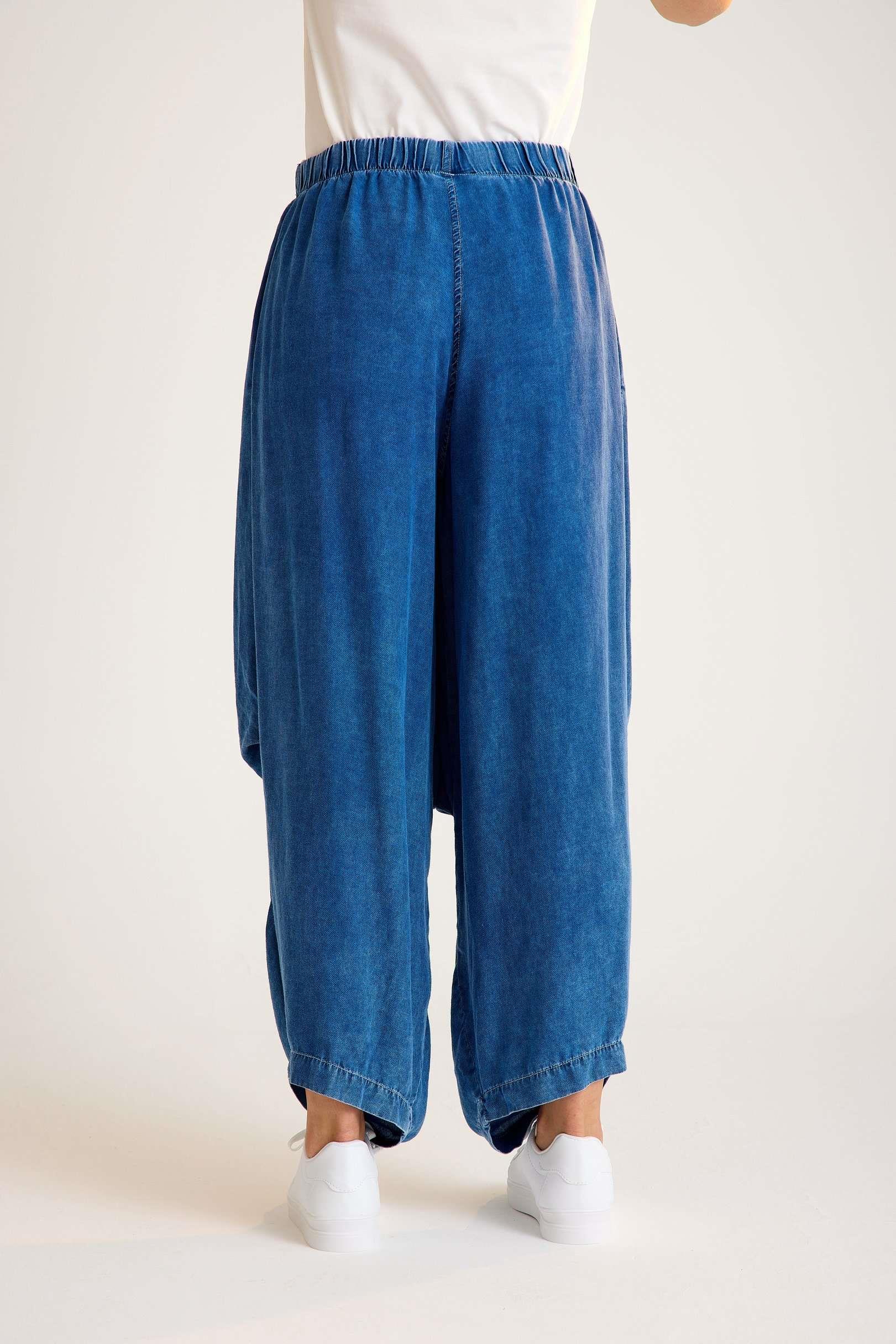 Tencel trousers with an elastic waistband – soft, breathable, and sustainably stylish, designed with a denim-look finish. A timeless avant-garde essential for modern wardrobes, perfect for wholesale buyers and retail fashion boutiques