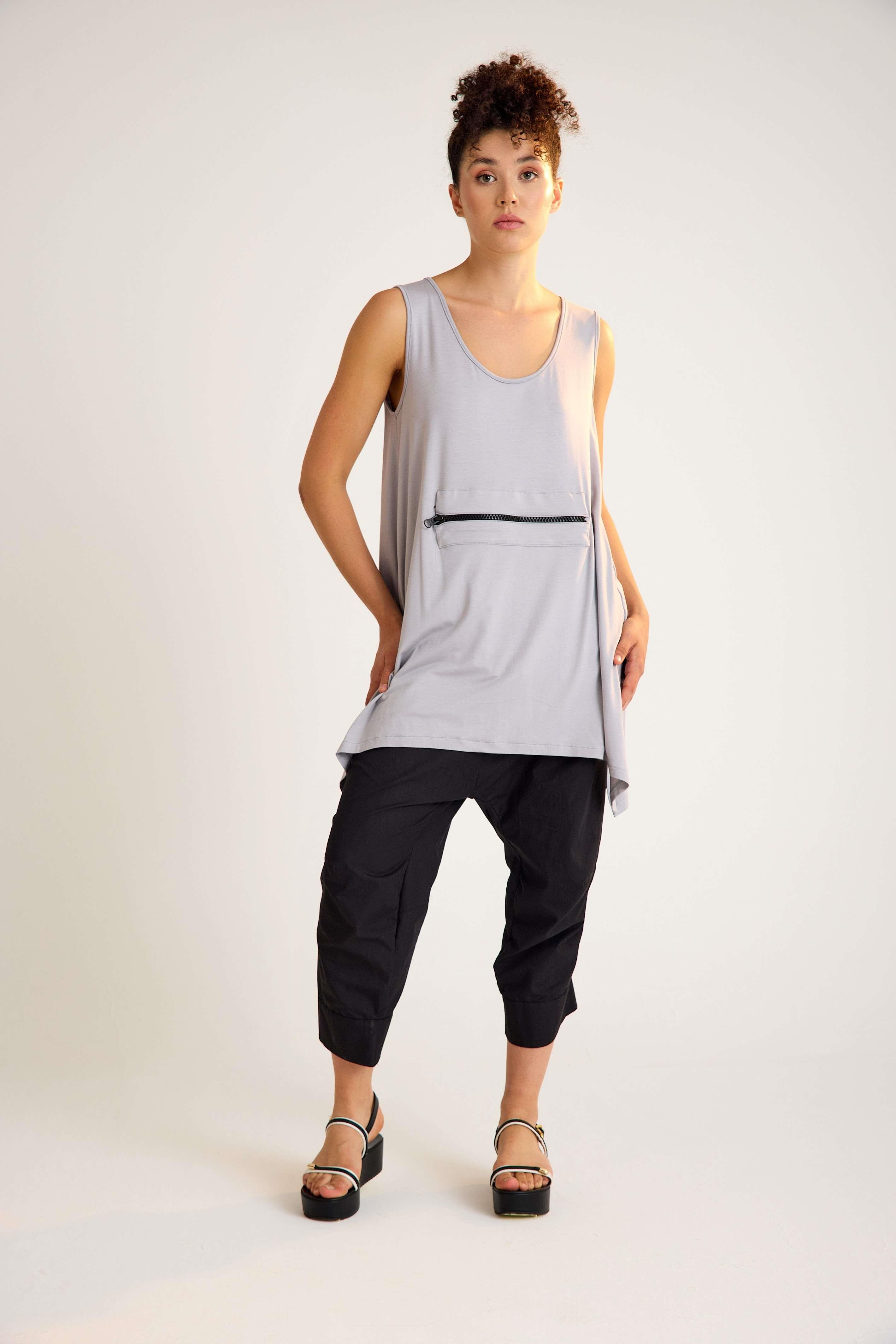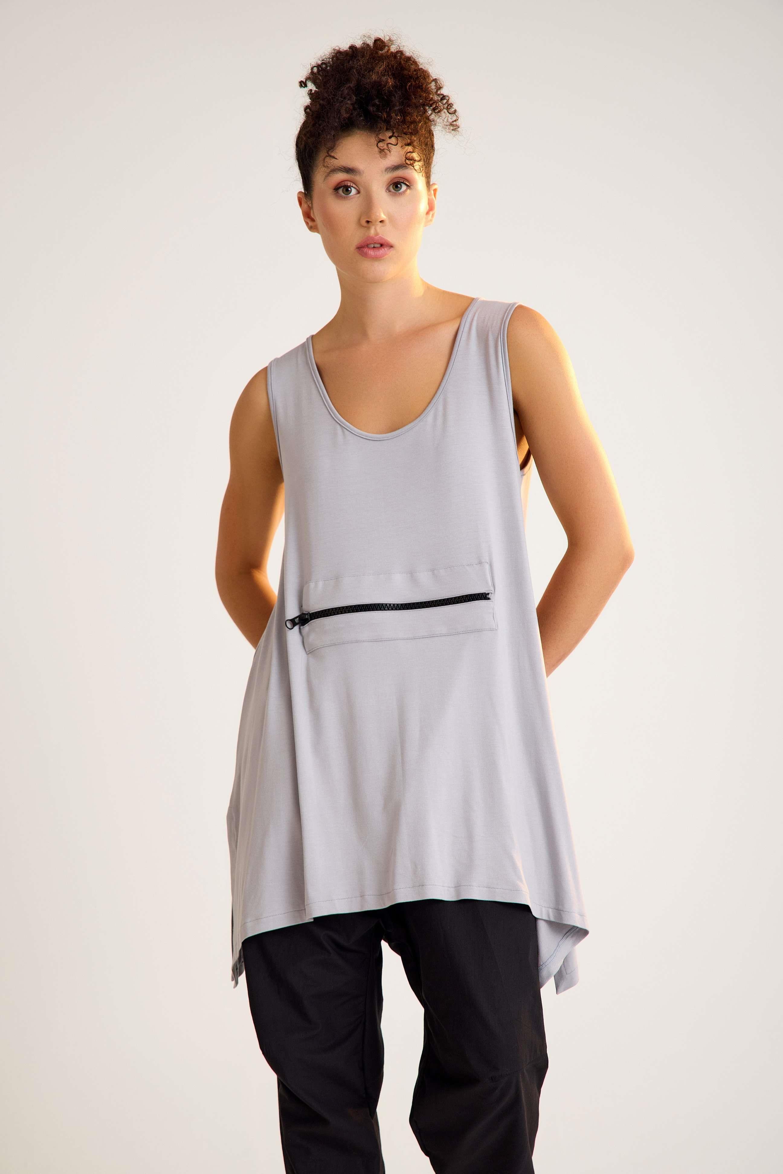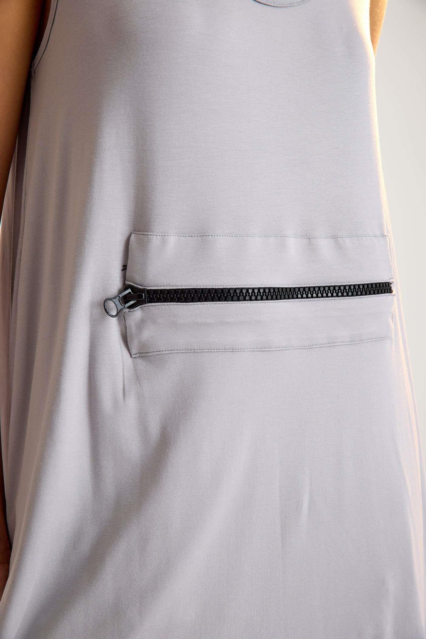 Oversized sleeveless viscose tunic with a U-neckline and bold front zipper detail, finished with a dyed effect. A stylish and timeless avant-garde piece that combines comfort with unique design – ideal for wholesale buyers and retail fashion boutiques.