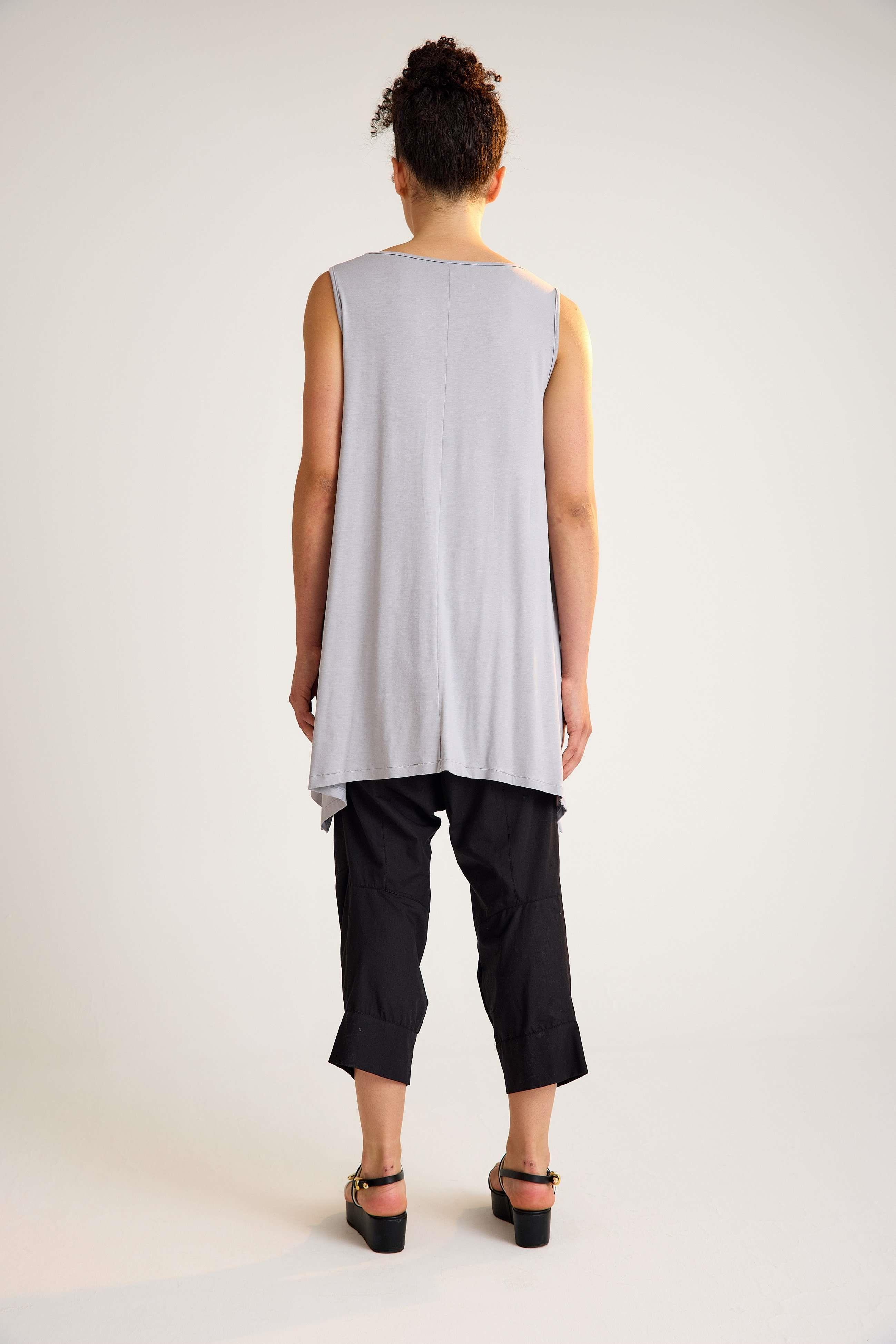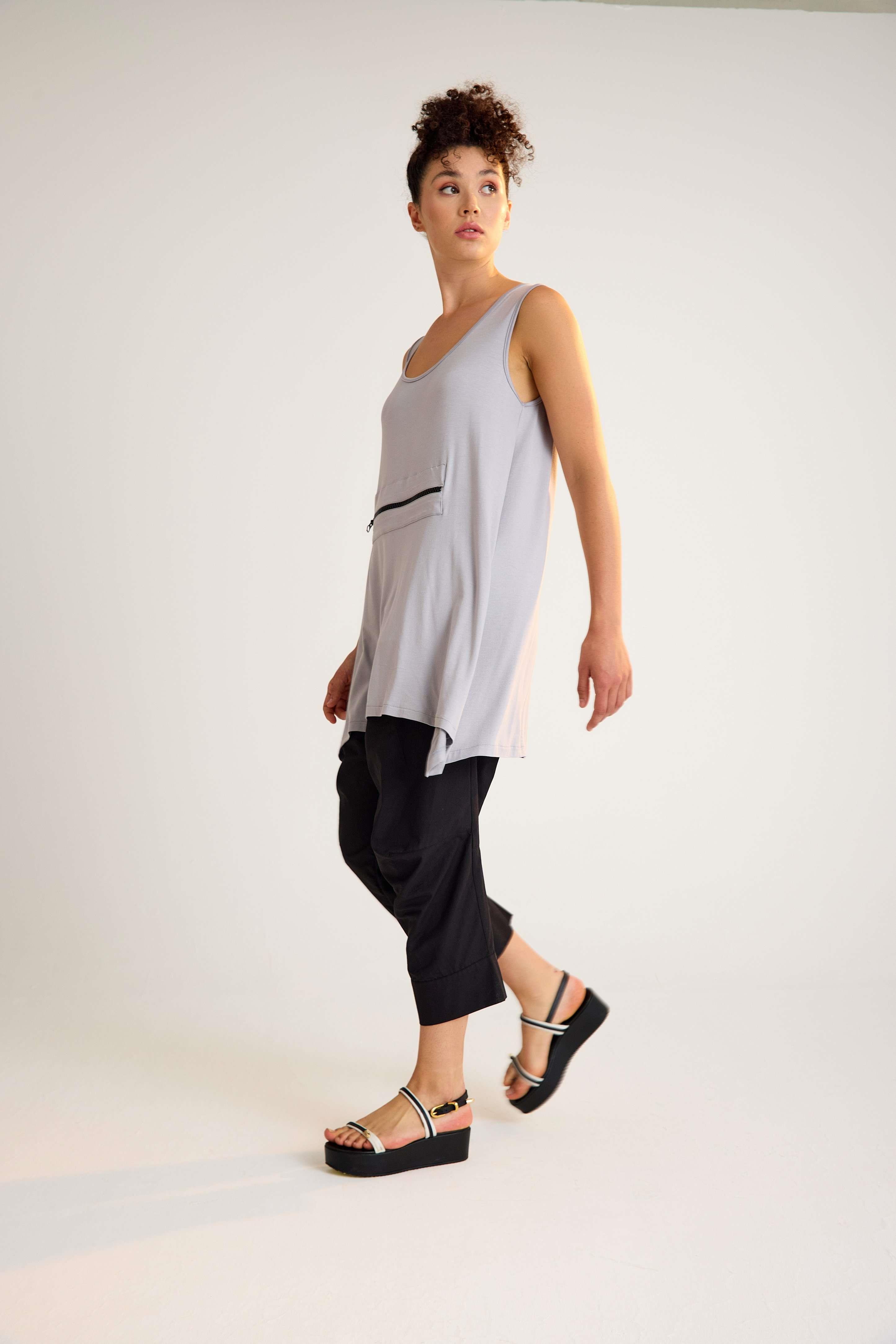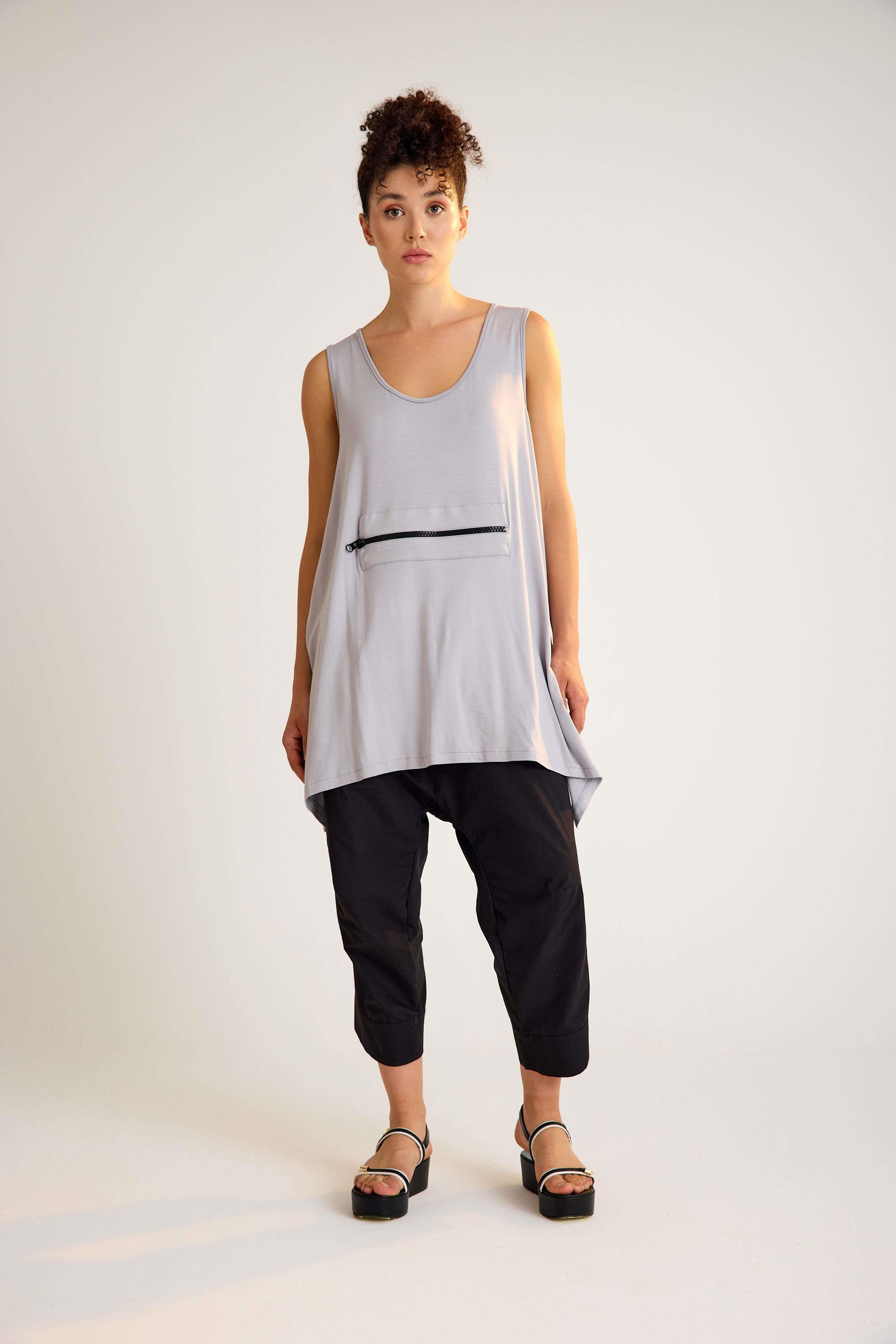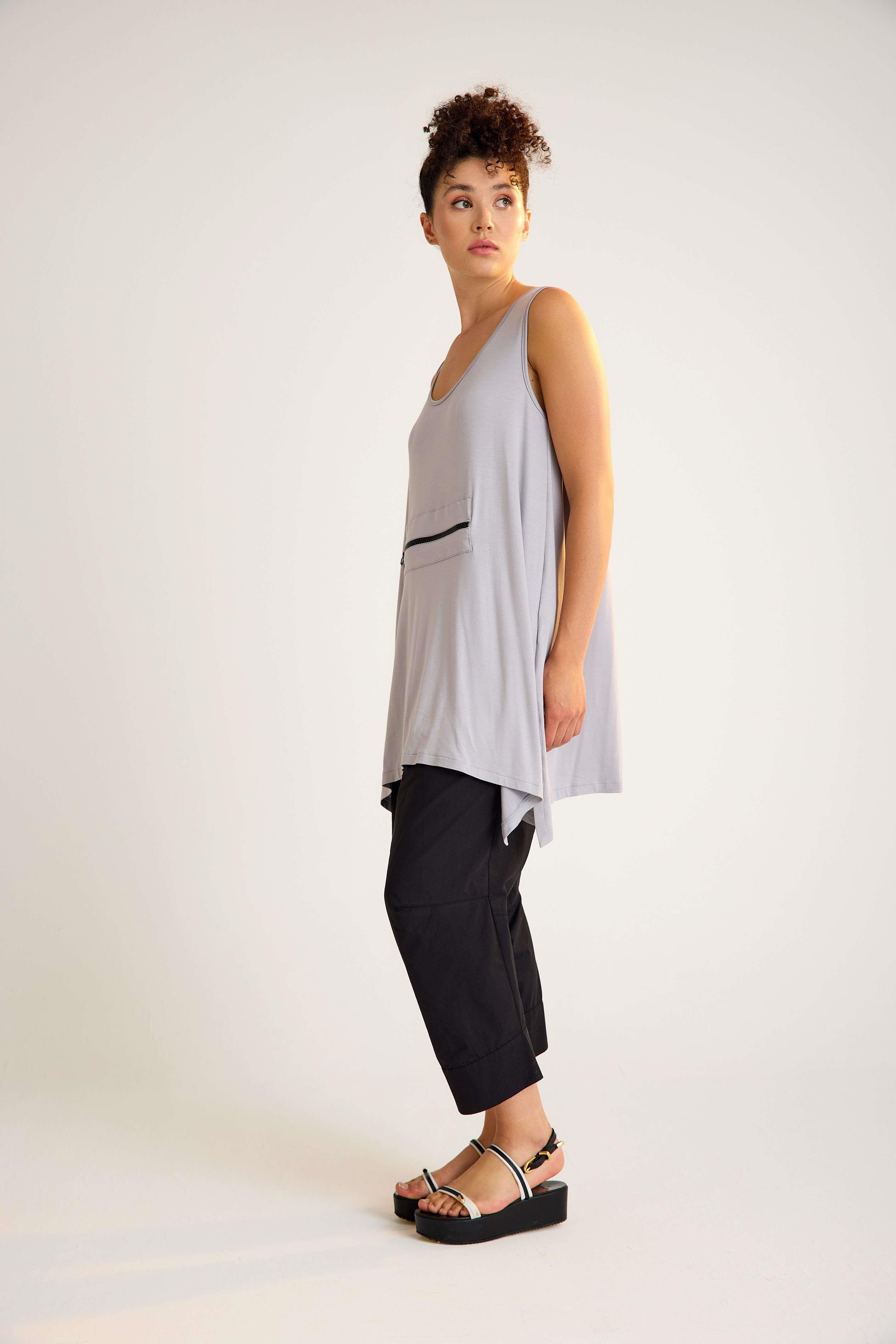 Oversized sleeveless viscose tunic with a U-neckline and bold front zipper detail, finished with a dyed effect. A stylish and timeless avant-garde piece that combines comfort with unique design – ideal for wholesale buyers and retail fashion boutiques.