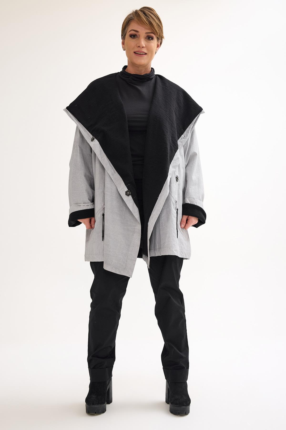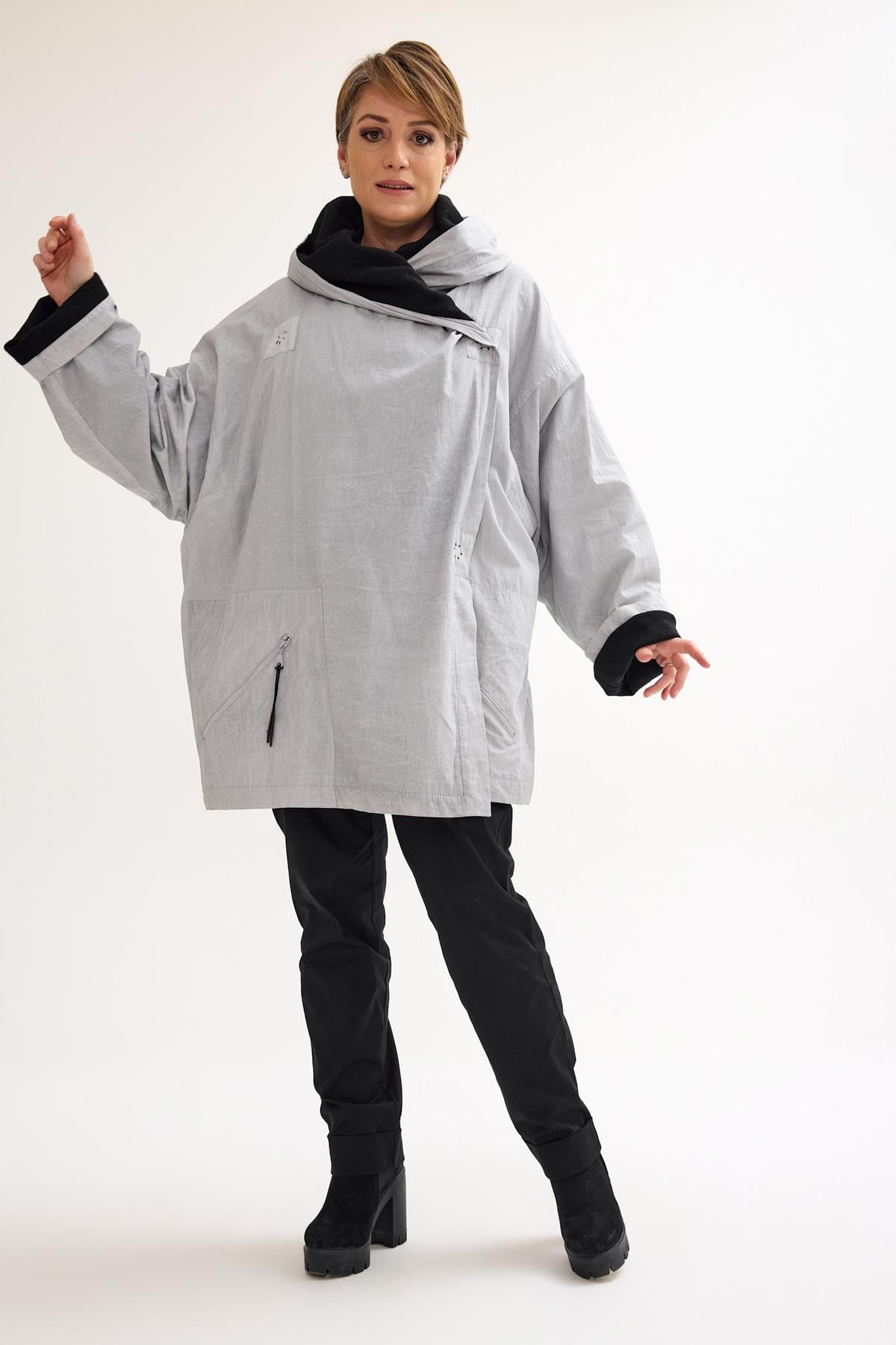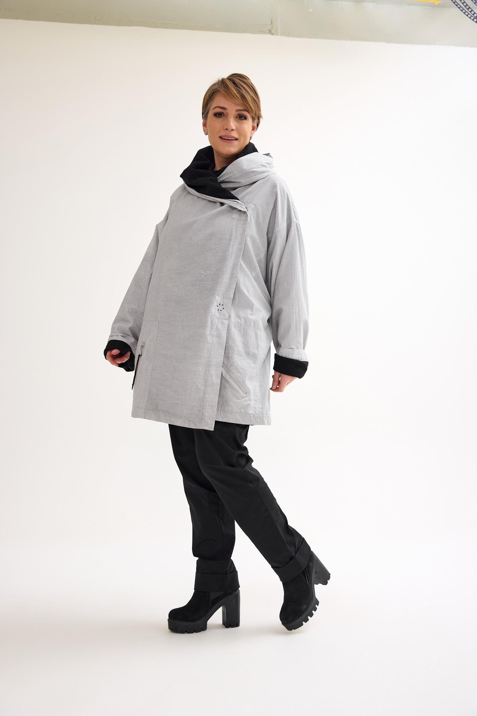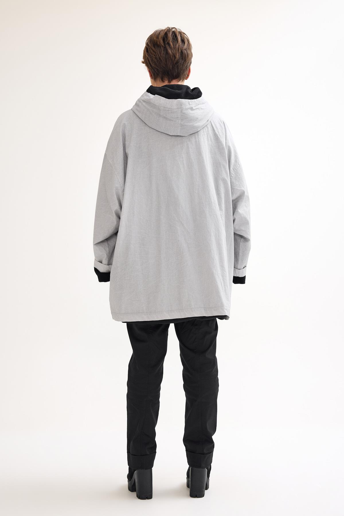 Winter Coat with Hood, Wool Lining, and Cotton Shell A functional winter coat featuring a hood, hidden snap fastenings, zippered pockets, and a warm wool interior with a durable cotton exterior, designed for comfort and avant-garde style in cold weather.