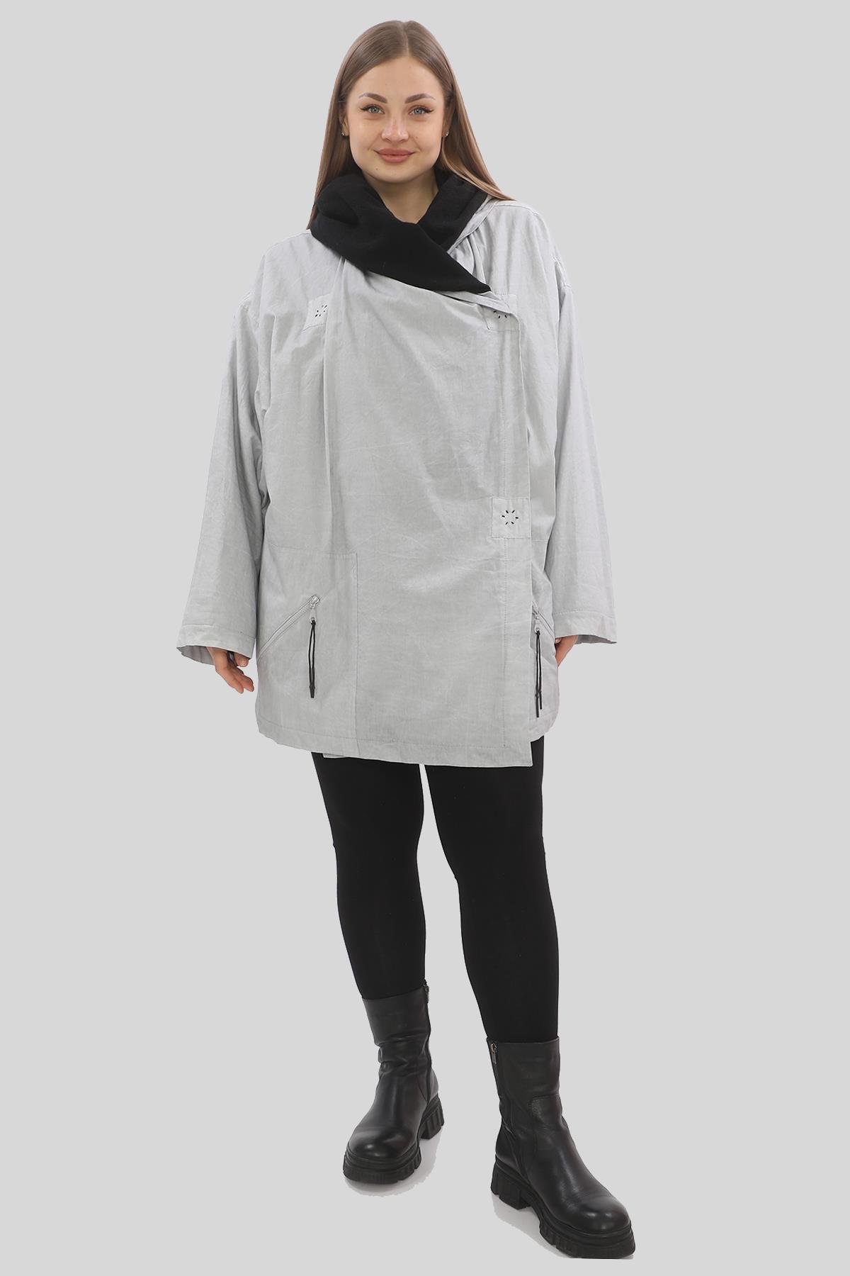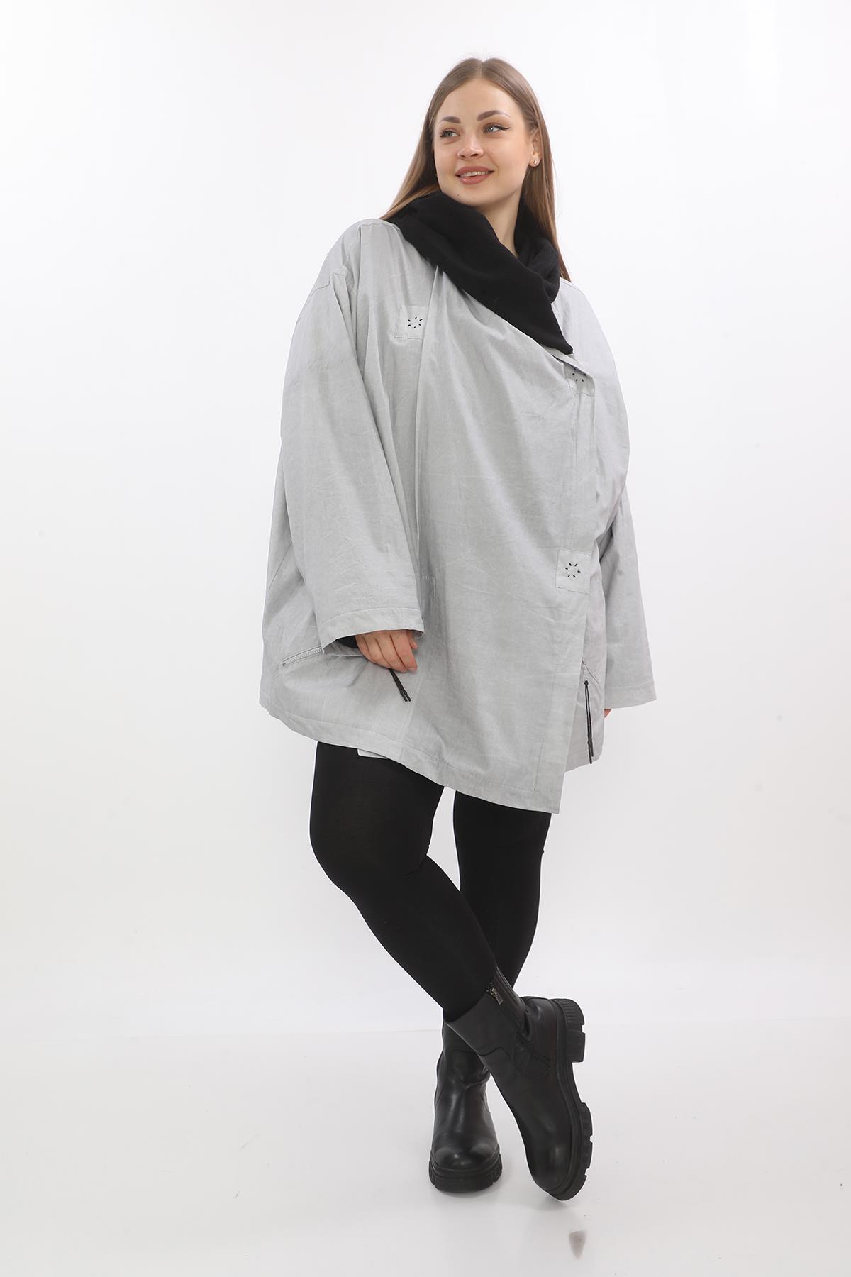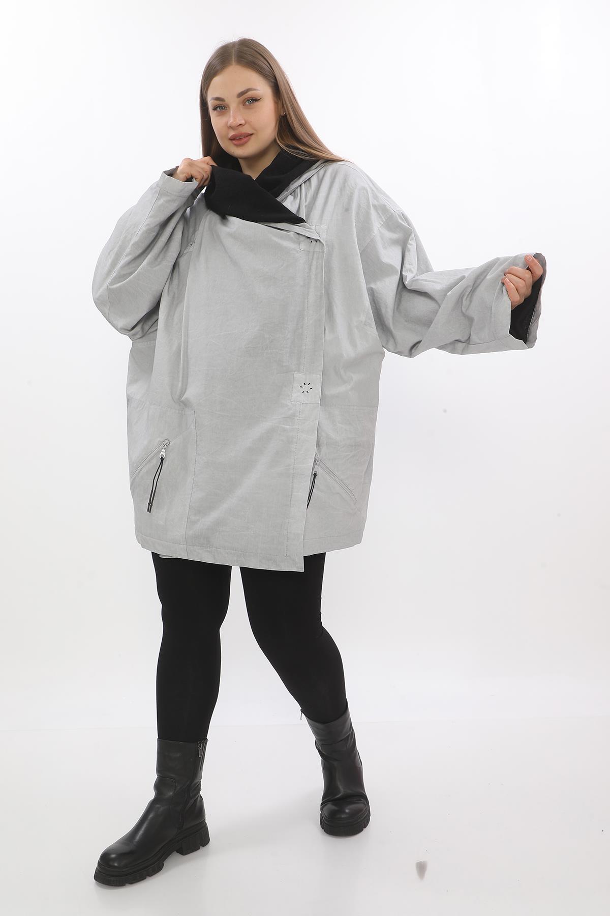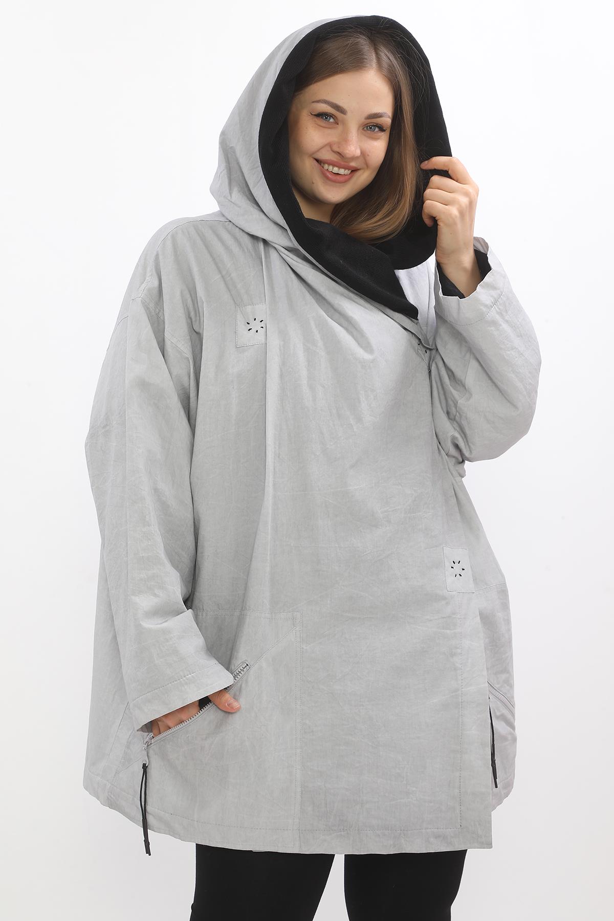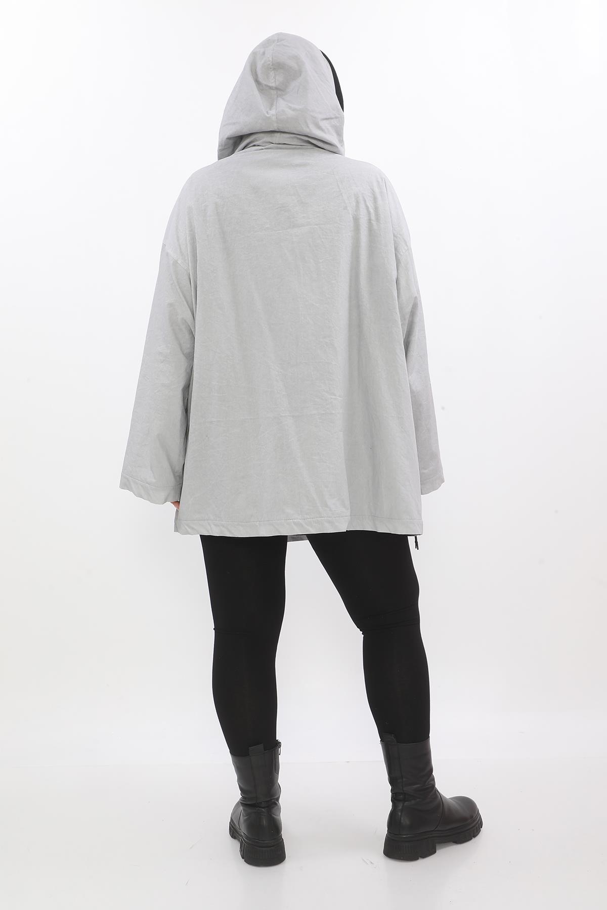 Winter Coat with Hood, Wool Lining, and Cotton Shell A functional winter coat featuring a hood, hidden snap fastenings, zippered pockets, and a warm wool interior with a durable cotton exterior, designed for comfort and avant-garde style in cold weather.