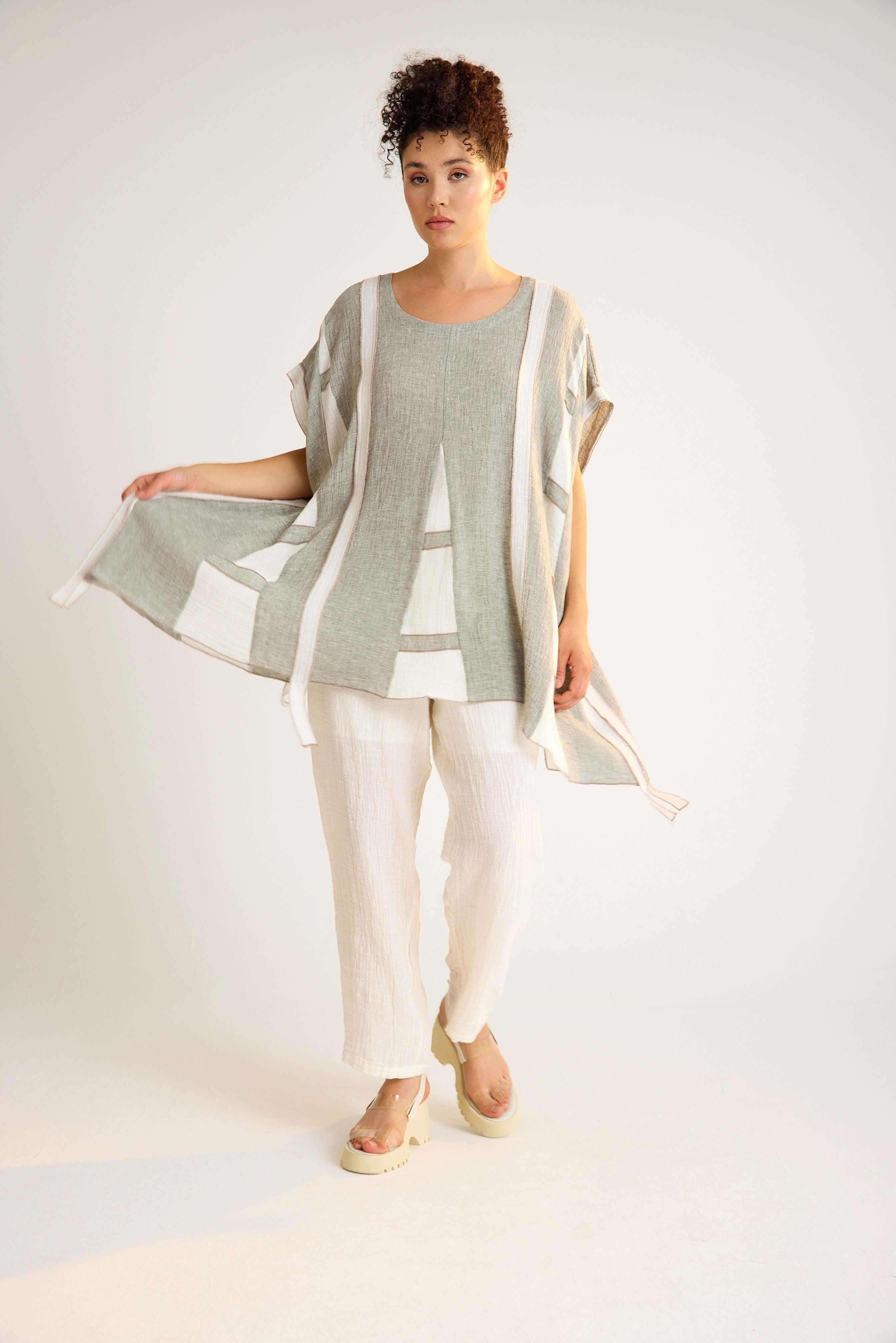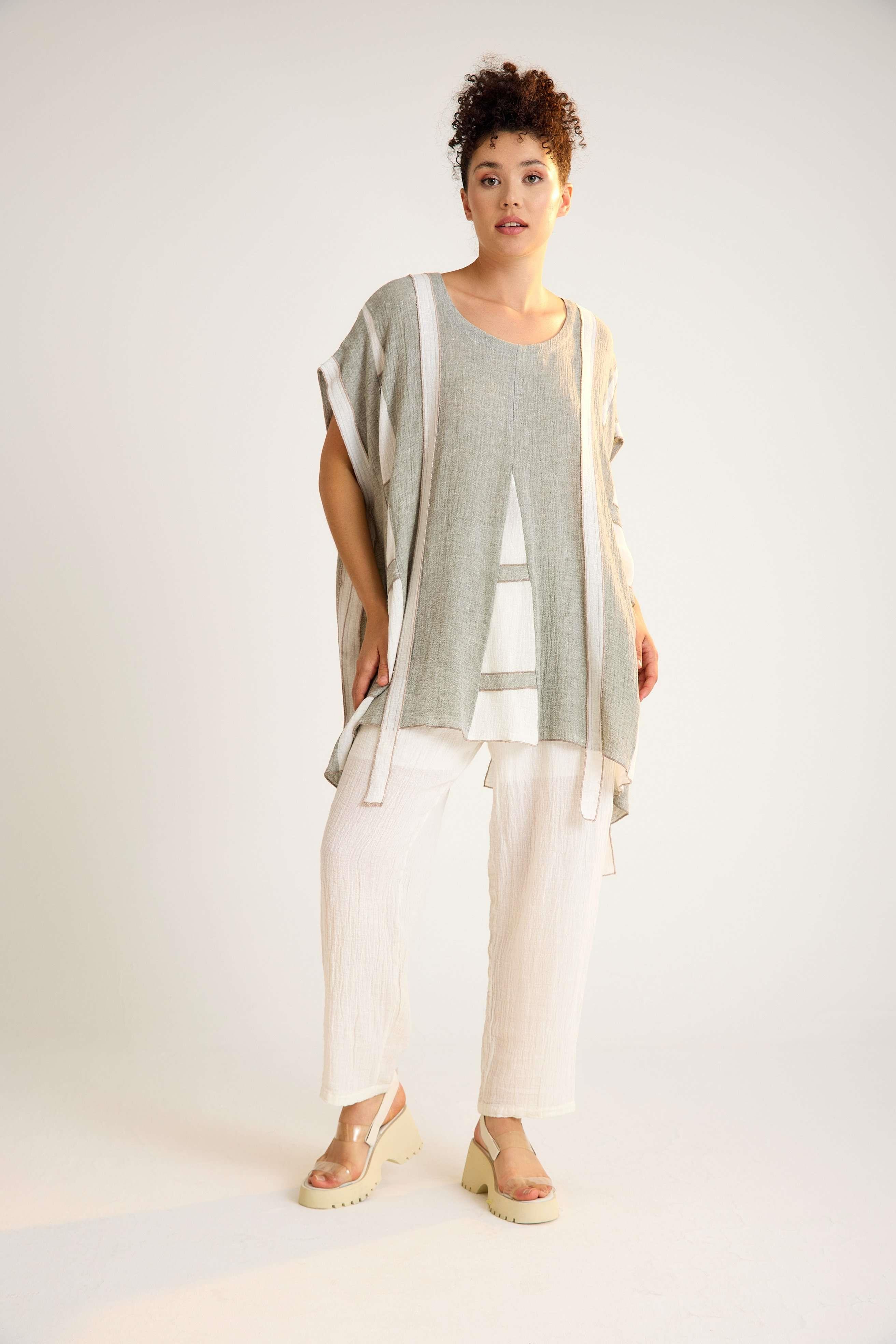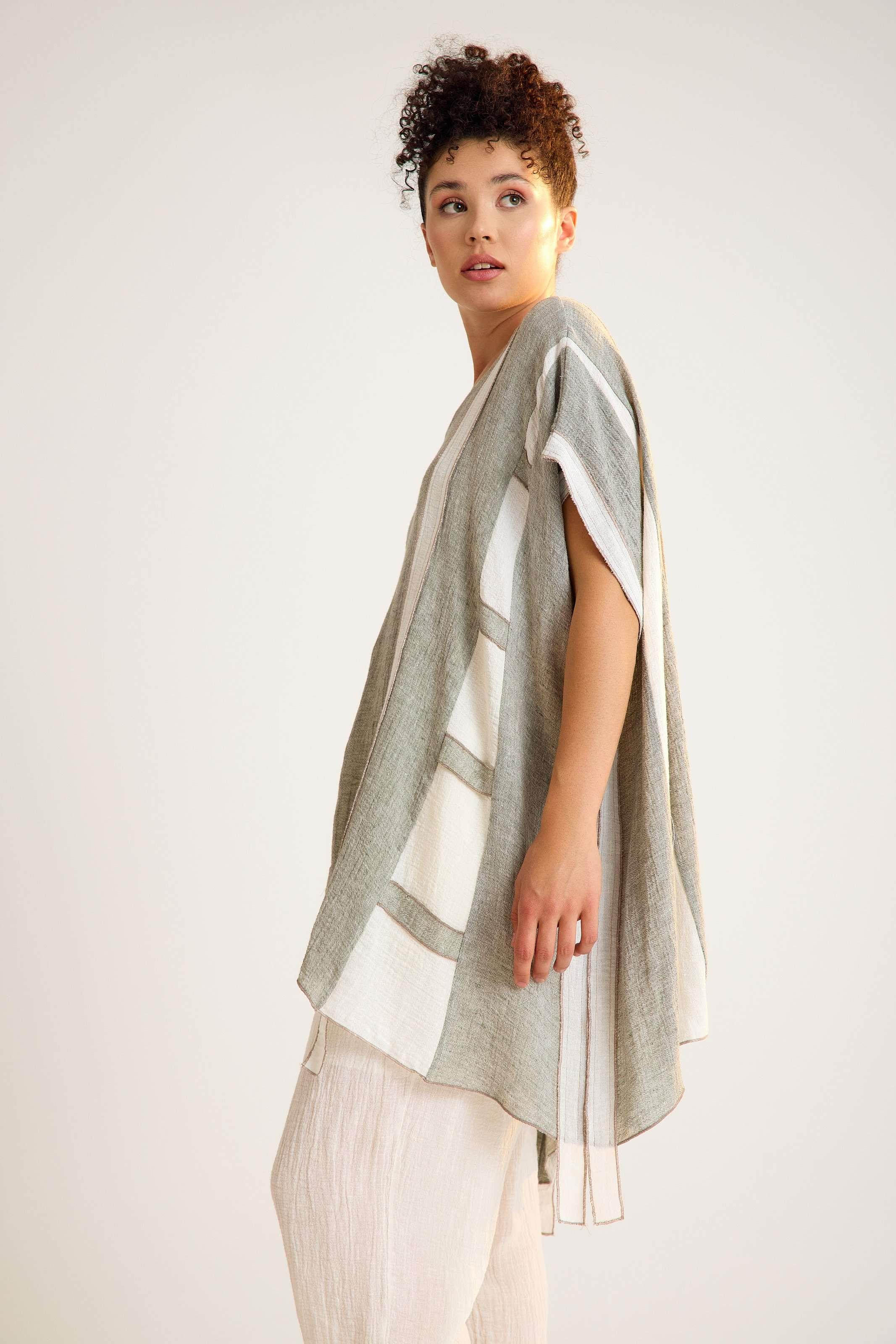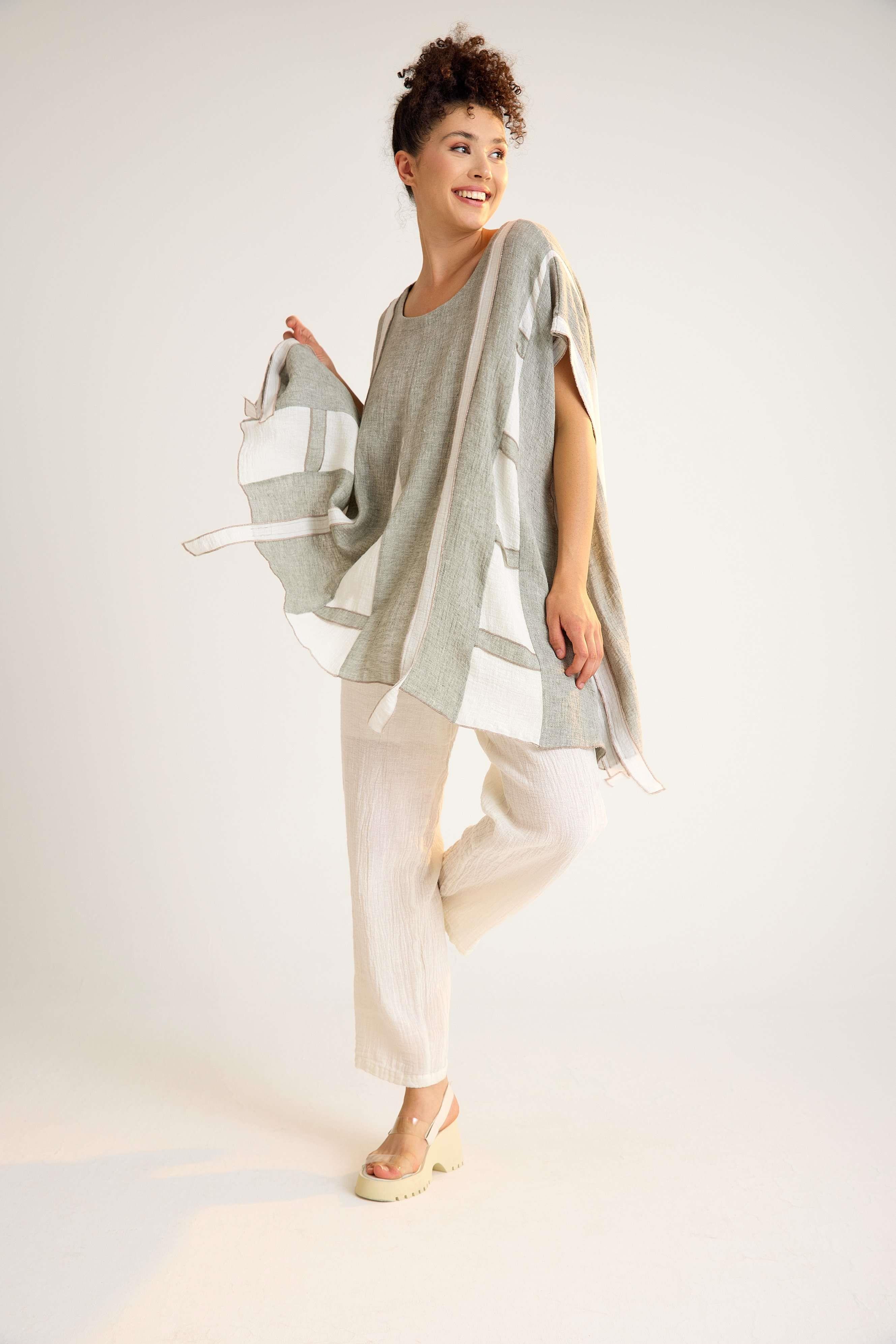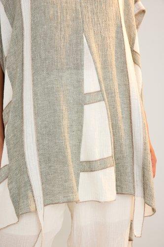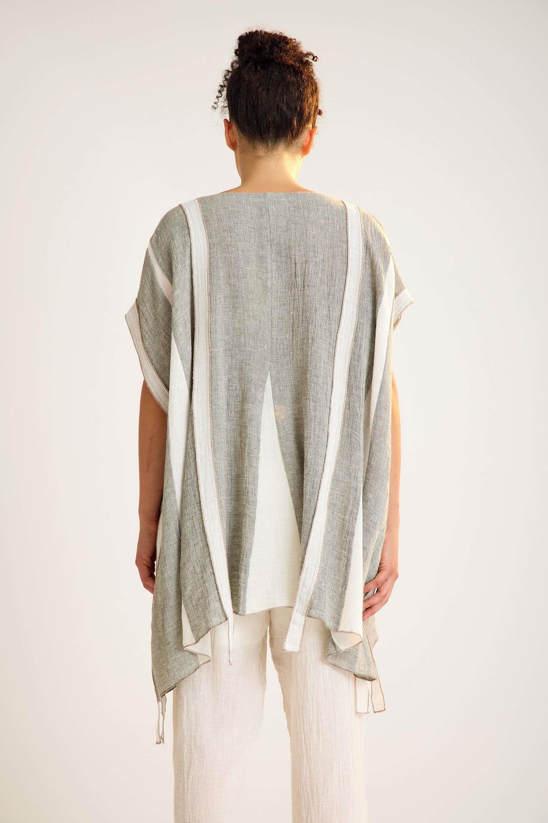 Half sleeve oversized linen tunic with dual-tone design and asymmetric cut for a bold, avant-garde everyday look.