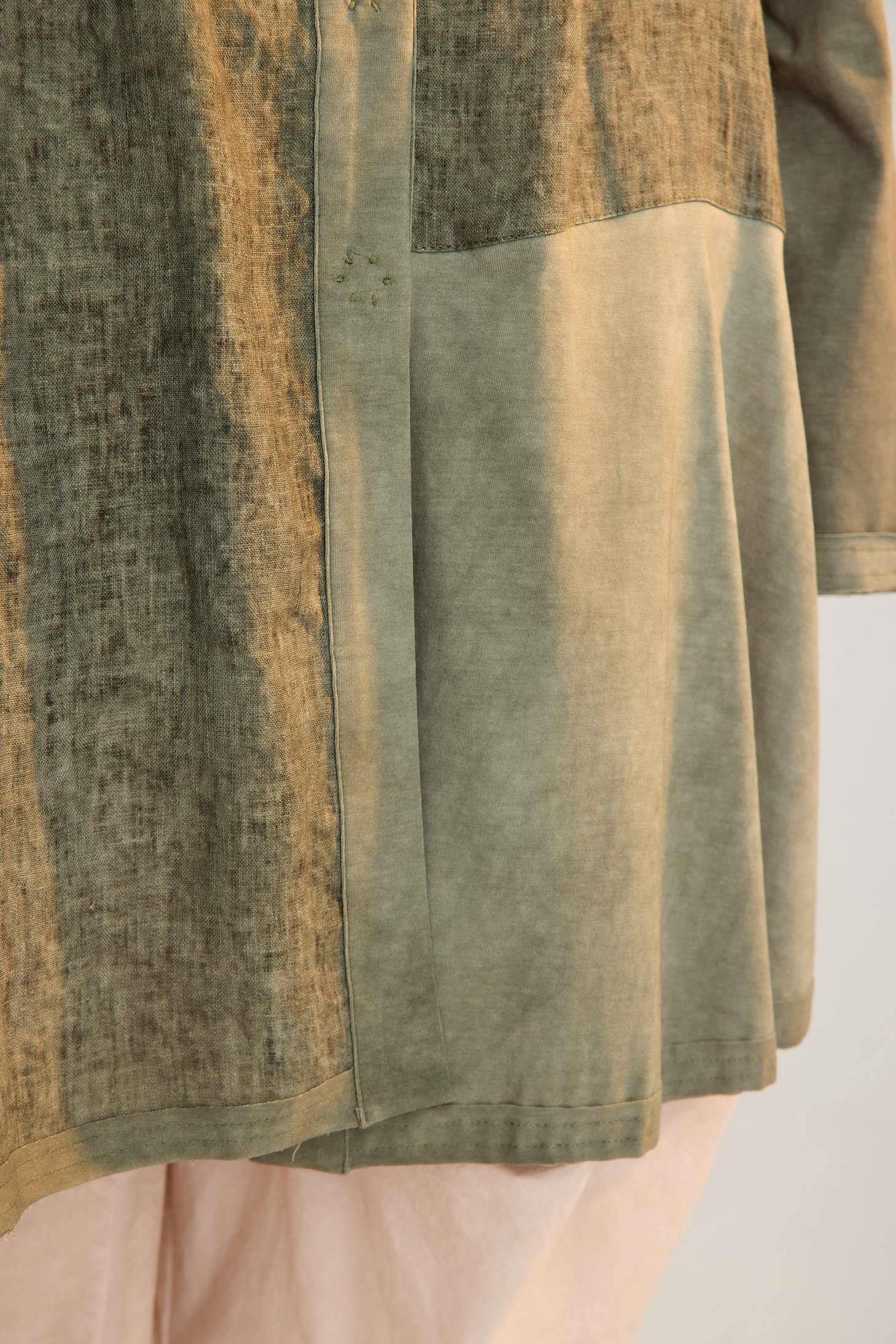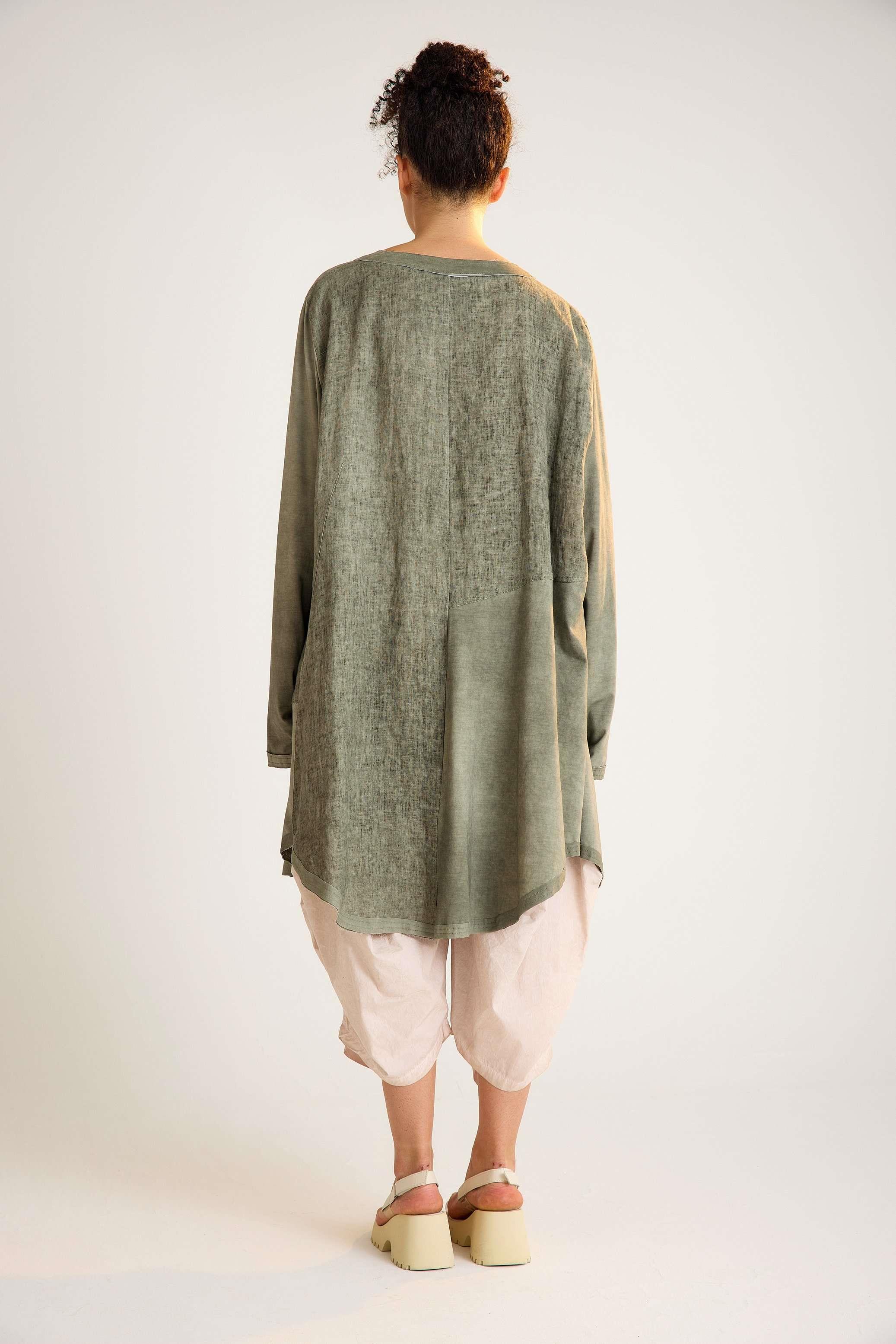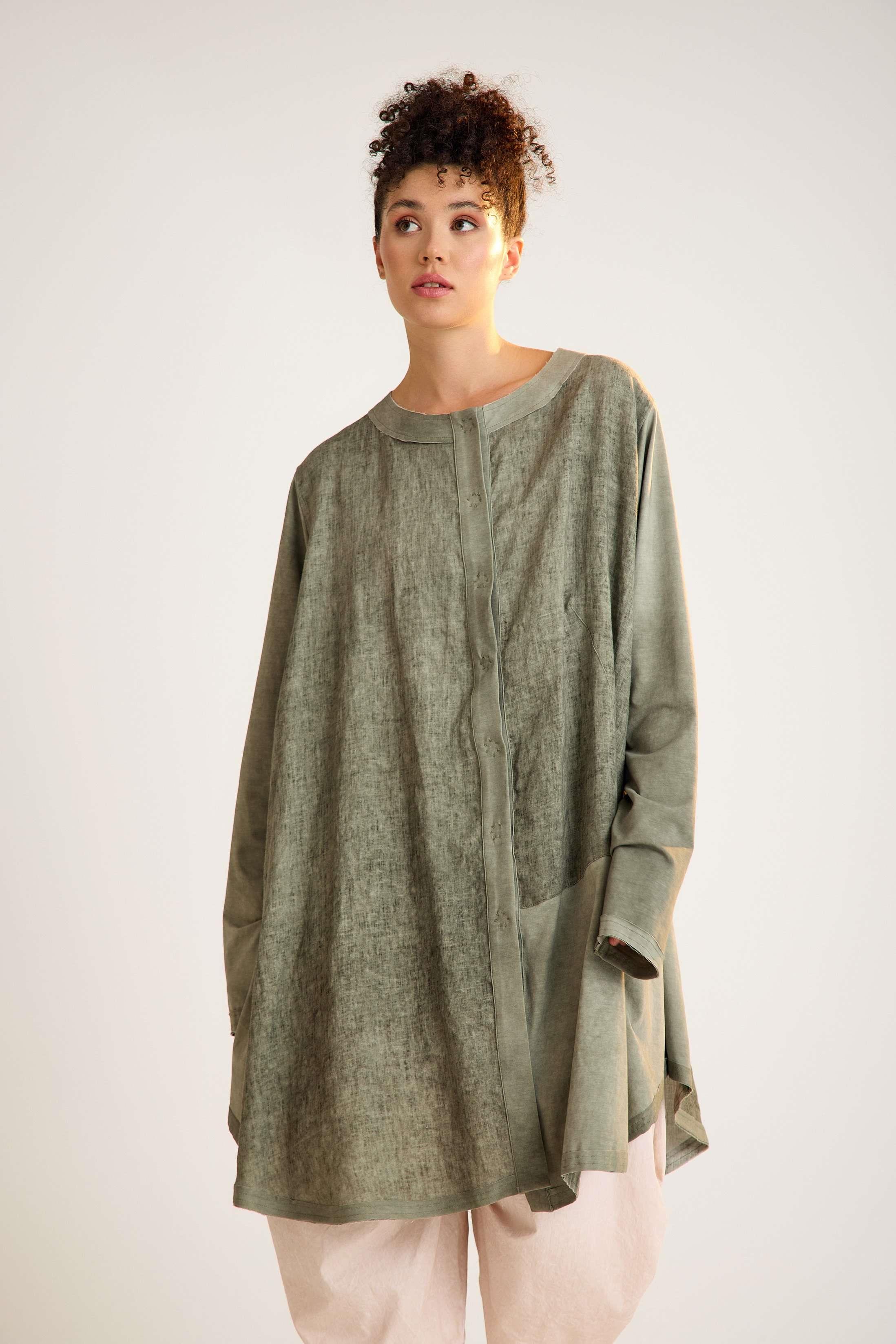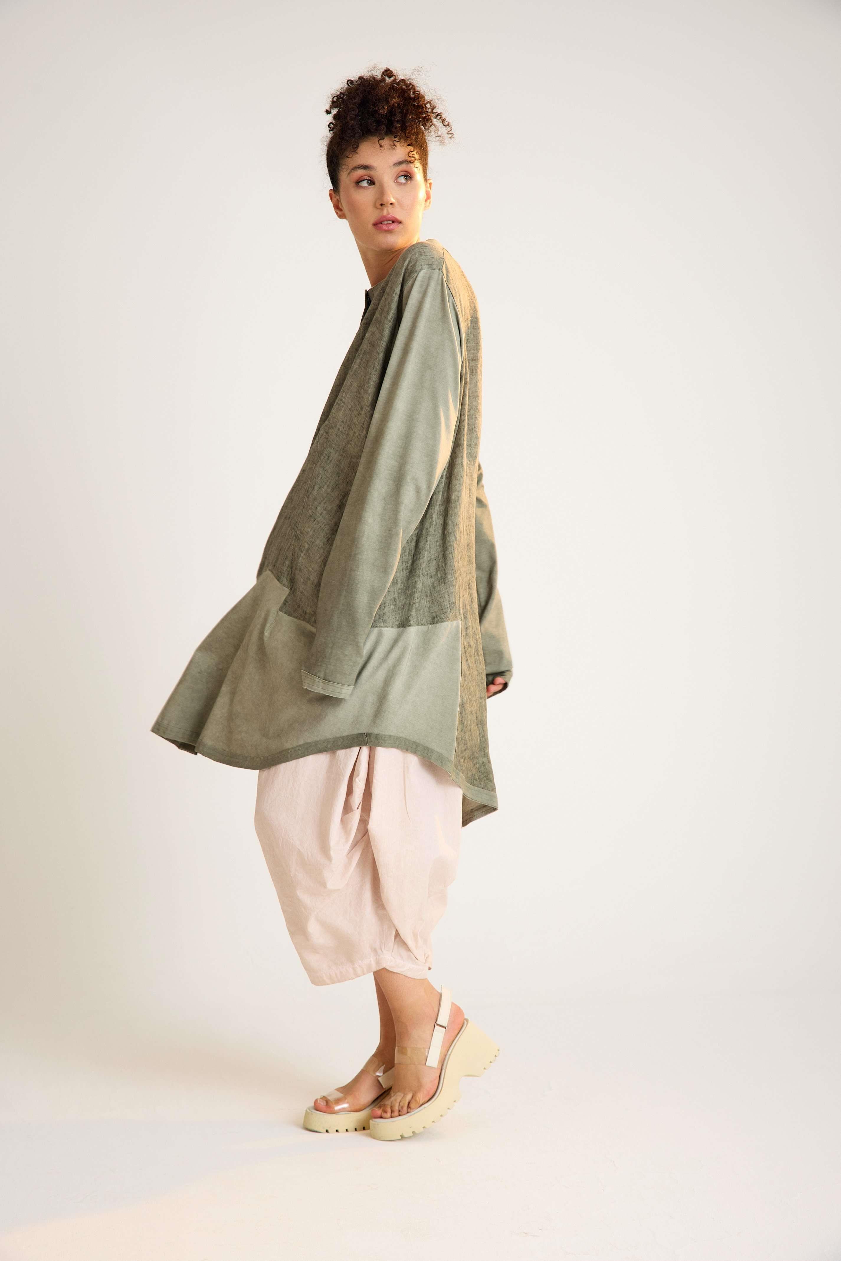 This avant-garde linen jacket is crafted with a unique dual-fabric design, featuring long sleeves and a clean crew neck. Its oversized silhouette blends comfort with bold style, making it an ideal choice for everyday wear with a modern, artistic edge