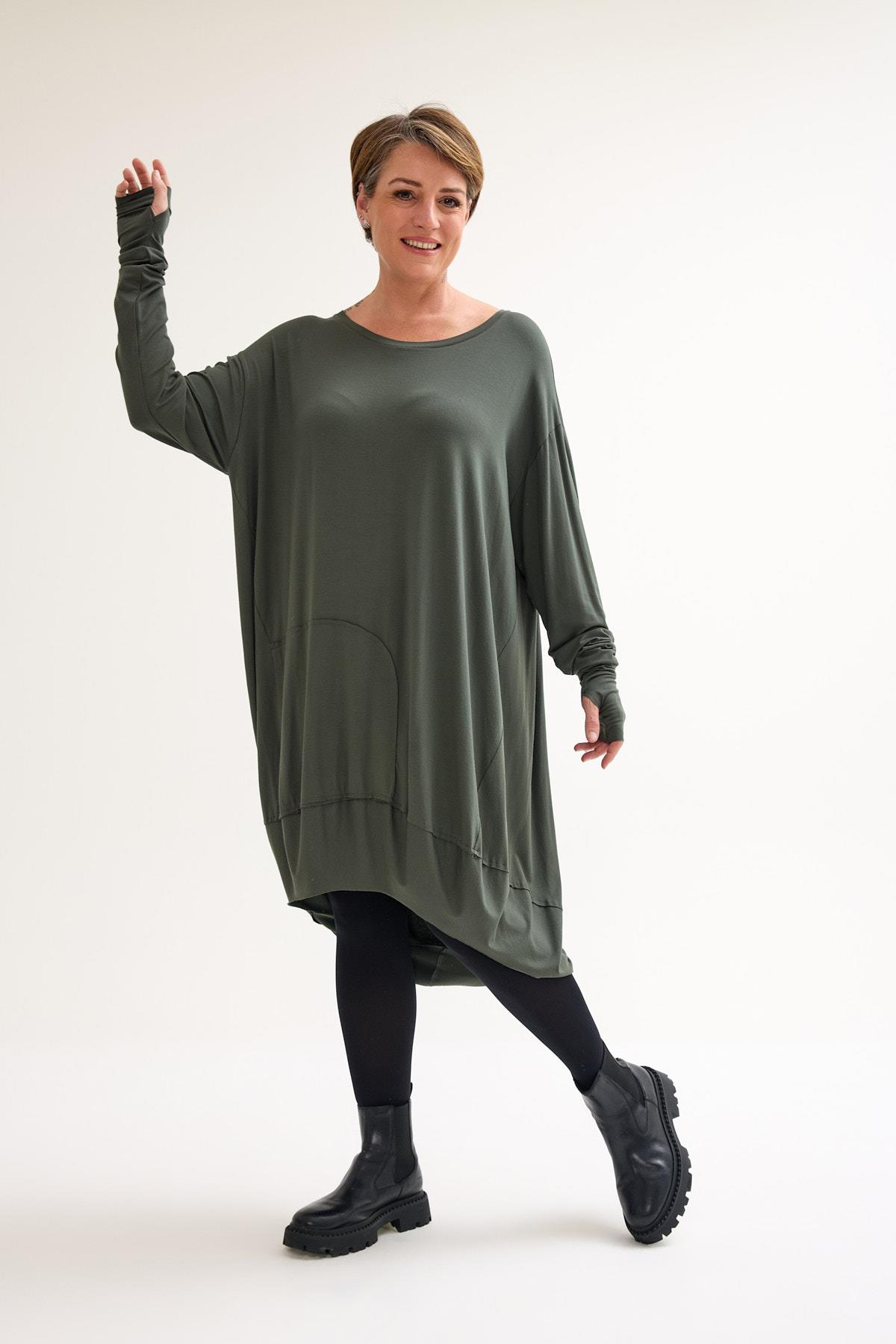 Round neck viscose dress tunic with thumb-hole detail, high-low hem, and stretchy fabric, versatile for both everyday and elevated styling.