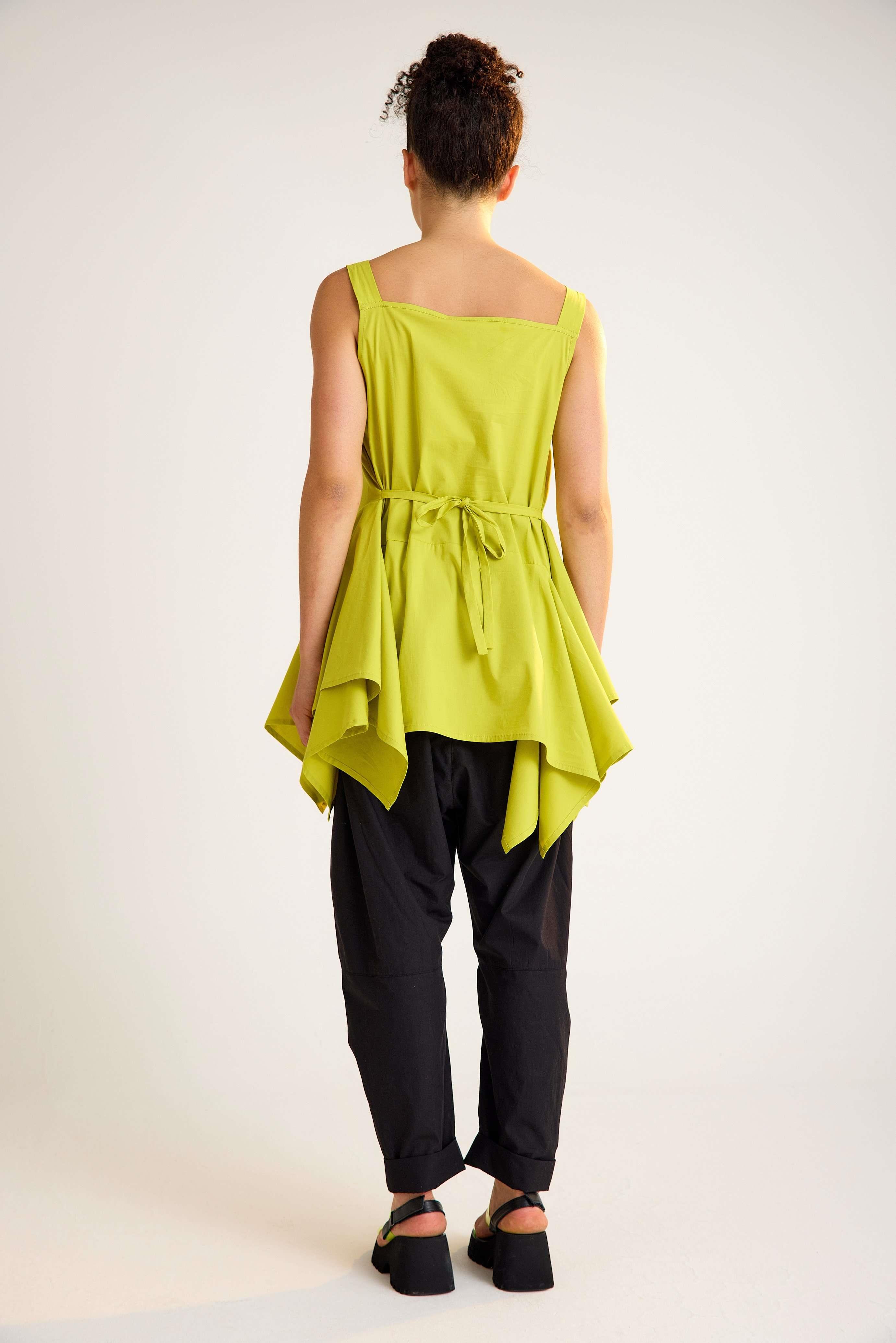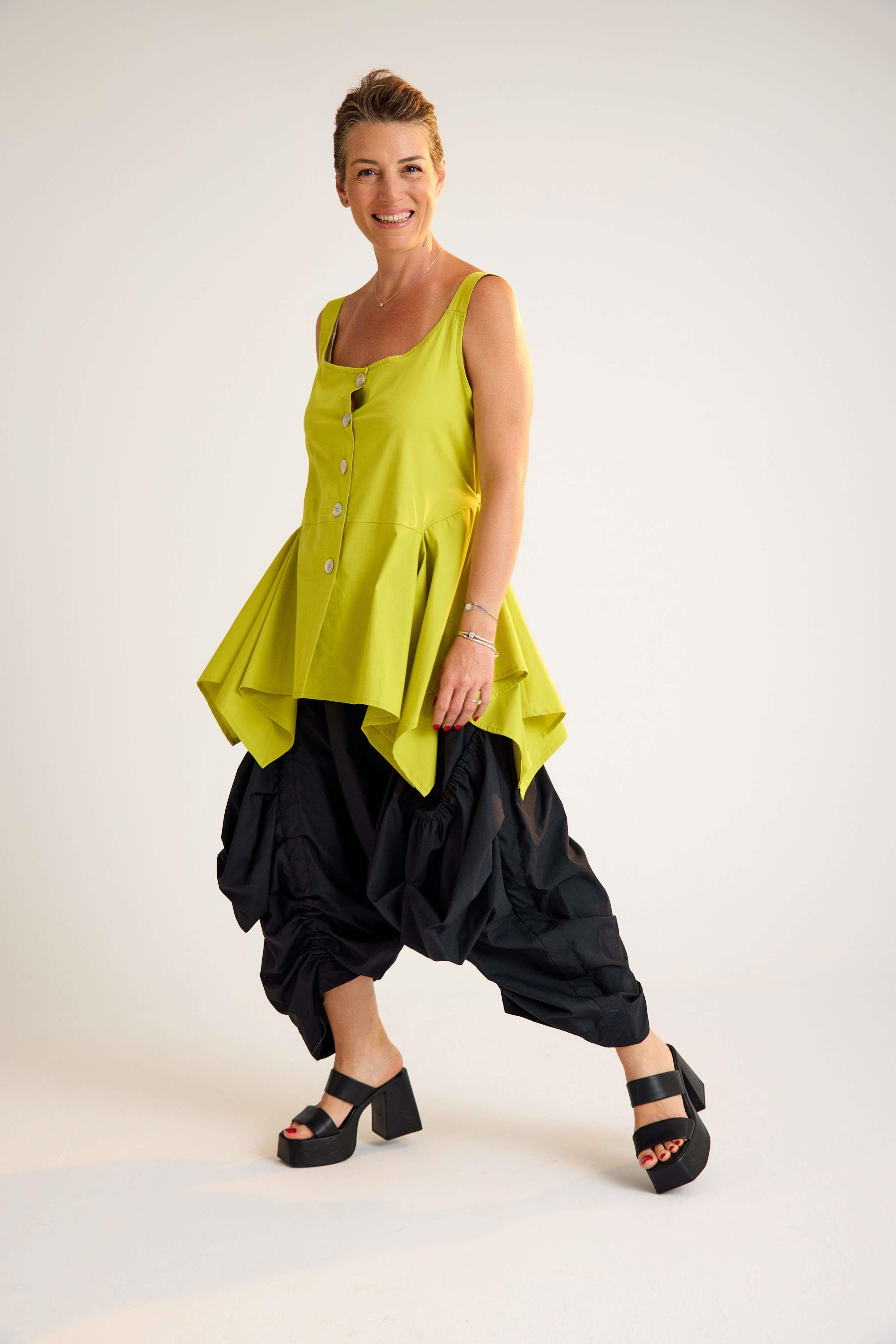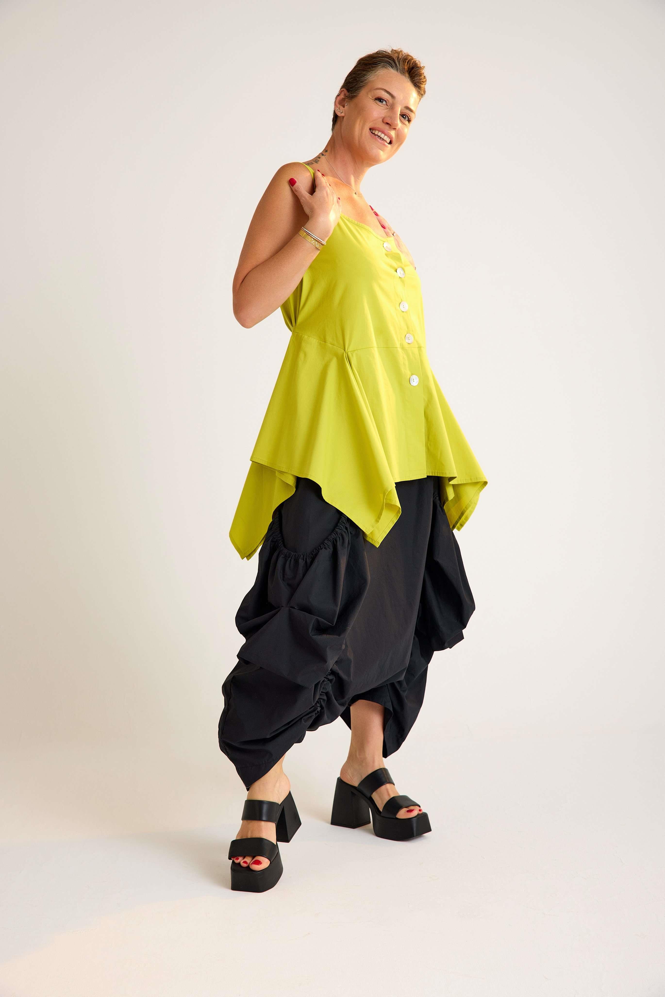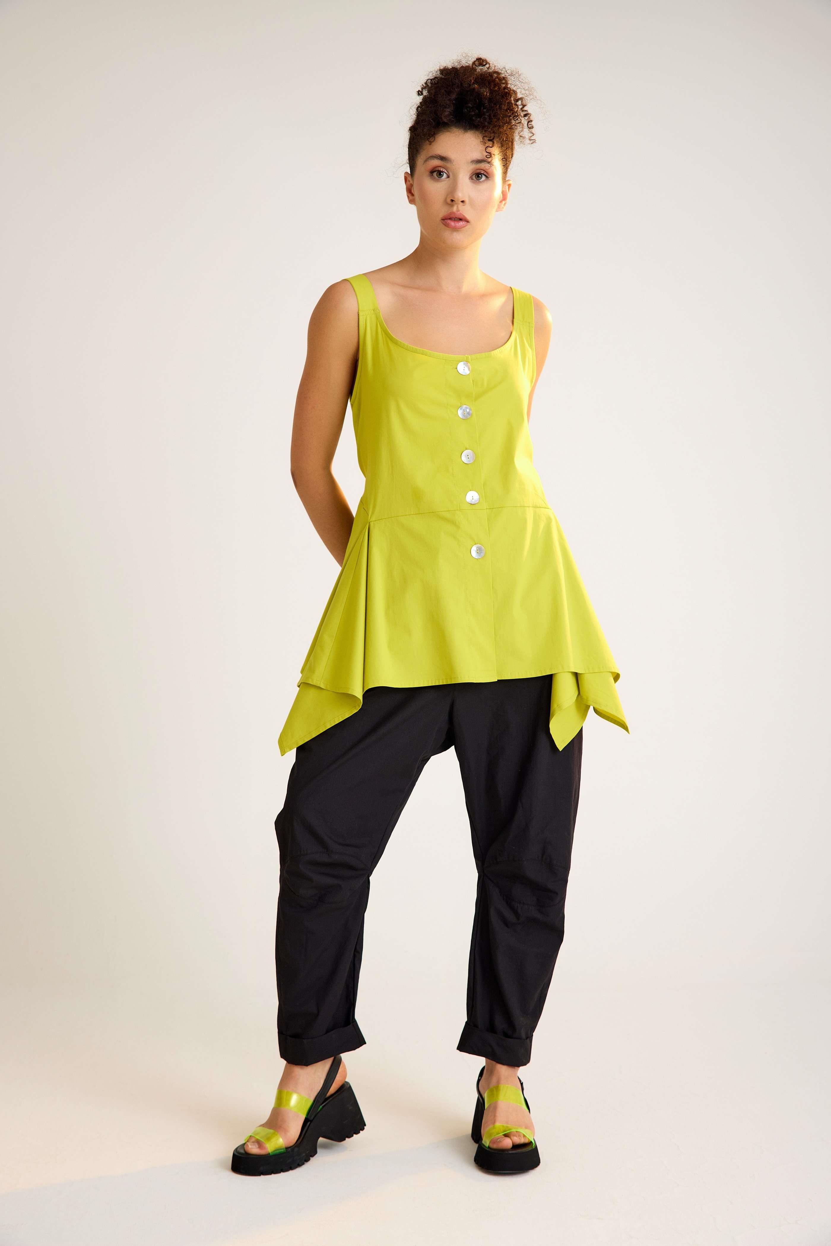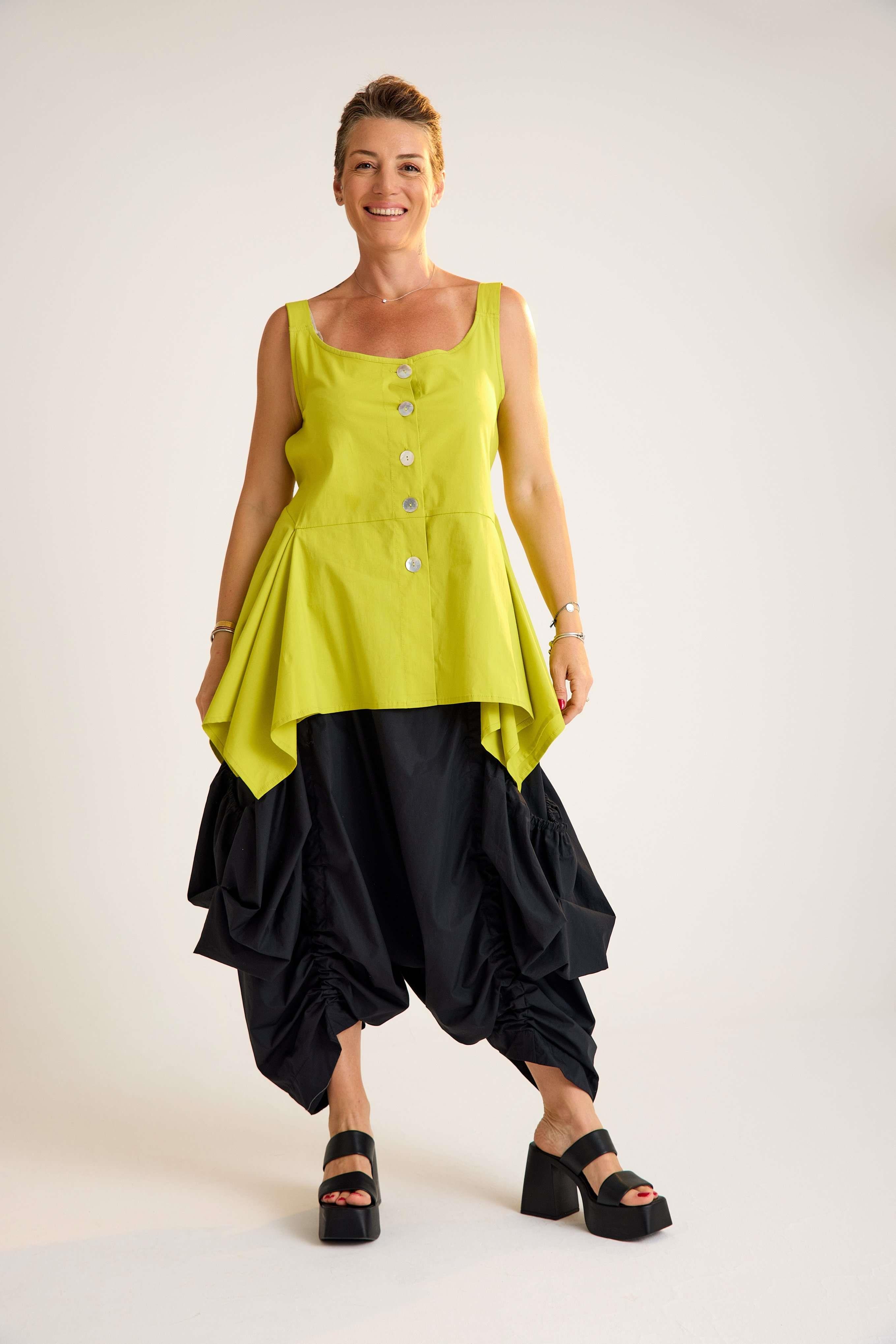 Sleeveless cotton tunic with elegant mother-of-pearl buttons and a flared, flowing hemline. A versatile piece that blends casual ease with refined detail.