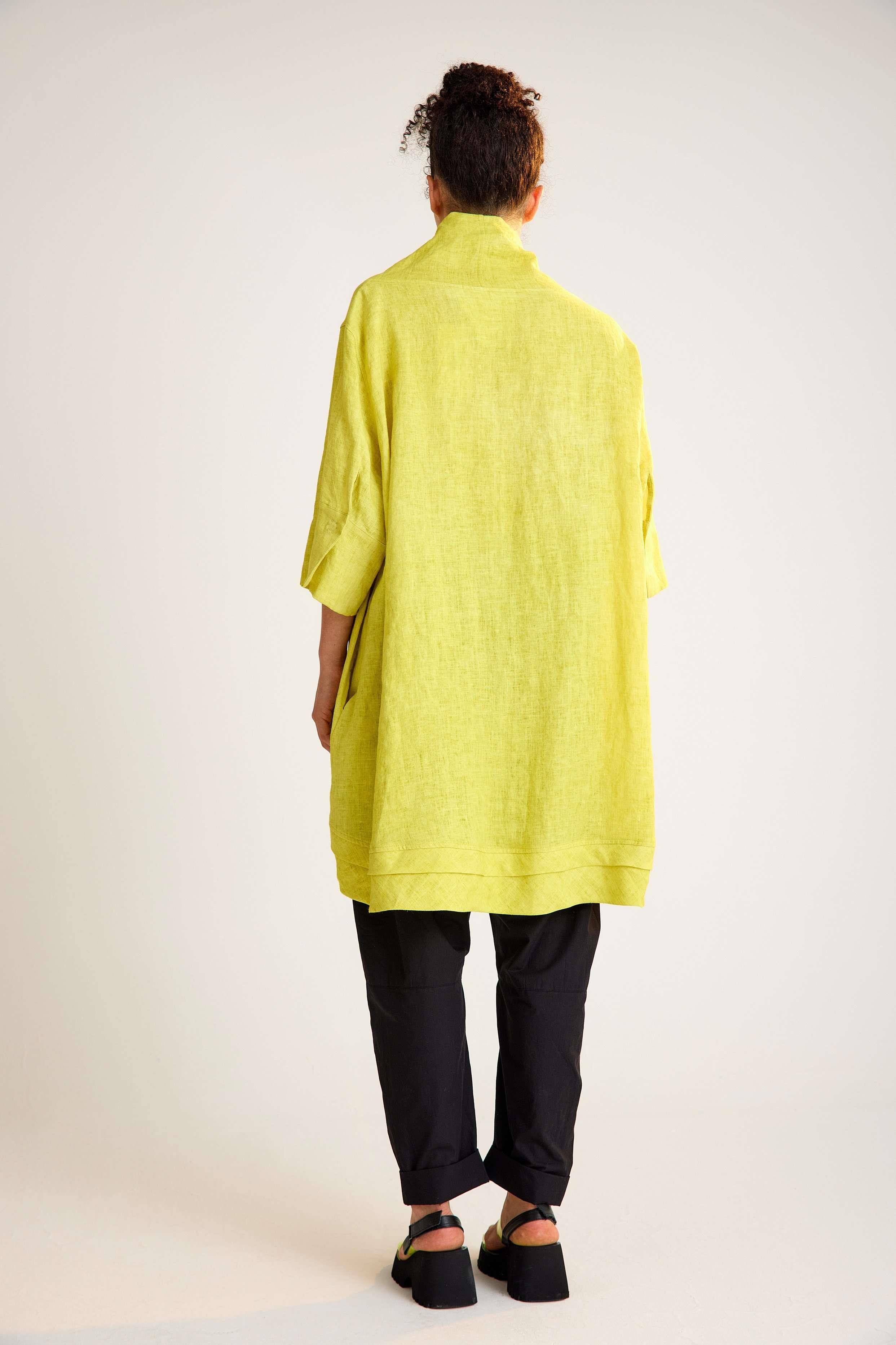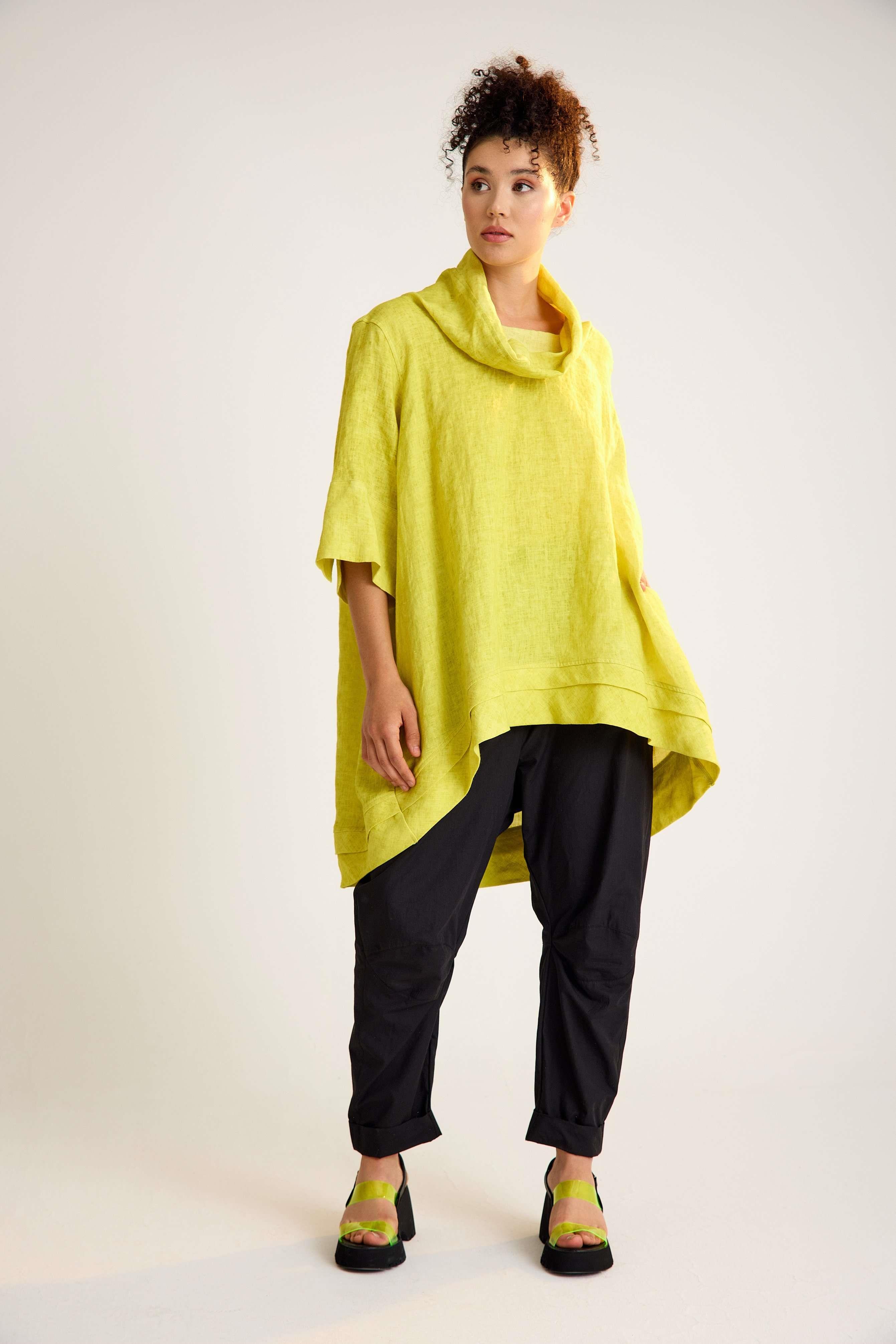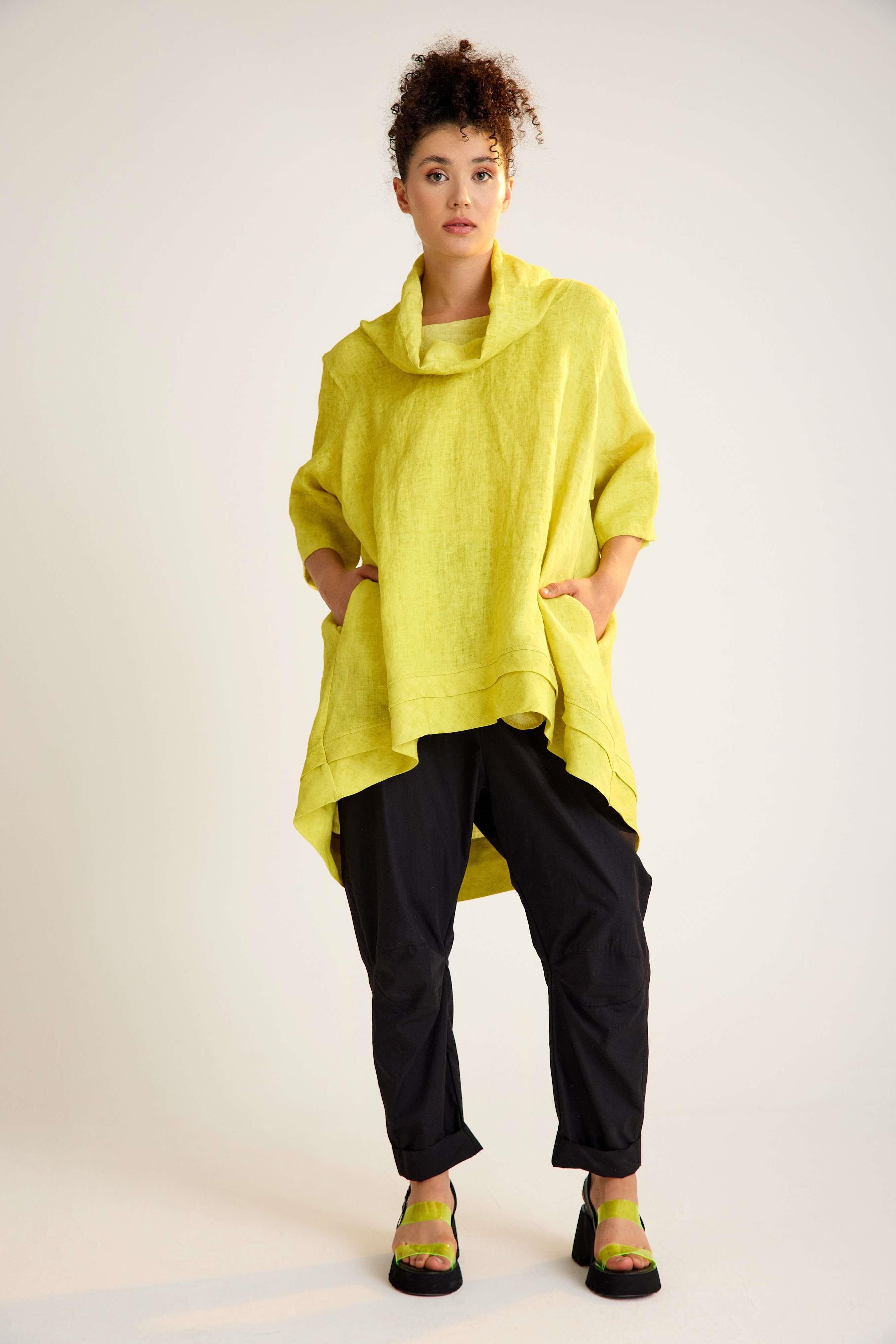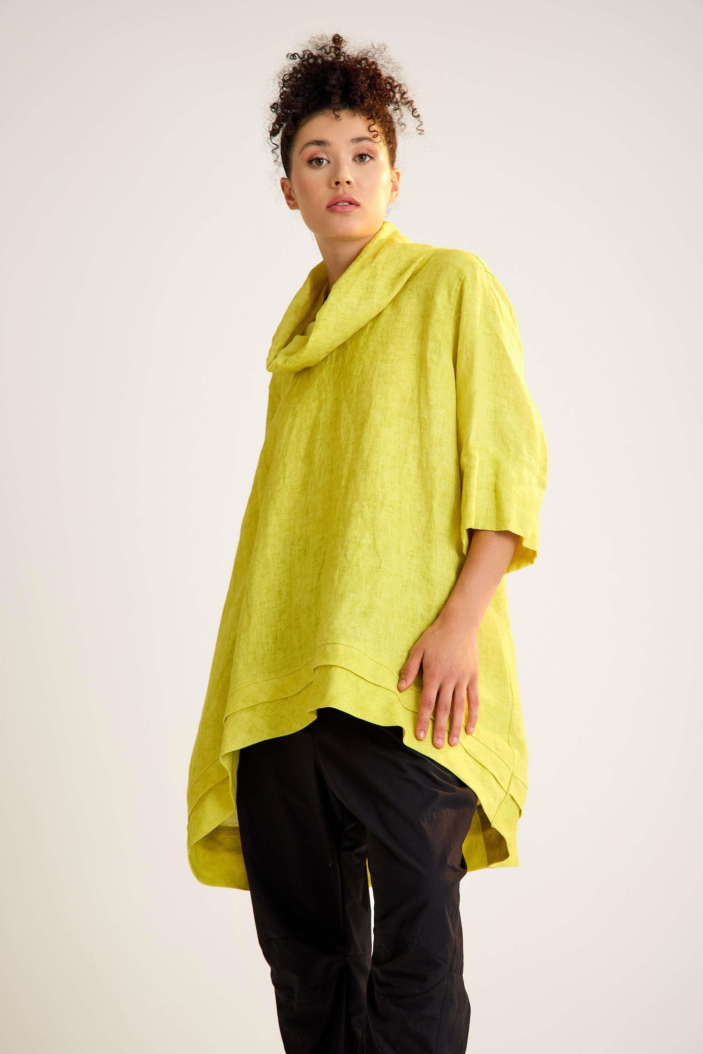 Oversize Linen Tunic – Asymmetrical, Relaxed, Contemporary This oversize linen tunic features raglan three-quarter sleeves and a distinctive high-low cut, shorter at the back and longer at the front. Designed with a fold-over low neckline and detailed hemline, it creates a flowing silhouette that’s both modern and effortless. Crafted from 100% linen with a distressed finish, the tunic drapes naturally while remaining breathable and lightweight. Its relaxed fit and asymmetrical structure make it versatile for casual layering or statement styling. Key features: Raglan three-quarter sleeves Fold-over low neckline Asymmetrical high-low hemline with detailing Relaxed oversize cut 100% linen, breathable and textured A contemporary piece that blends artisanal detail with everyday comfort — perfect for timeless summer and transitional looks.