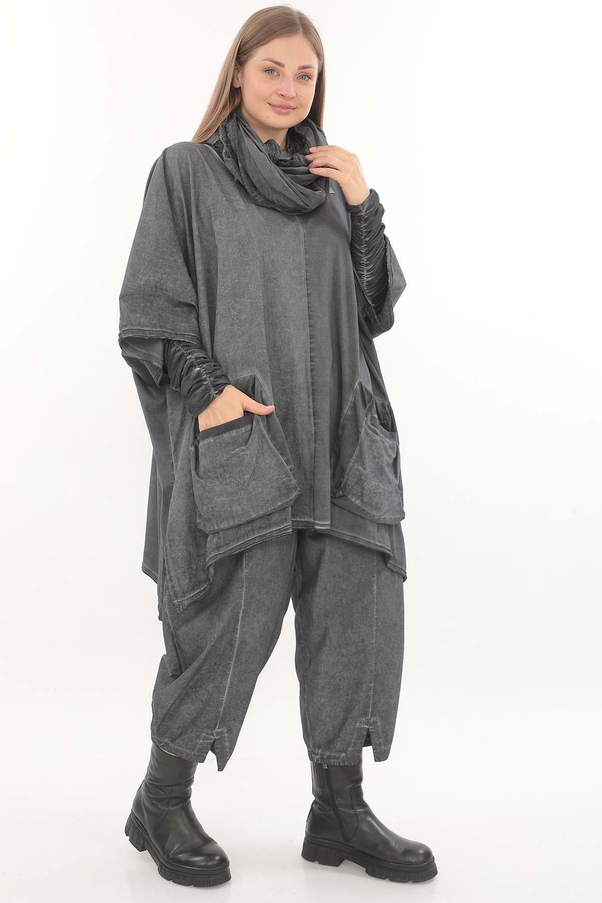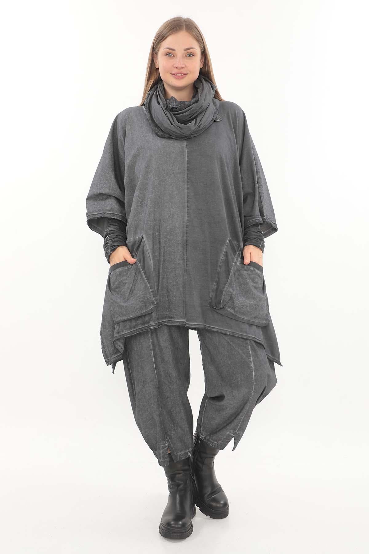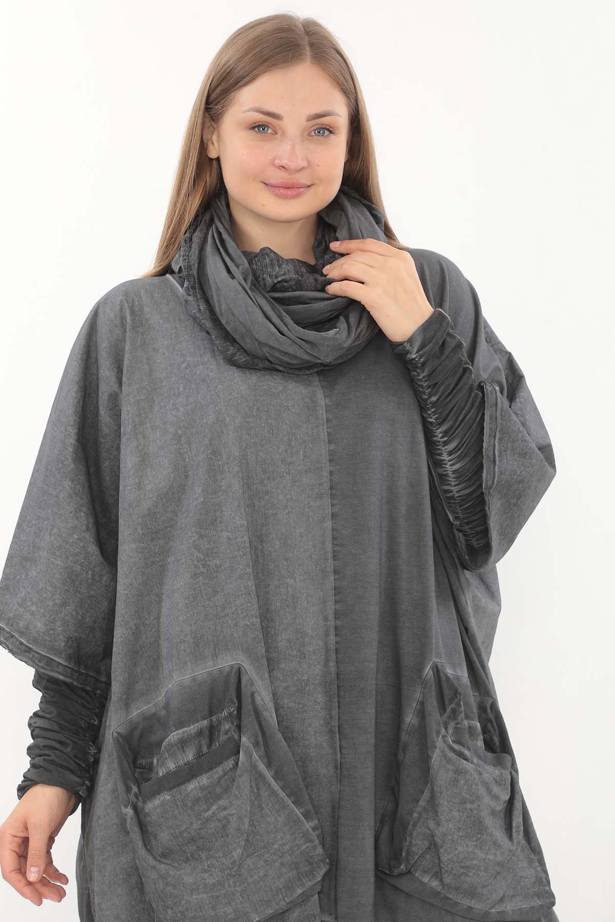Oversized Washed Cotton Tunic with Batwing Sleeves and Matching Accessories This washed cotton tunic features a relaxed oversized silhouette with dolman-style batwing sleeves and two large patch pockets. Designed with raw edge detailing and subtle asymmetry for an avant-garde look, it comes as a three-piece set complete with a detachable neck warmer and cuff accessories that can be styled separately.
